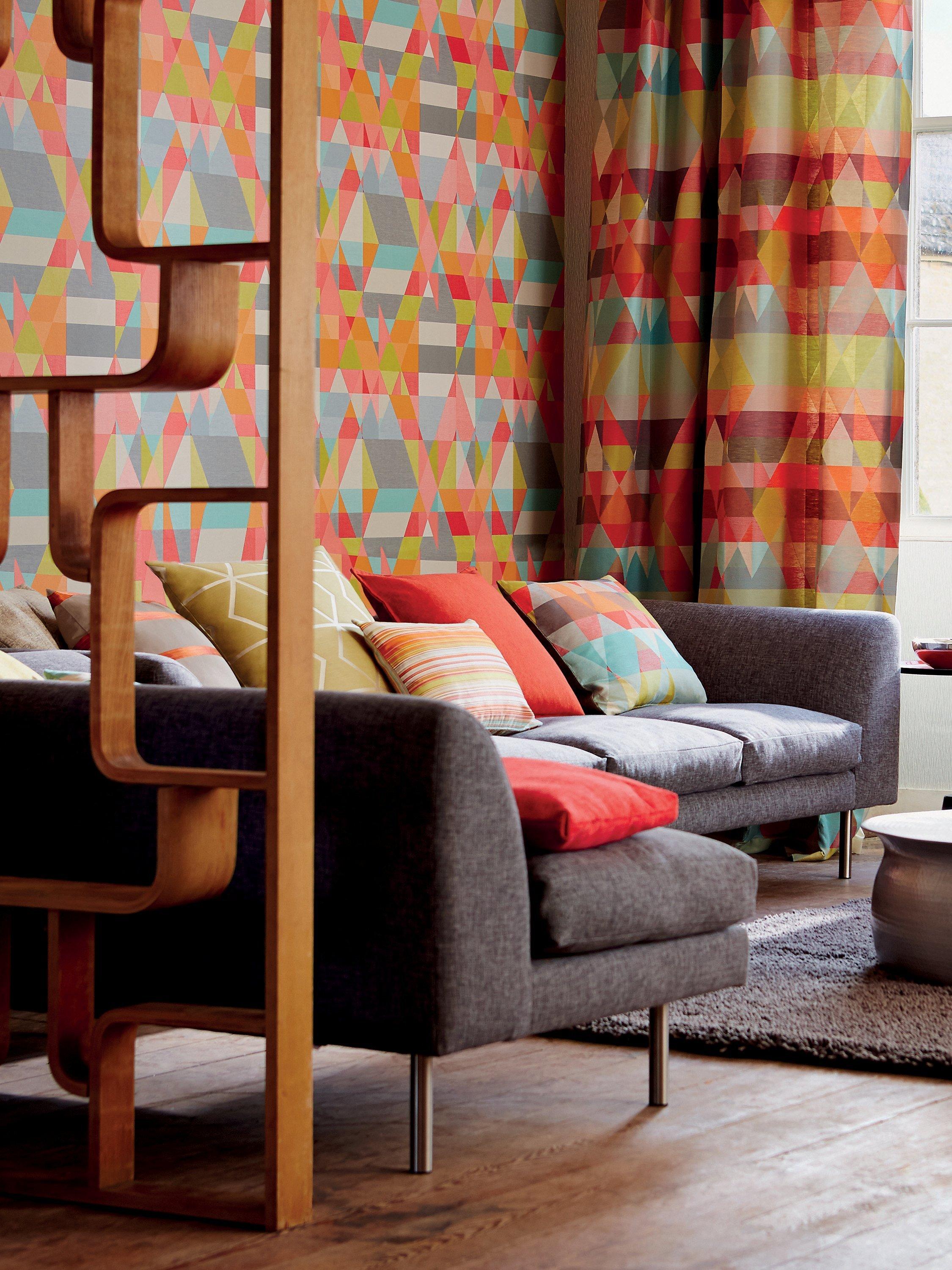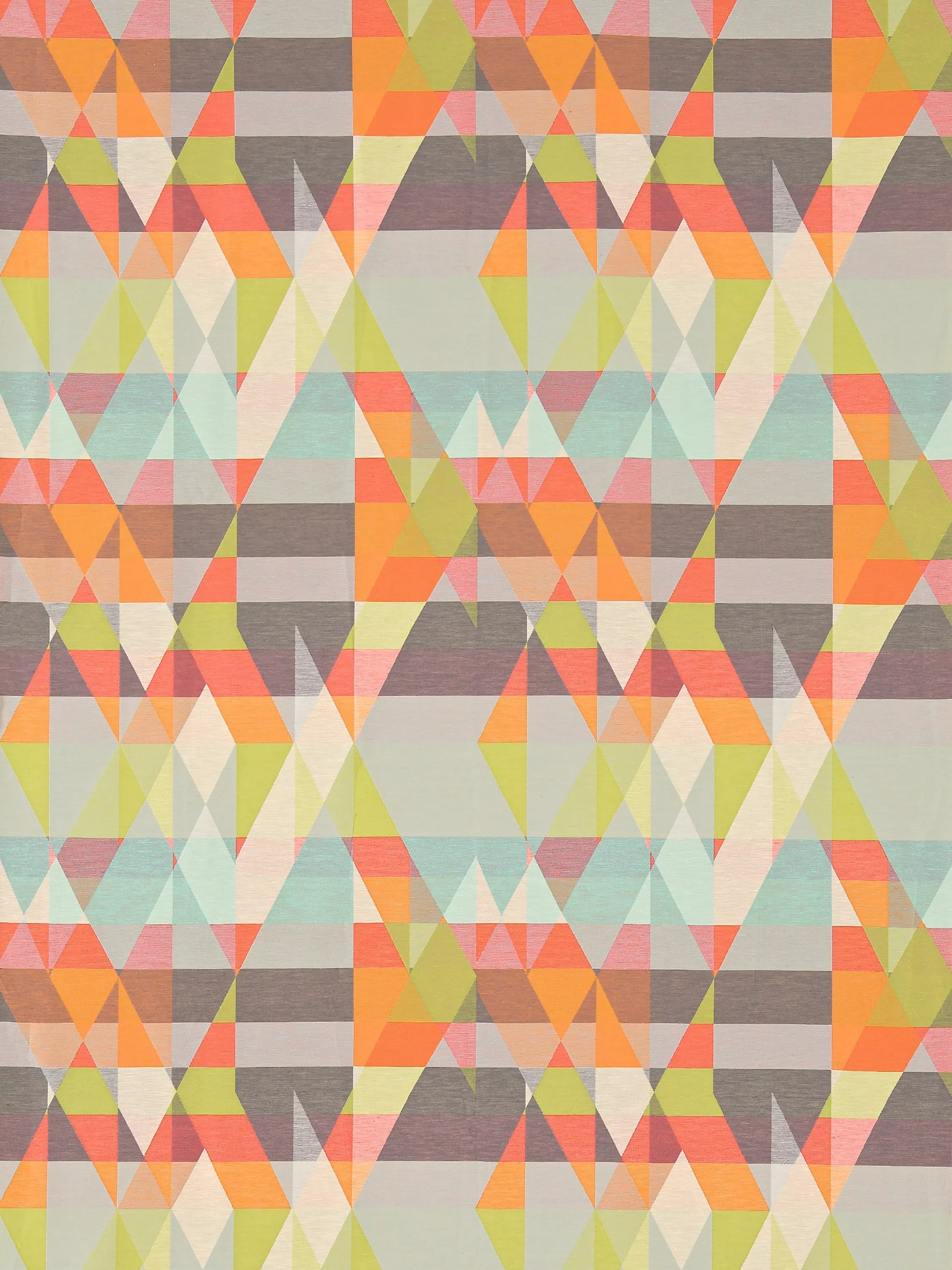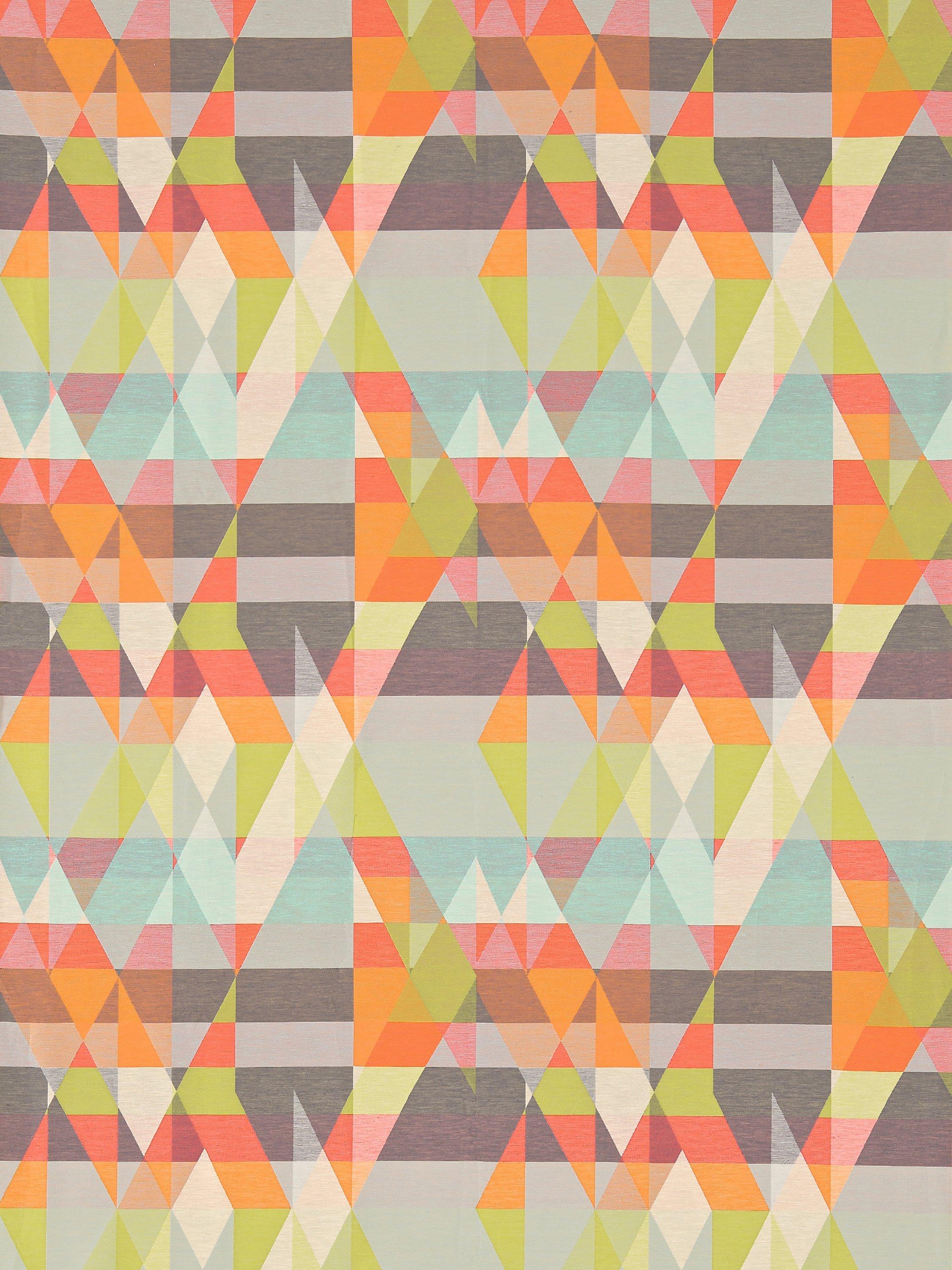 From Scion, Axis is a cotton blend fabric that uses a kaleidoscopic mix of geometric shapes and colour clashes to create a bold geometric design.