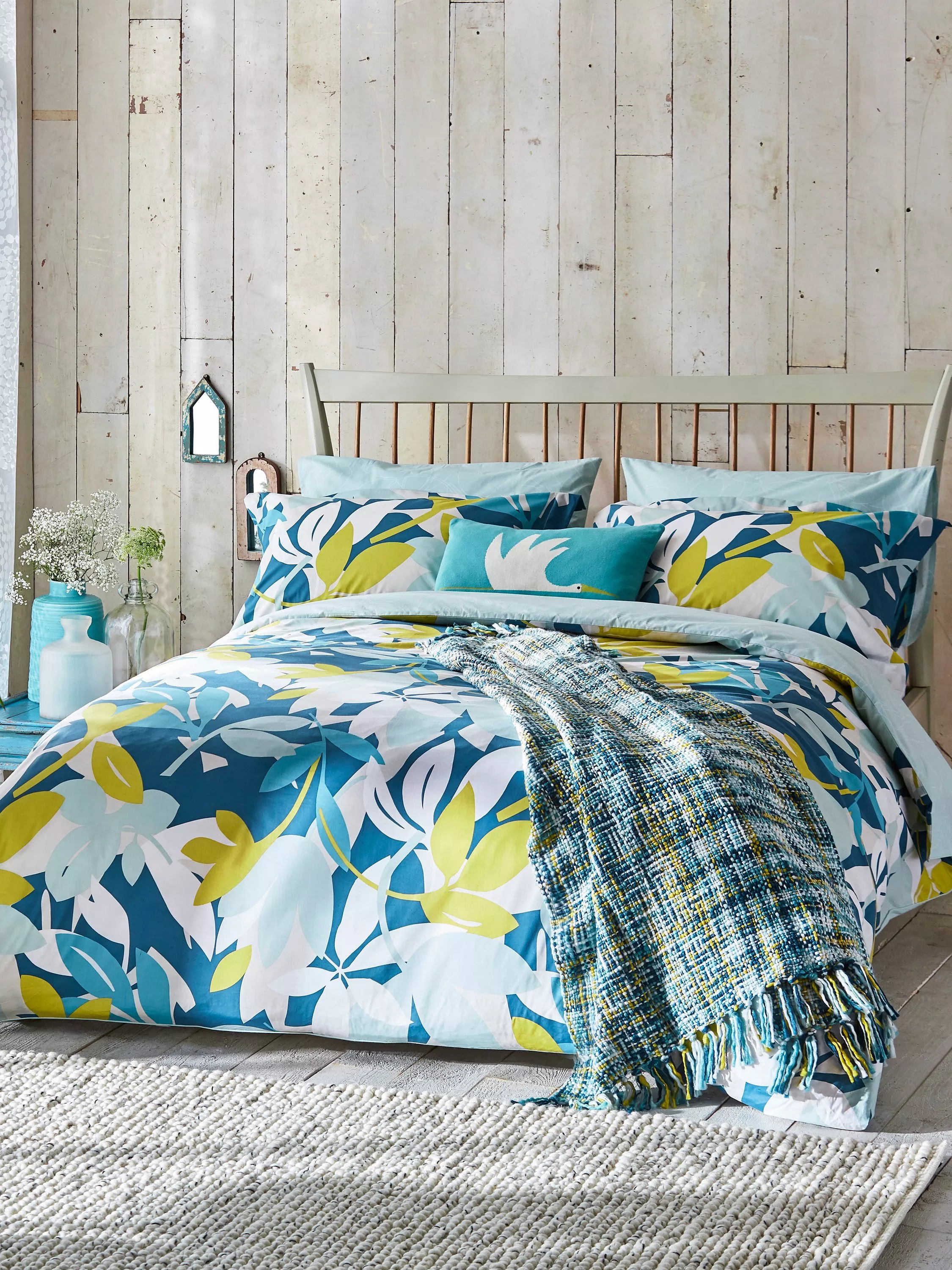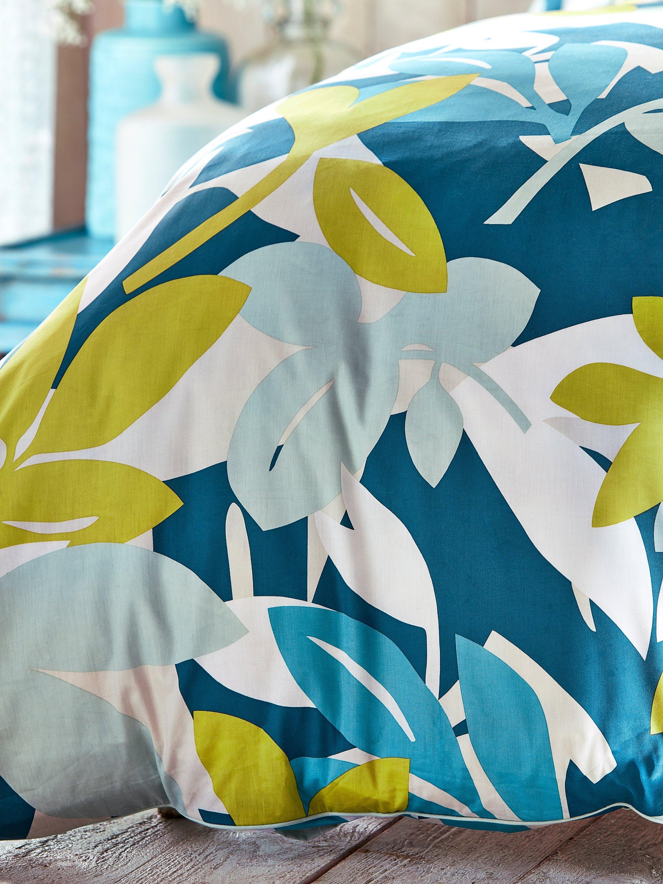 This bold leaf print will brighten your mood no matter what time you have to get up in the morning. A cool, plain blue is featured on the reverse.