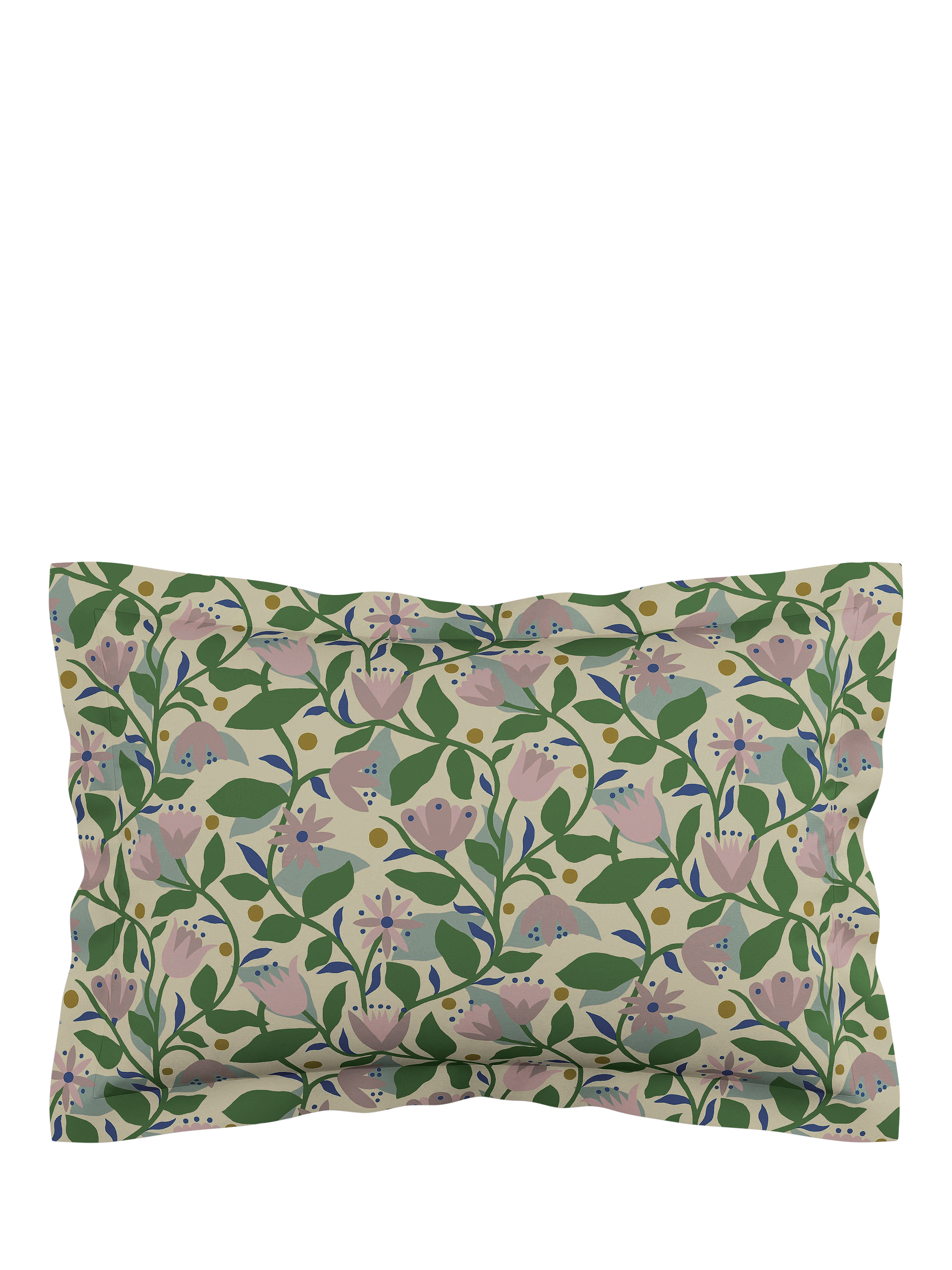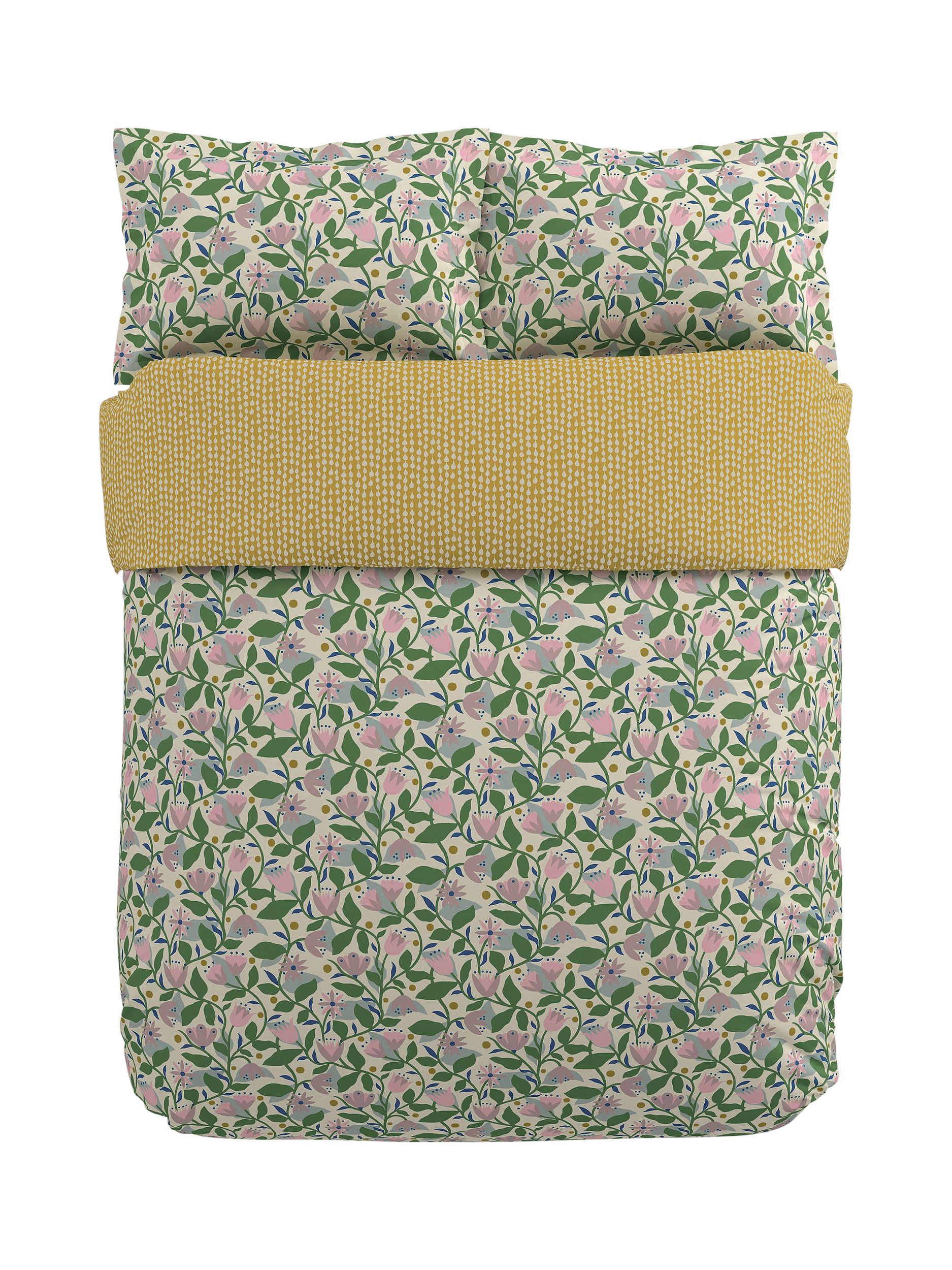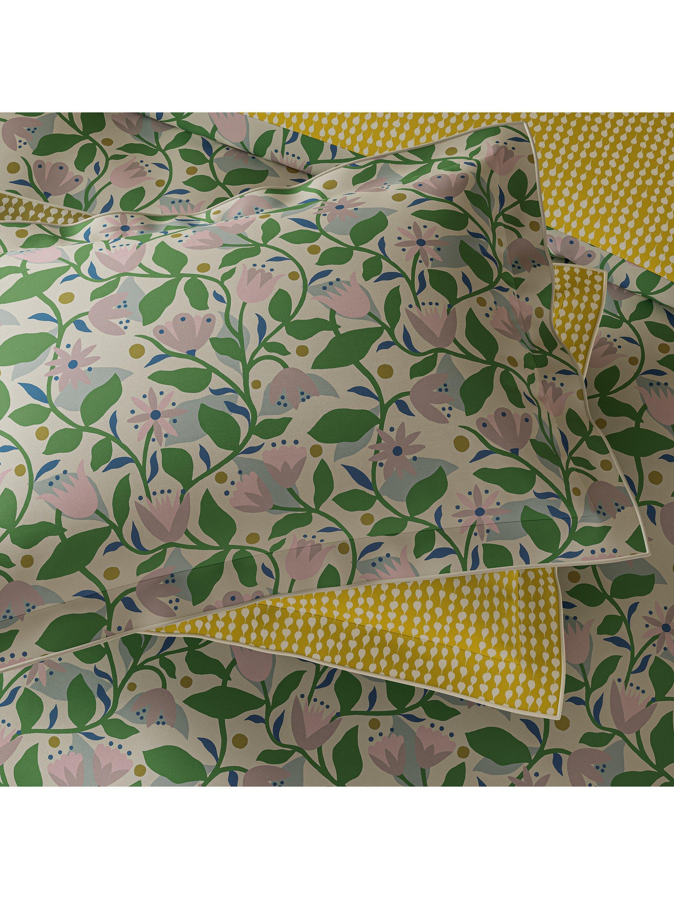 Fresh and fanciful, Dancing Daises is a bed set that sings with joy with its happy tulips and sprawling trellises. Designed with nods to Scandi minimalism, woodblock printing, and the Arts and Crafts movement, find on the reverse the Folly design, a grounding woodblock style pattern in soothing honey hues.