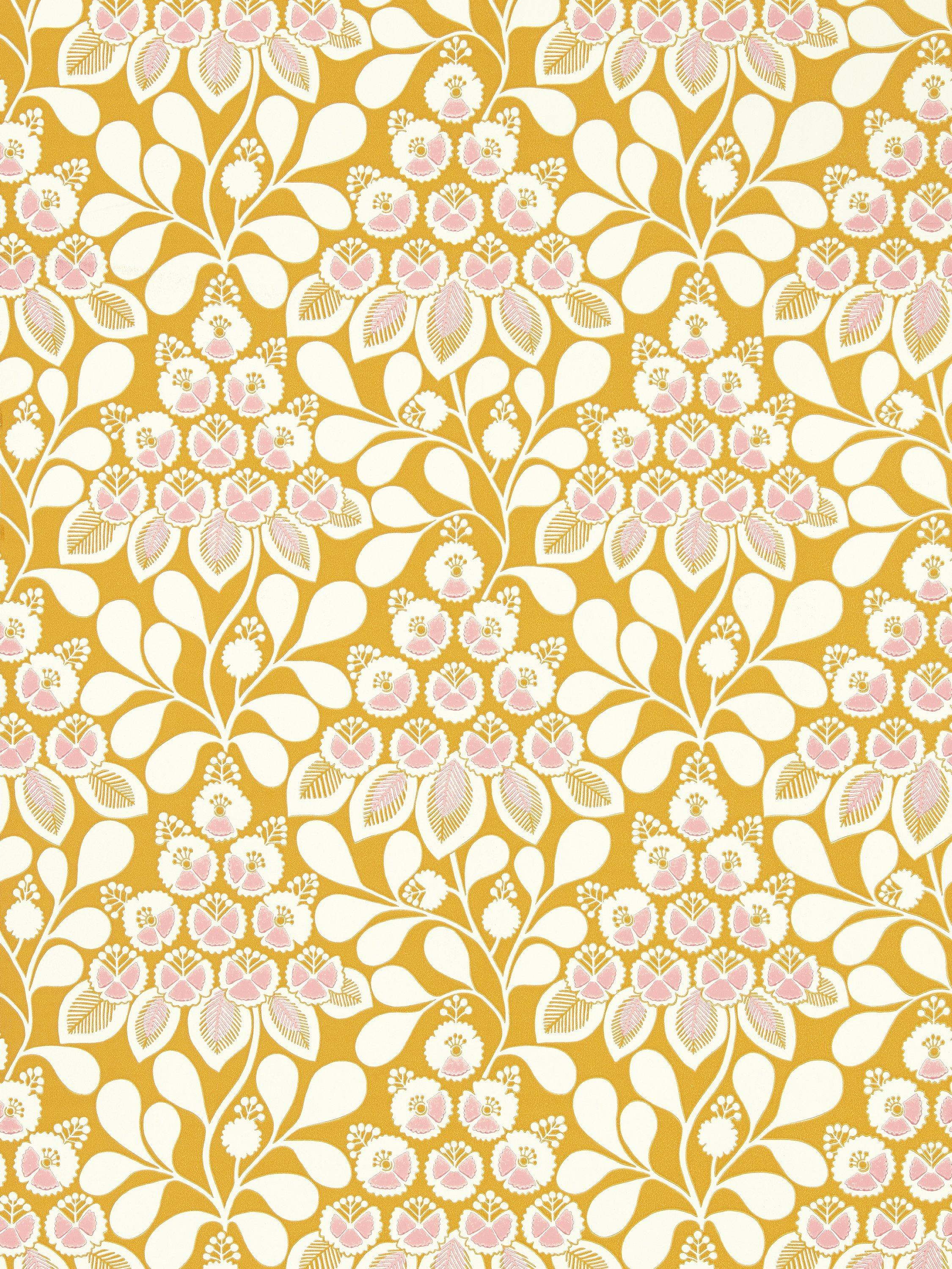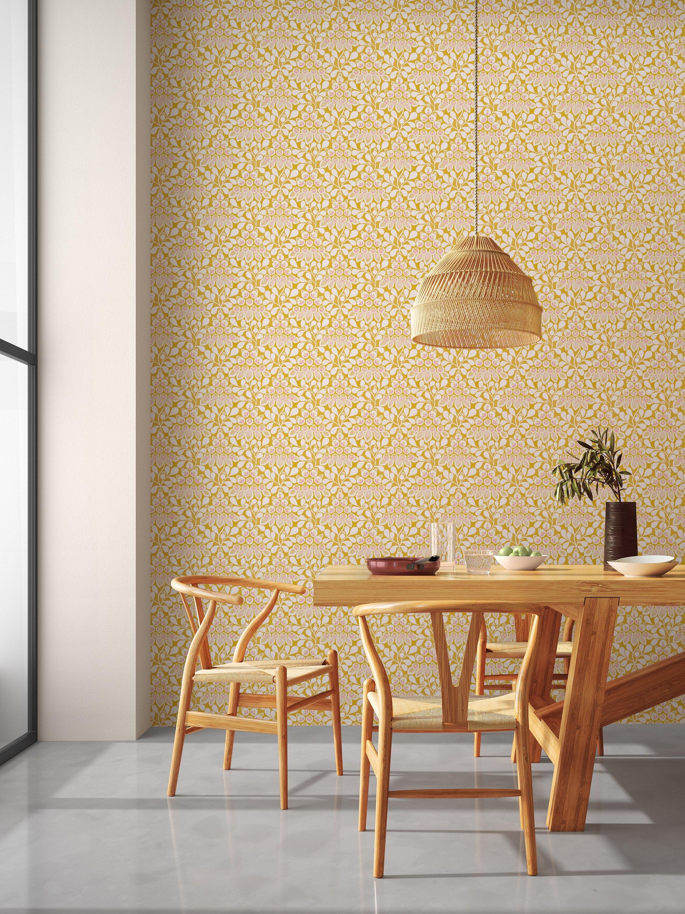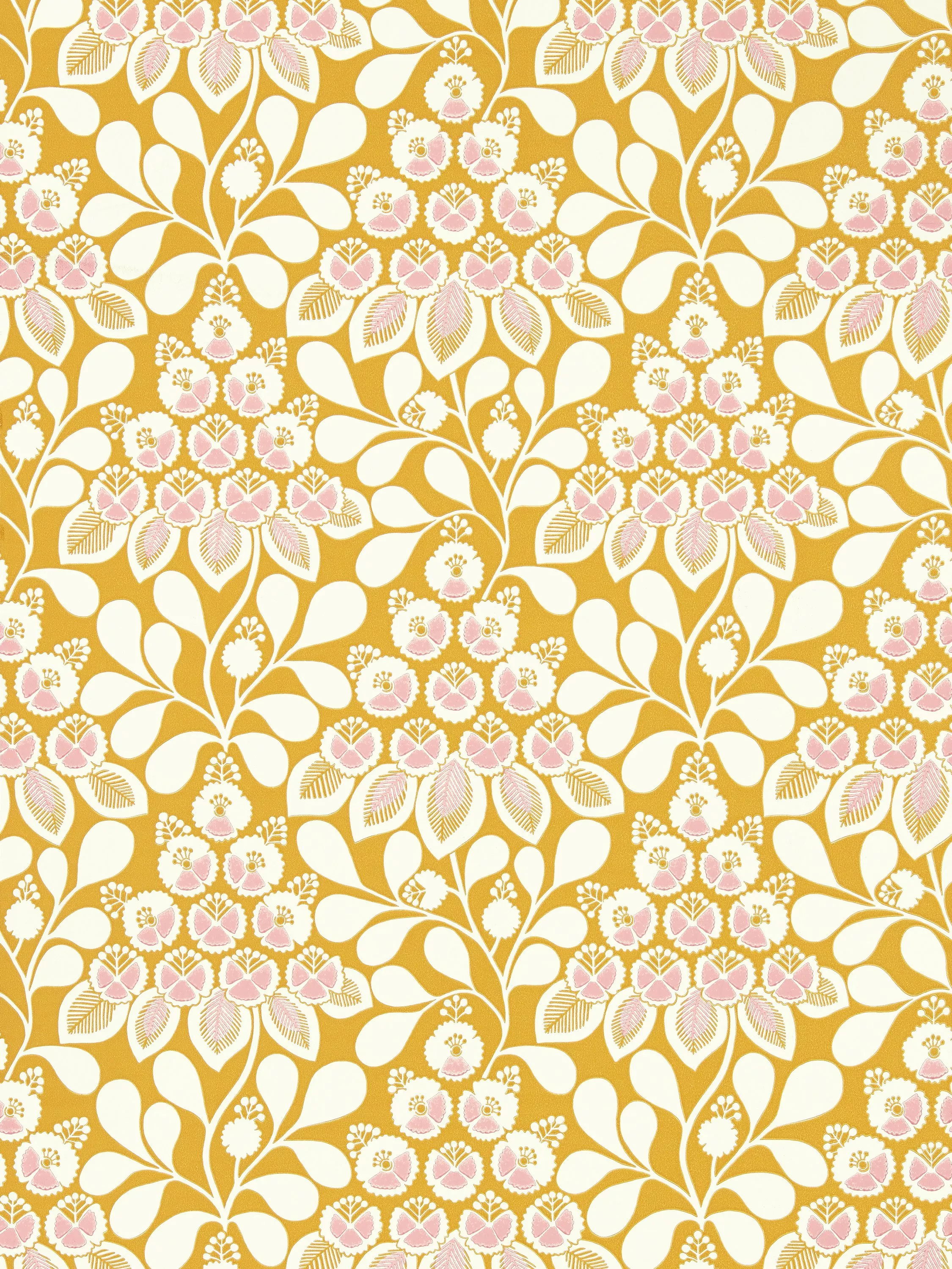 In a joyful sunshine yellow, with highlights of blush pink, Elsa is Scion's take on a classic Arts & Crafts pattern. Surface printing gives a lovely chalky finish to this decorative wallpaper of cheerful flowers, with scalloped edge detail.