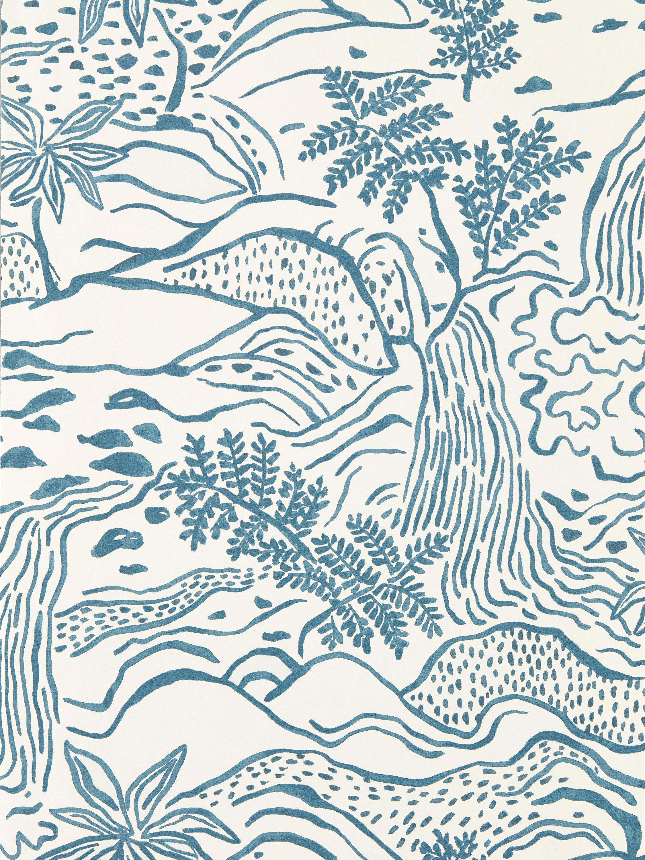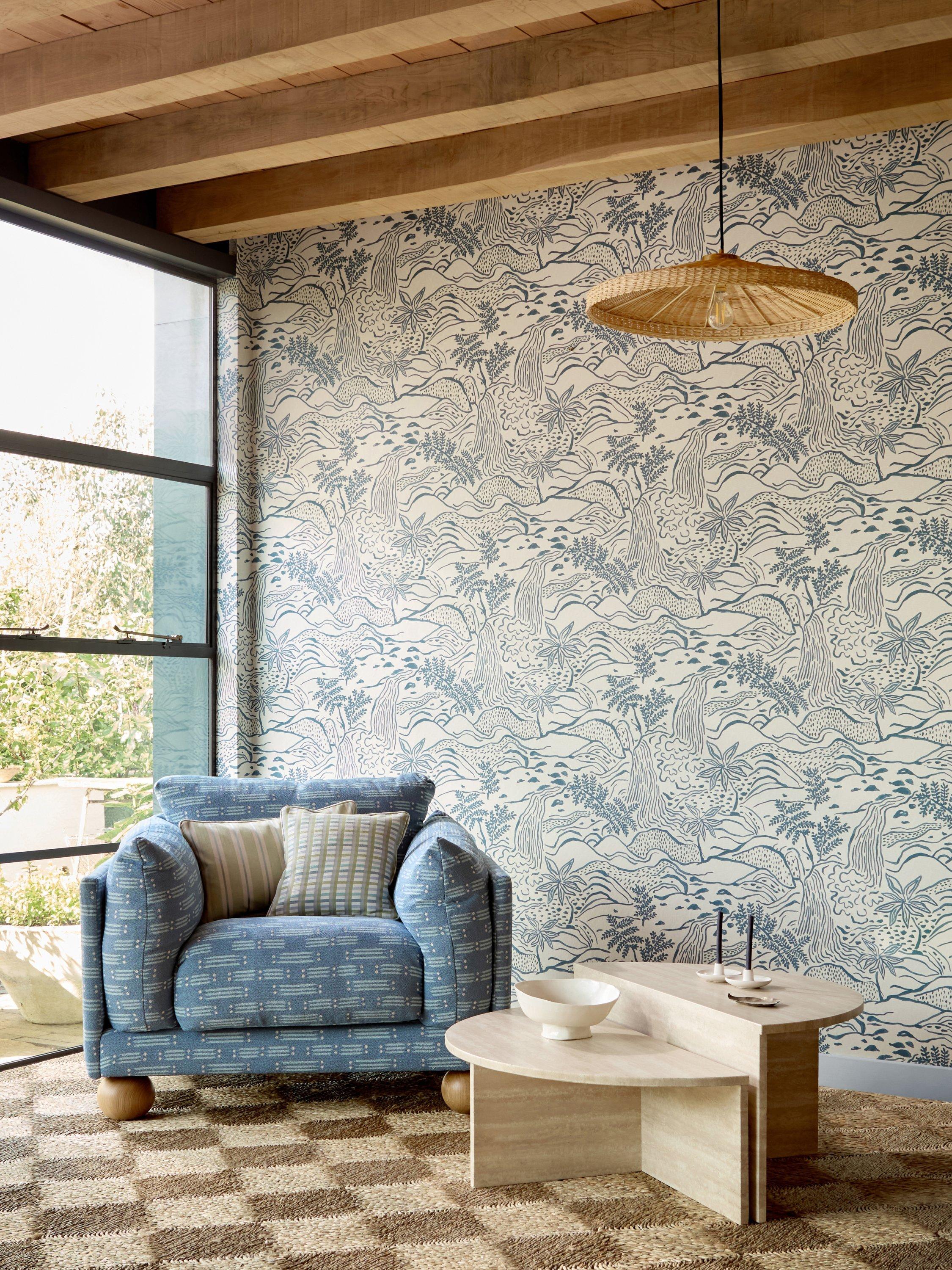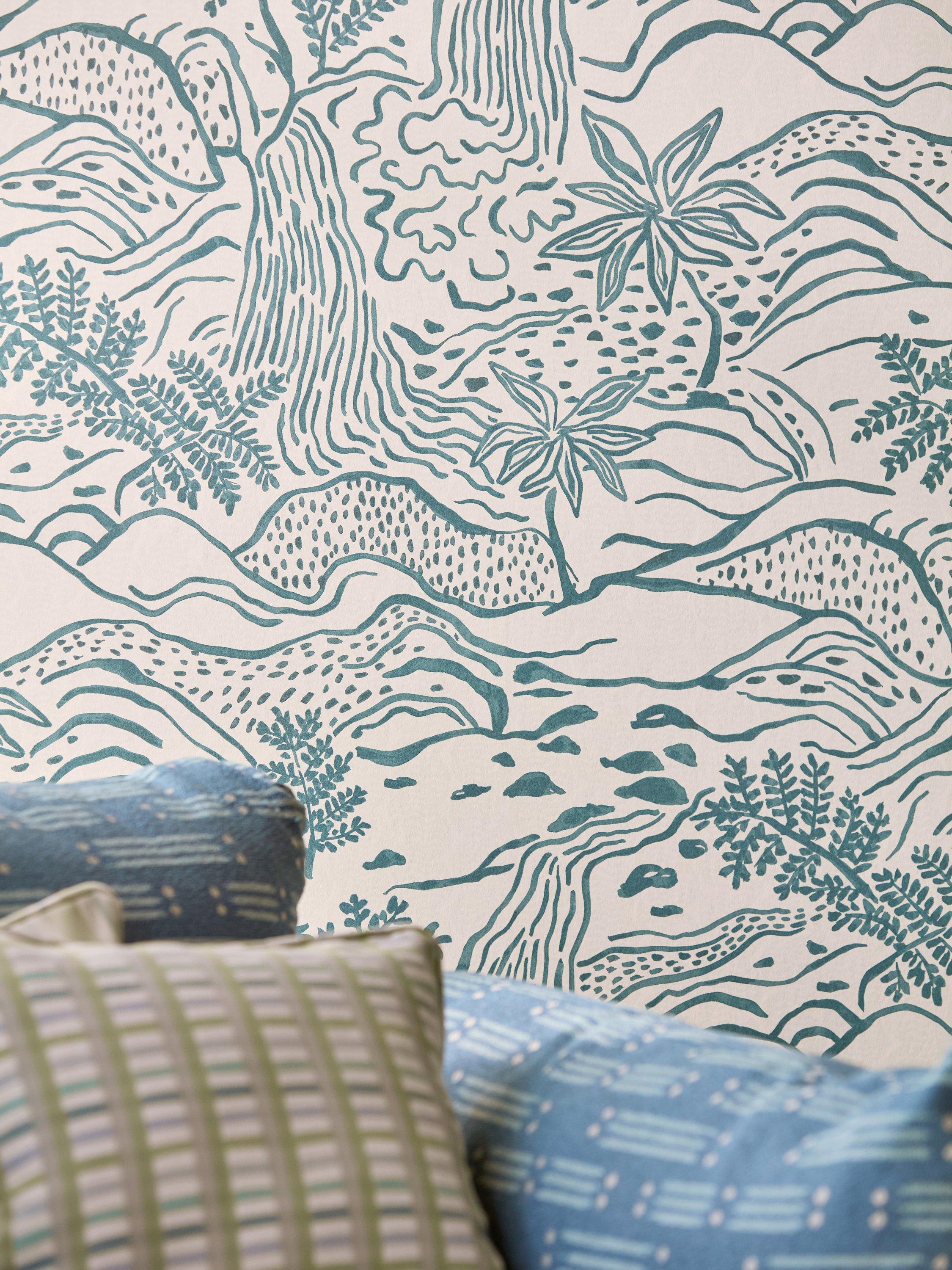 Taken from an original artwork designed for a jacquard weave and translated into a large-scale scene, Falling Foss has been repainted to give it a mural landscape feel.