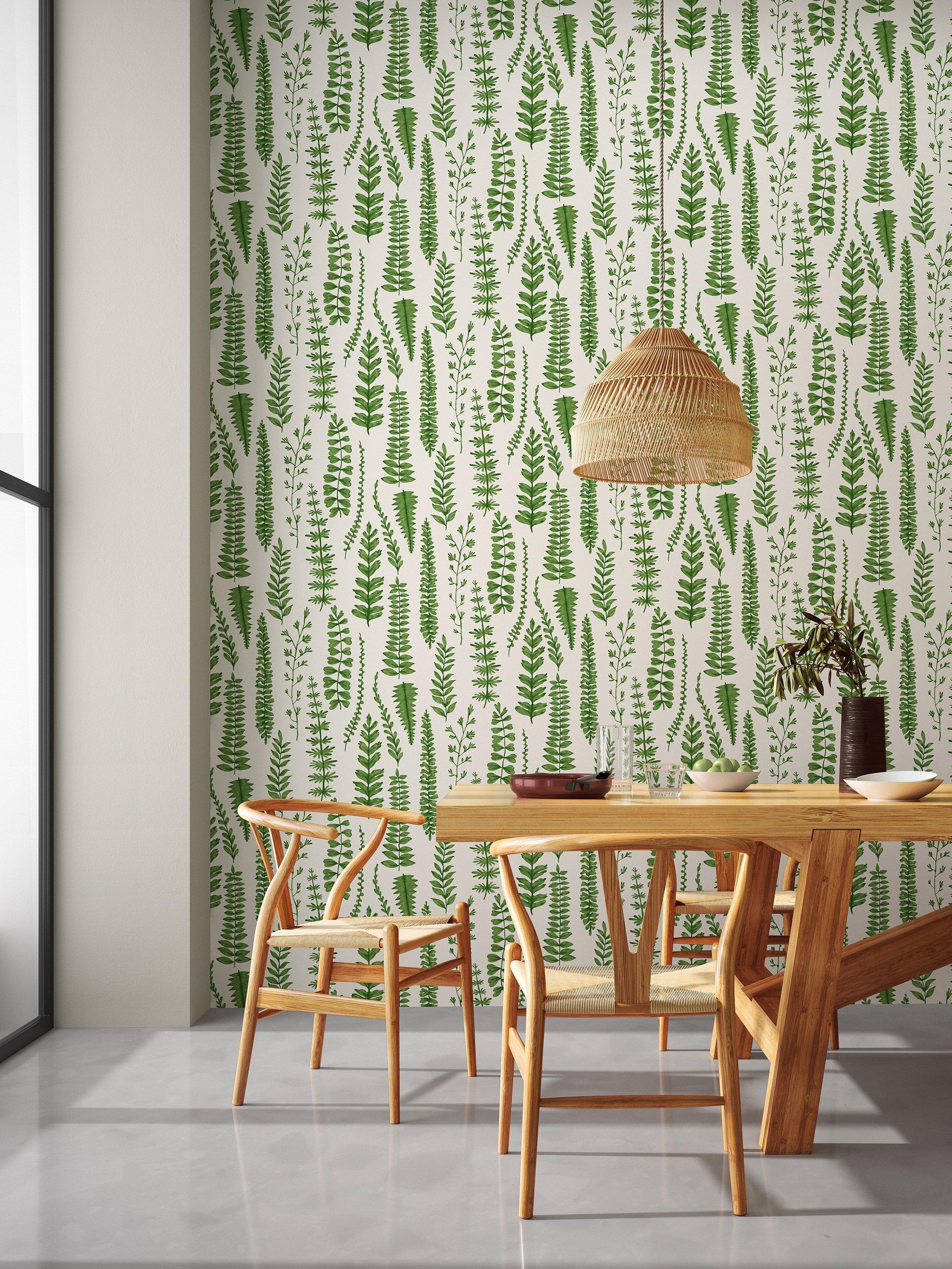 Richly coloured ferns on a neutral ground bring the outdoors in. A fabulous statement design to use throughout the home for a nature-inspired scheme.