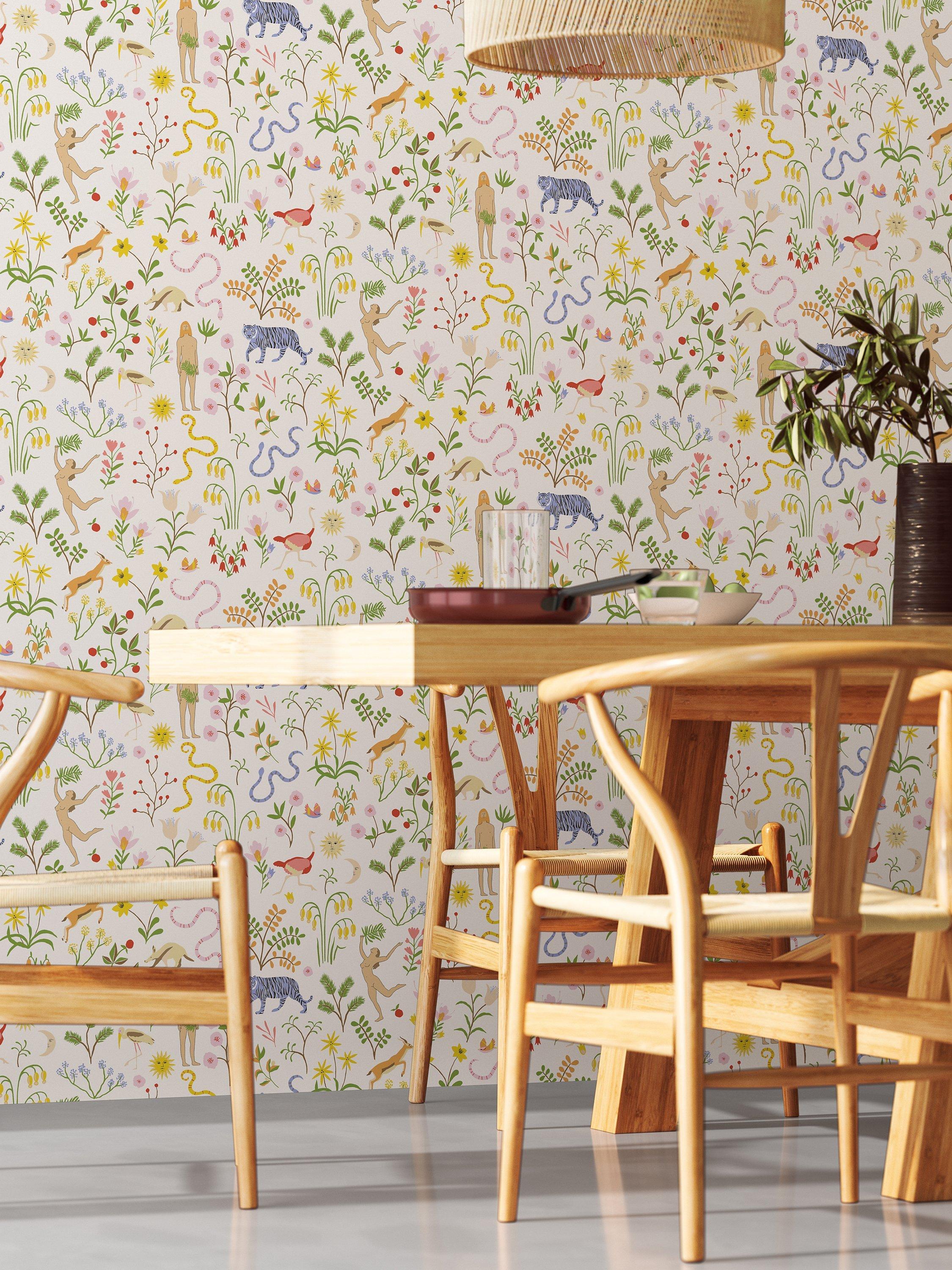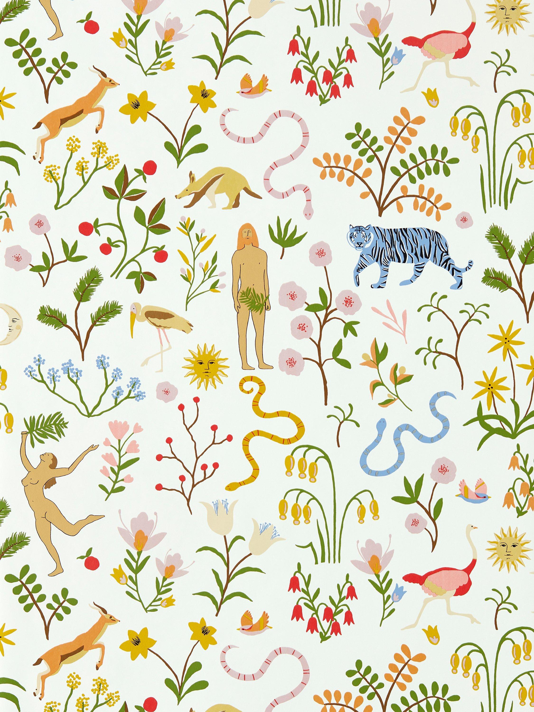 What temptations await in our Garden of Eden? An imaginative take on the story of creation, uninhibited characters frolic alongside playful animals and stylised botanicals.