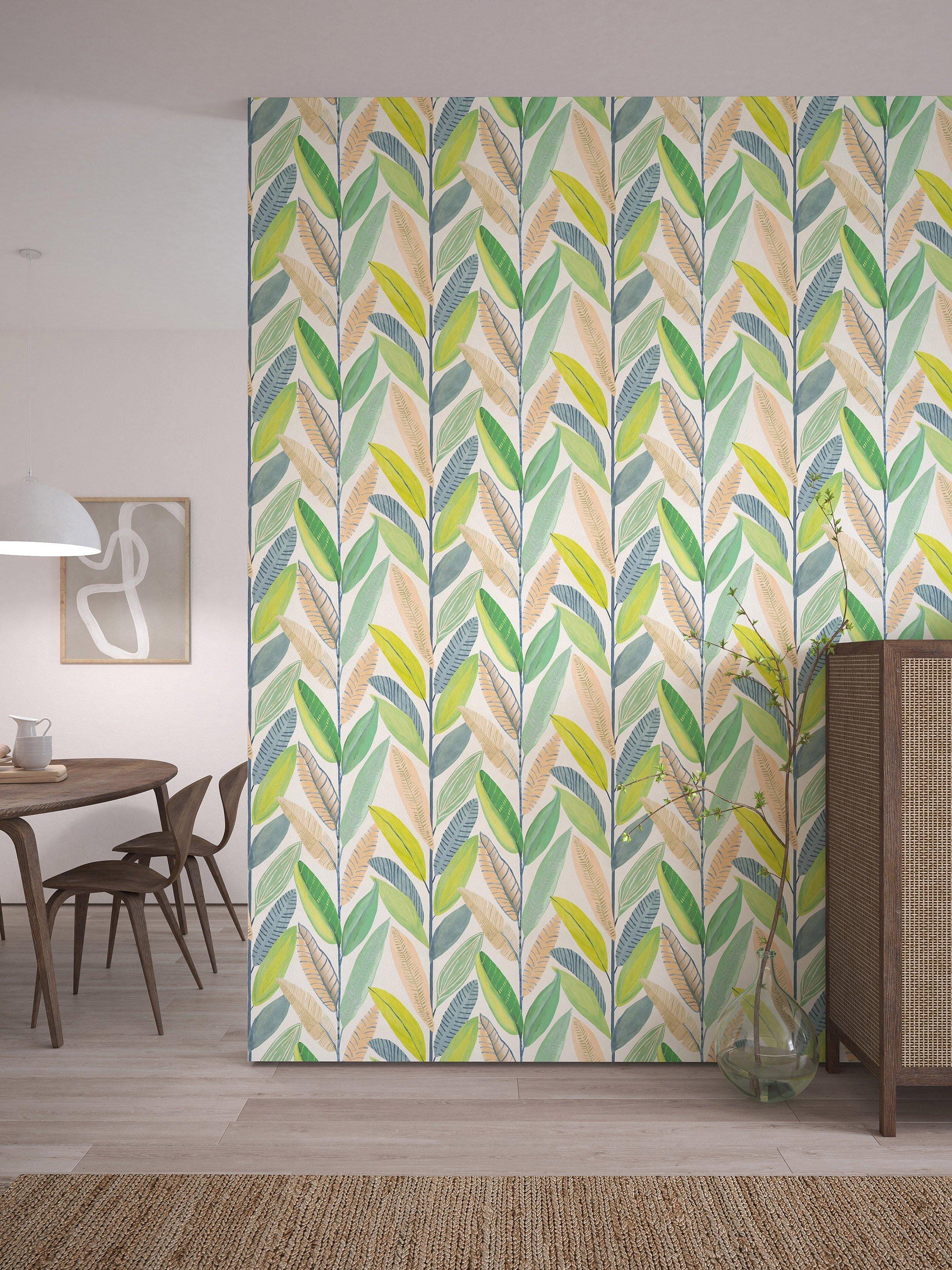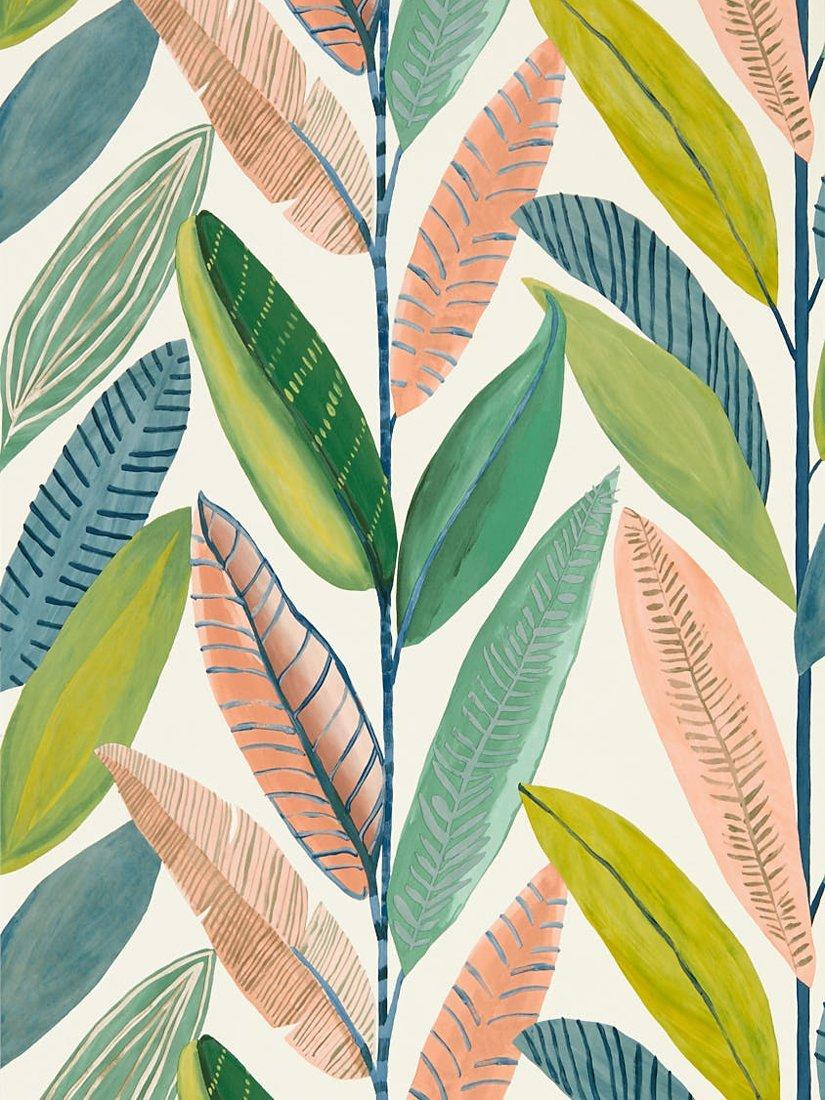 Named after one of Sri Lanka's palm-fringed beaches, painterly banana leaves overlap to create a soft stripe across this colourful Scion wallpaper.