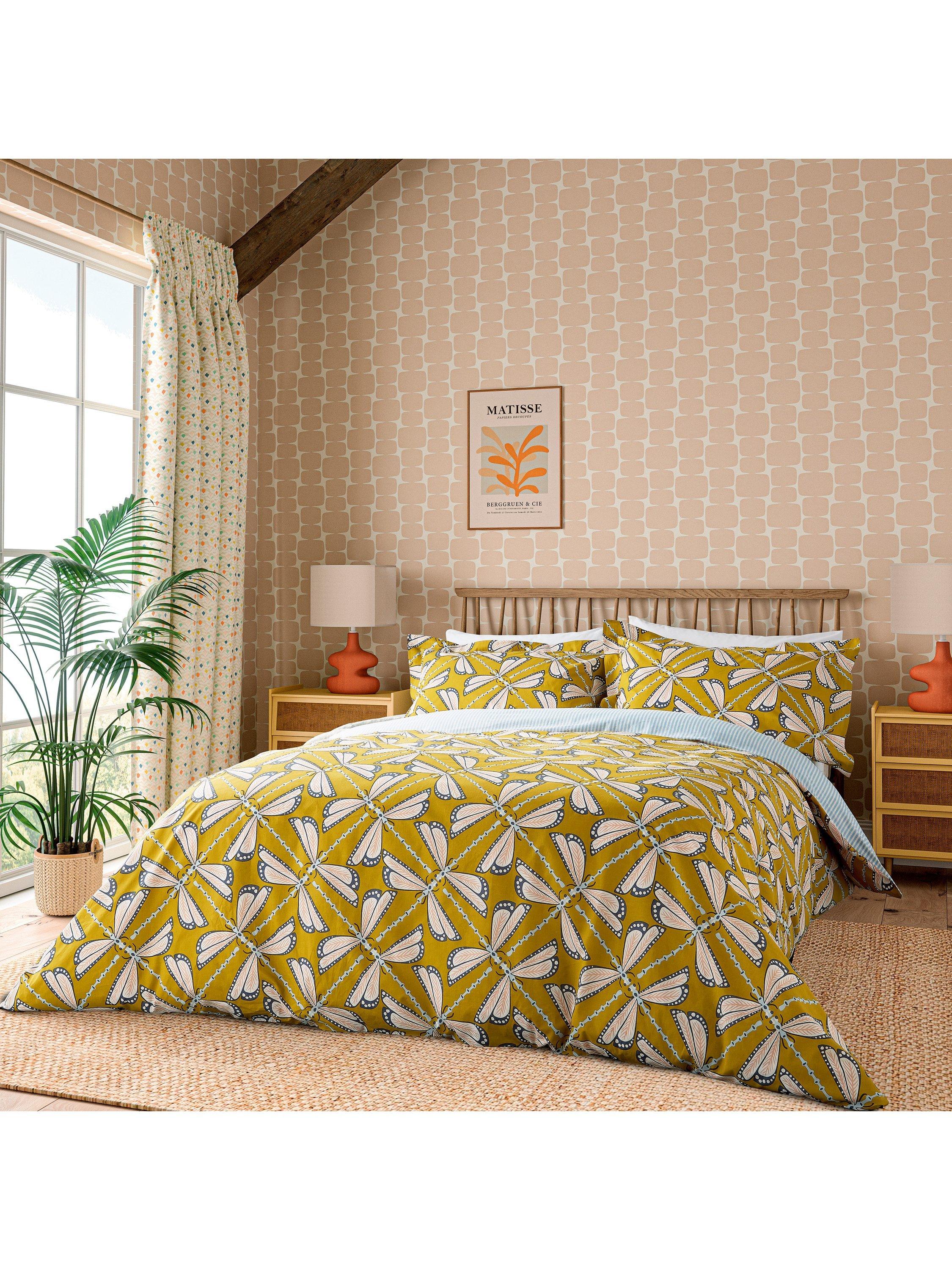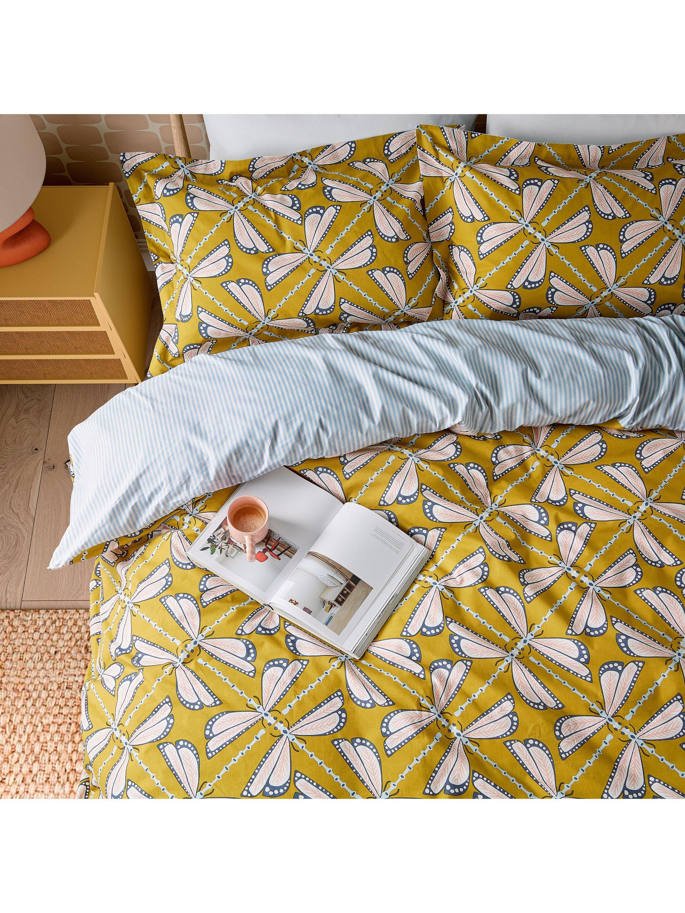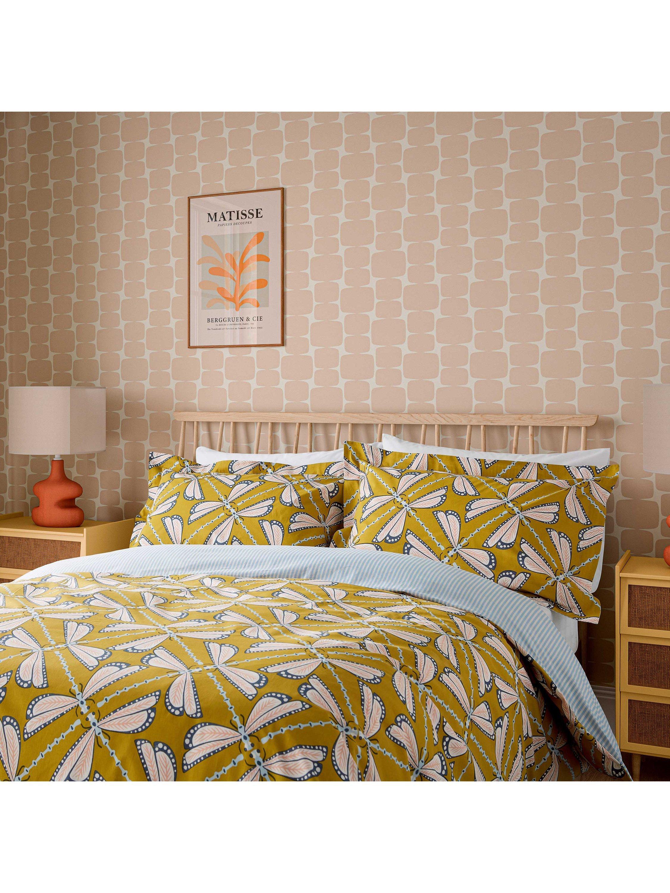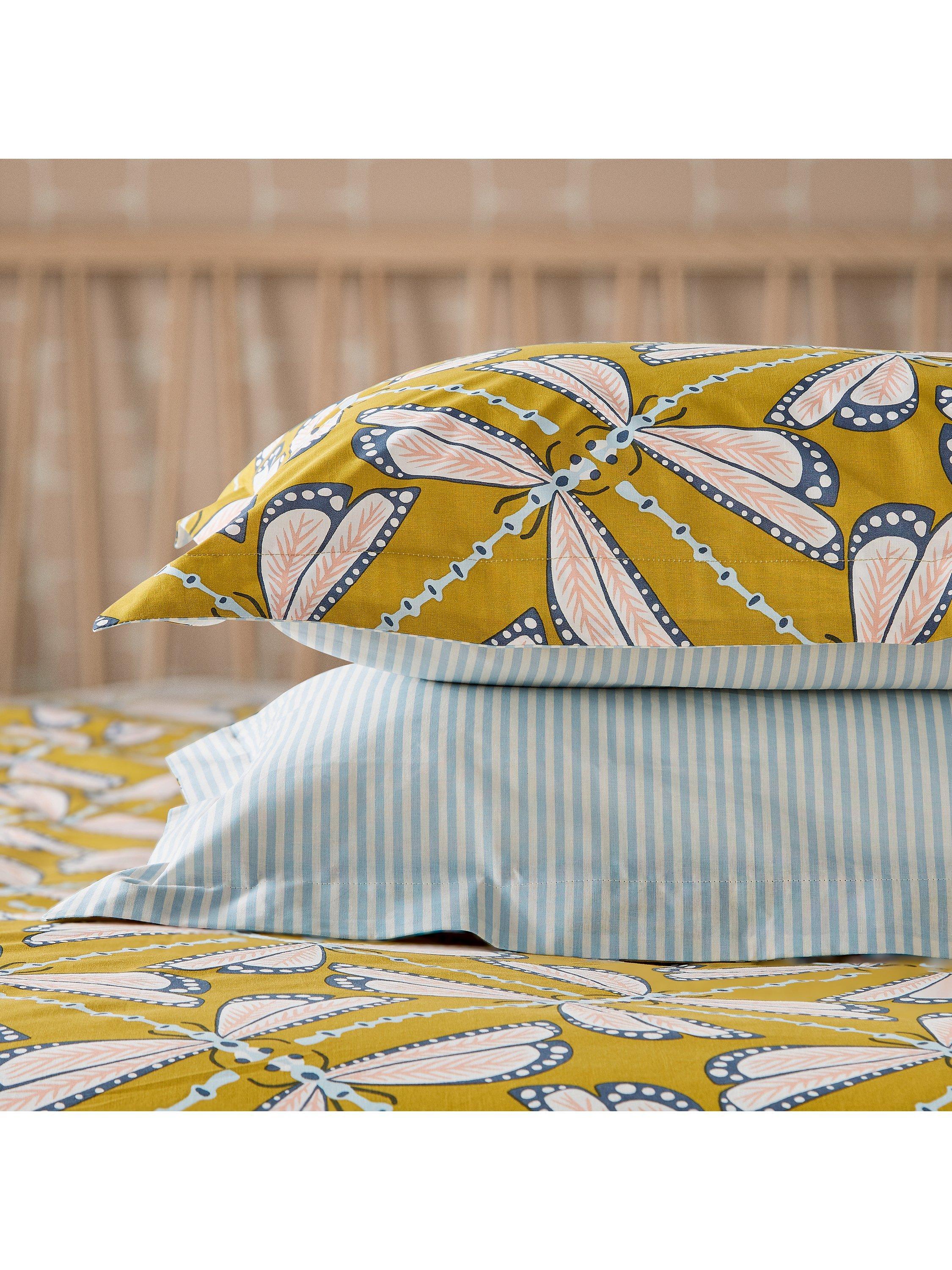 Intricately painted, Moon Flights depicts interconnected dragonflies arranged in a new geometric design. These insects glow in the moonlight, displaying cool and soft tones set against a warming ground, a favourite in the Scion palette. The reverse of the duvet is a simple stripe, perfect for that turned-down bedding fold. Printed on pure cotton, the set includes: 1 x Oxford pillowcase in the Single set and 2 x Oxford pillowcases in the Double, King and Super King sets.