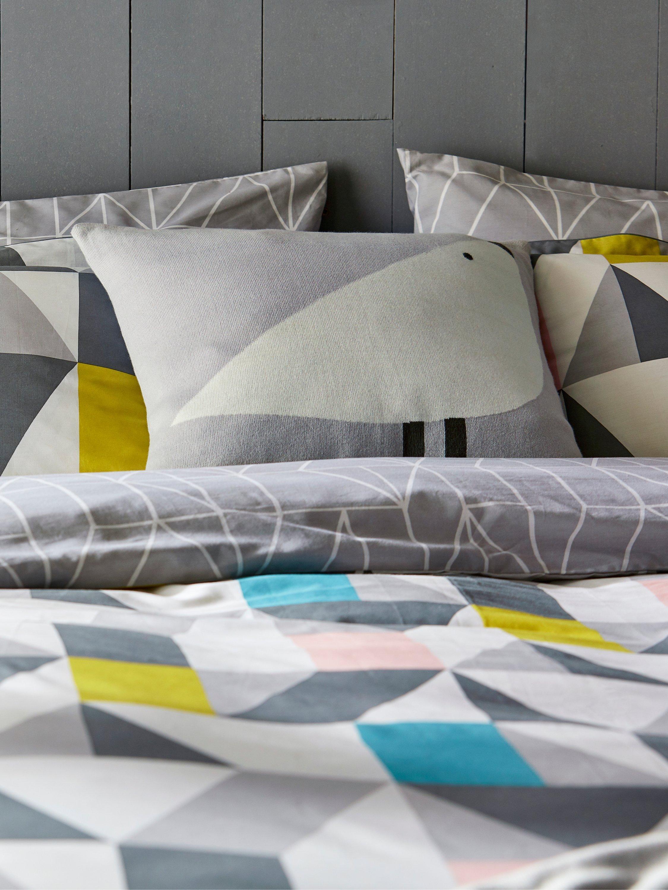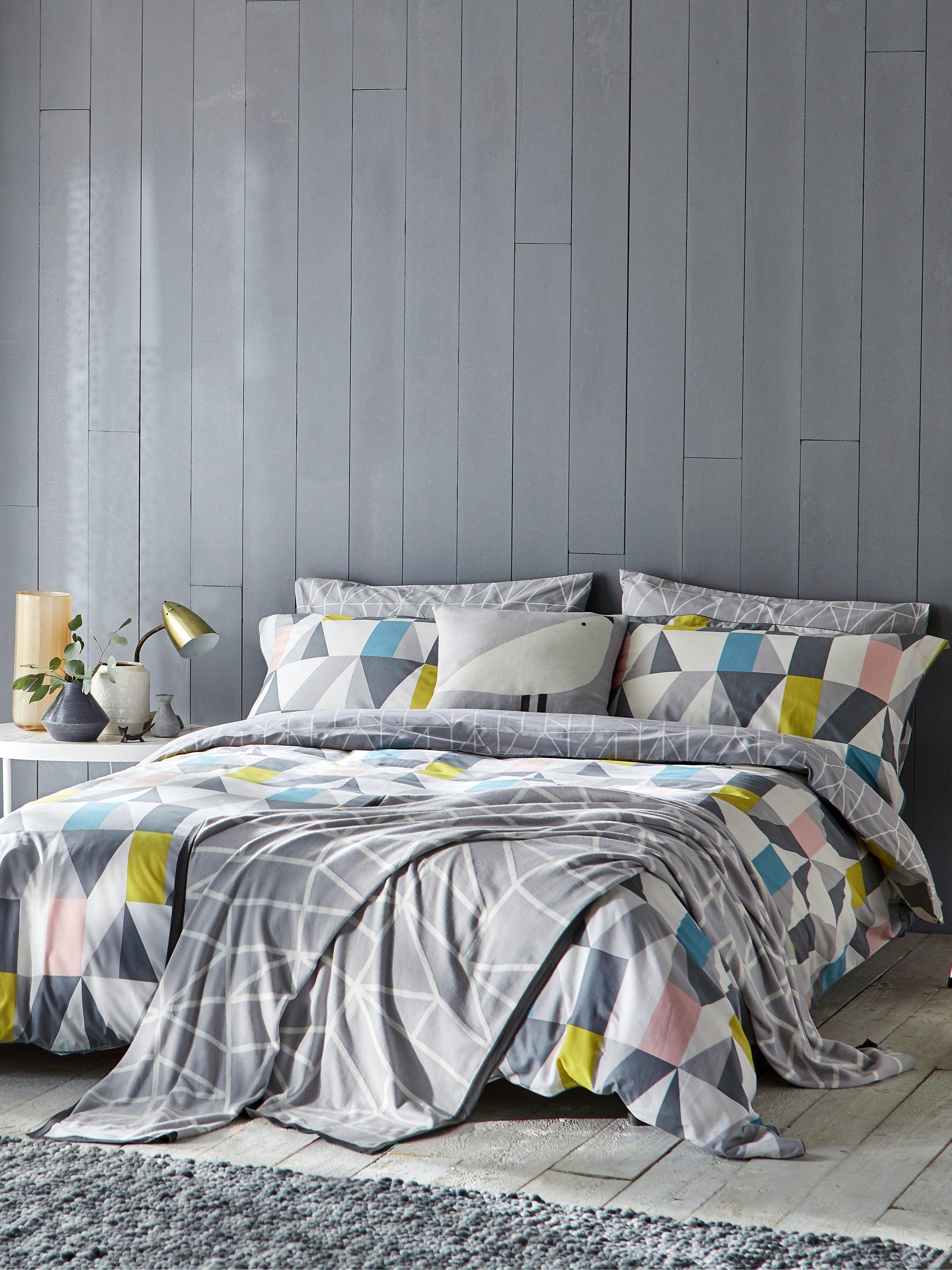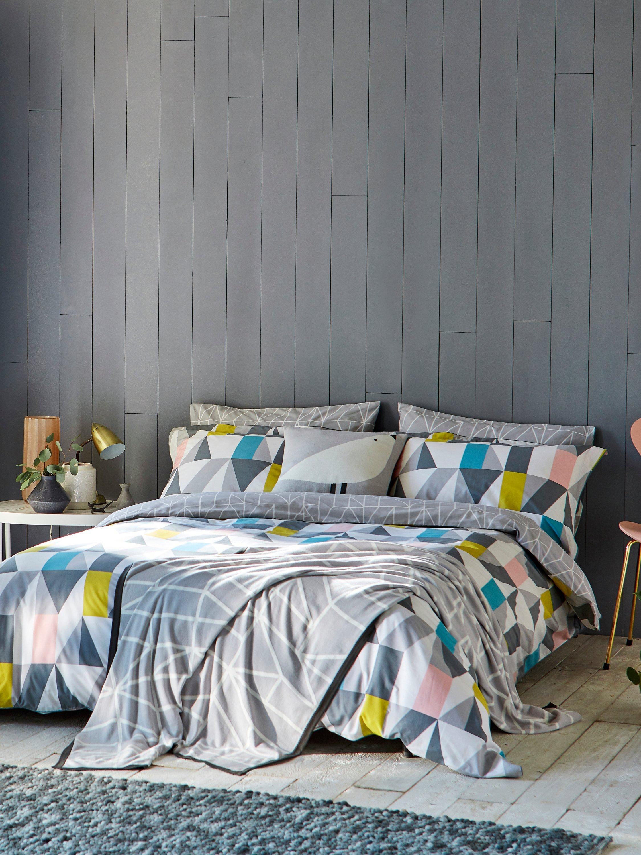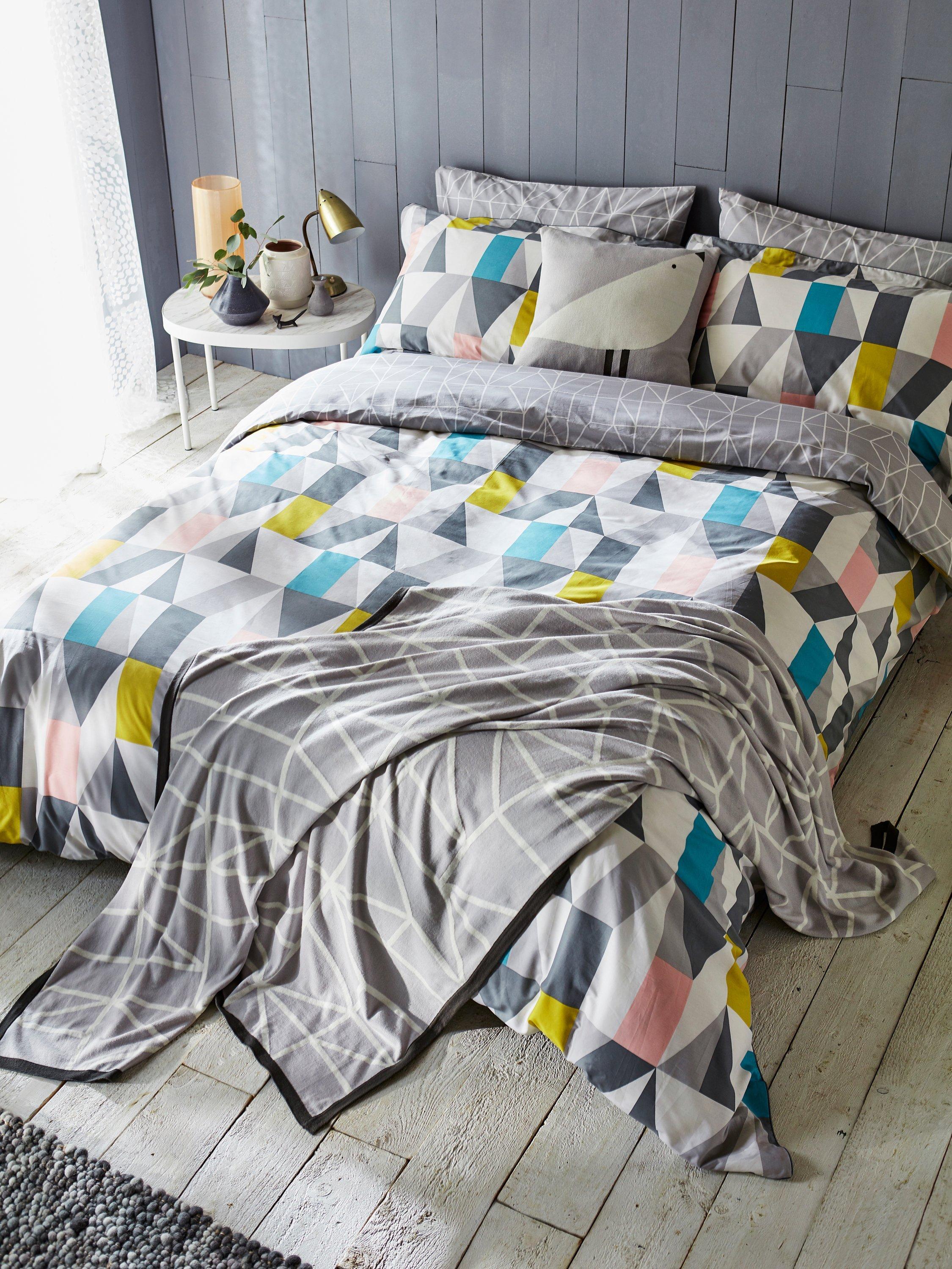 This angular, geometric designed bedding features interlocking flat shapes to create a modern patchwork effect. It reverses to a grey and white contrast print for versatility.