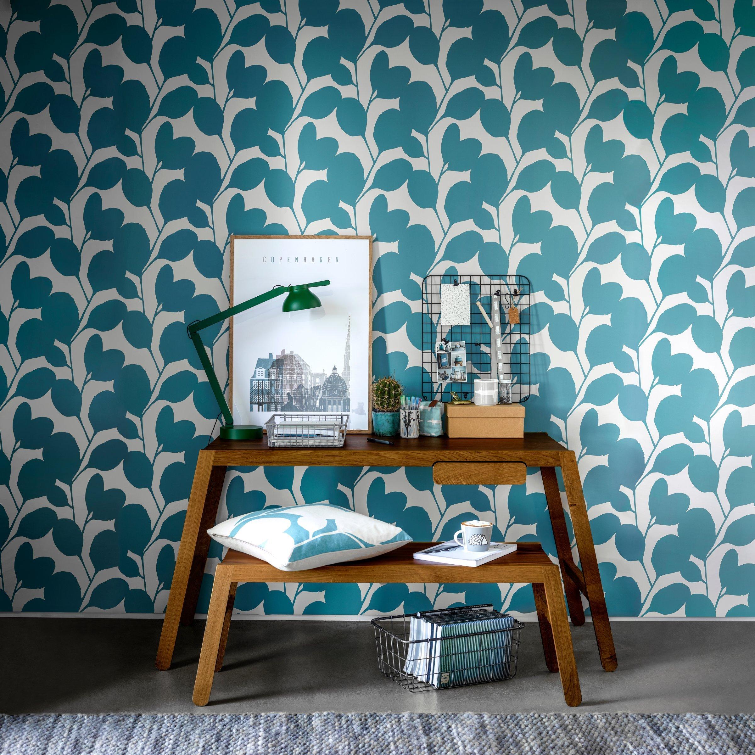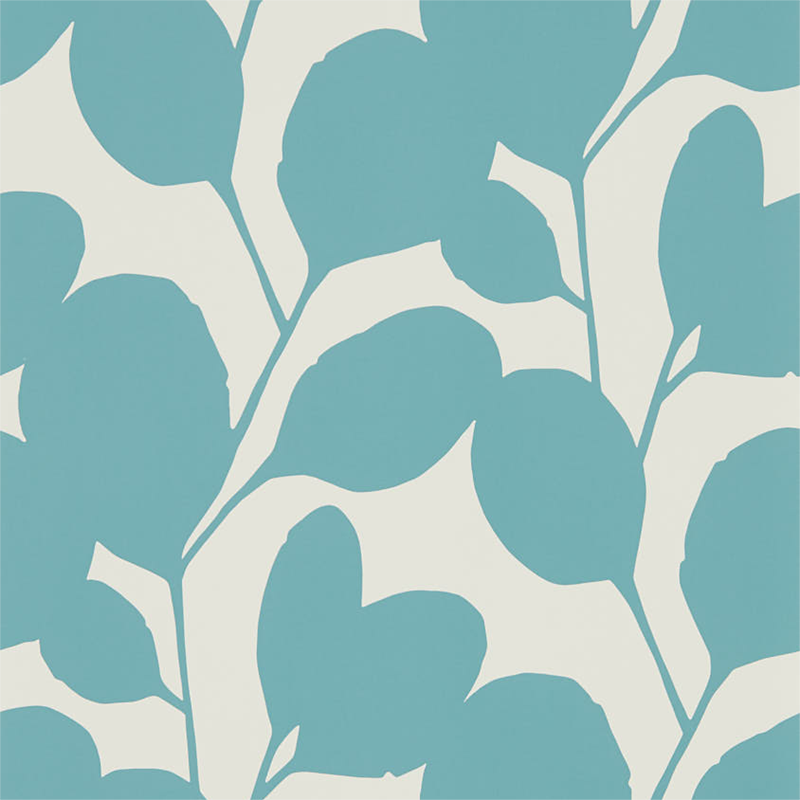 An up-scaled botanical wallpaper that features a bold, oval leaf silhouette trail.