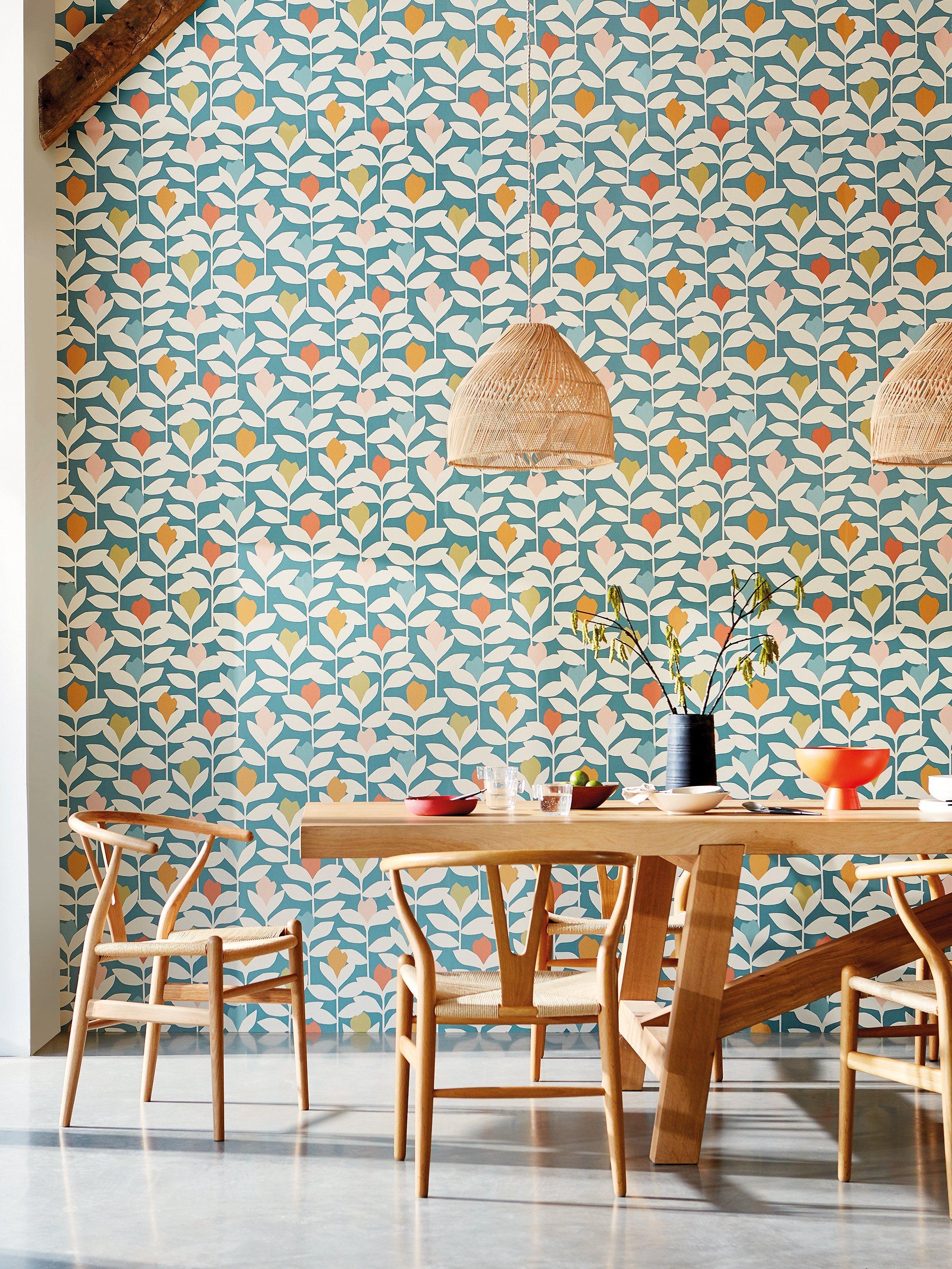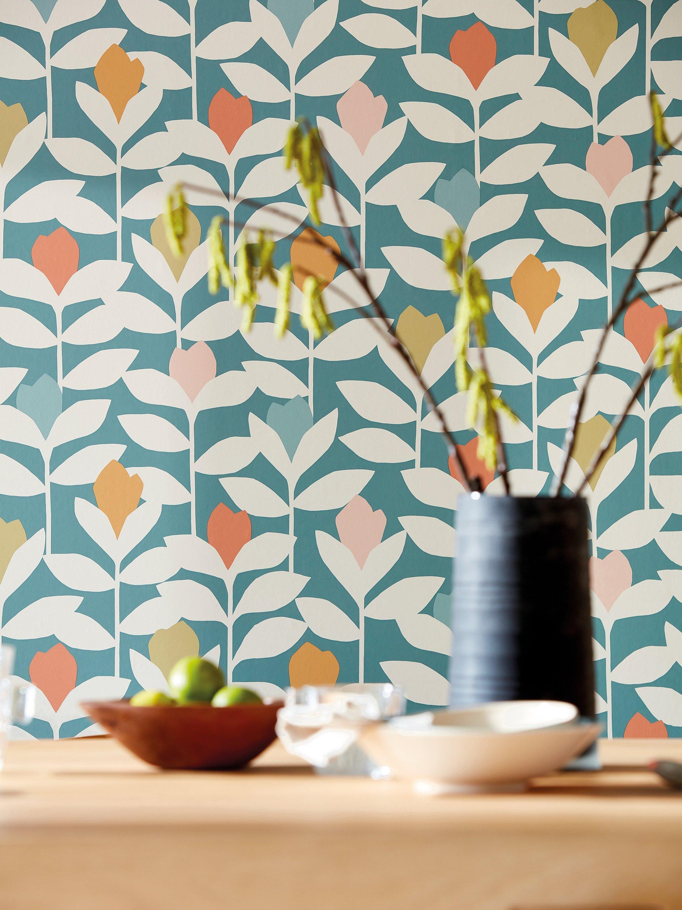 Confident pops of colour stand out amid layers of stylised stems on this classic Scion wallpaper.
