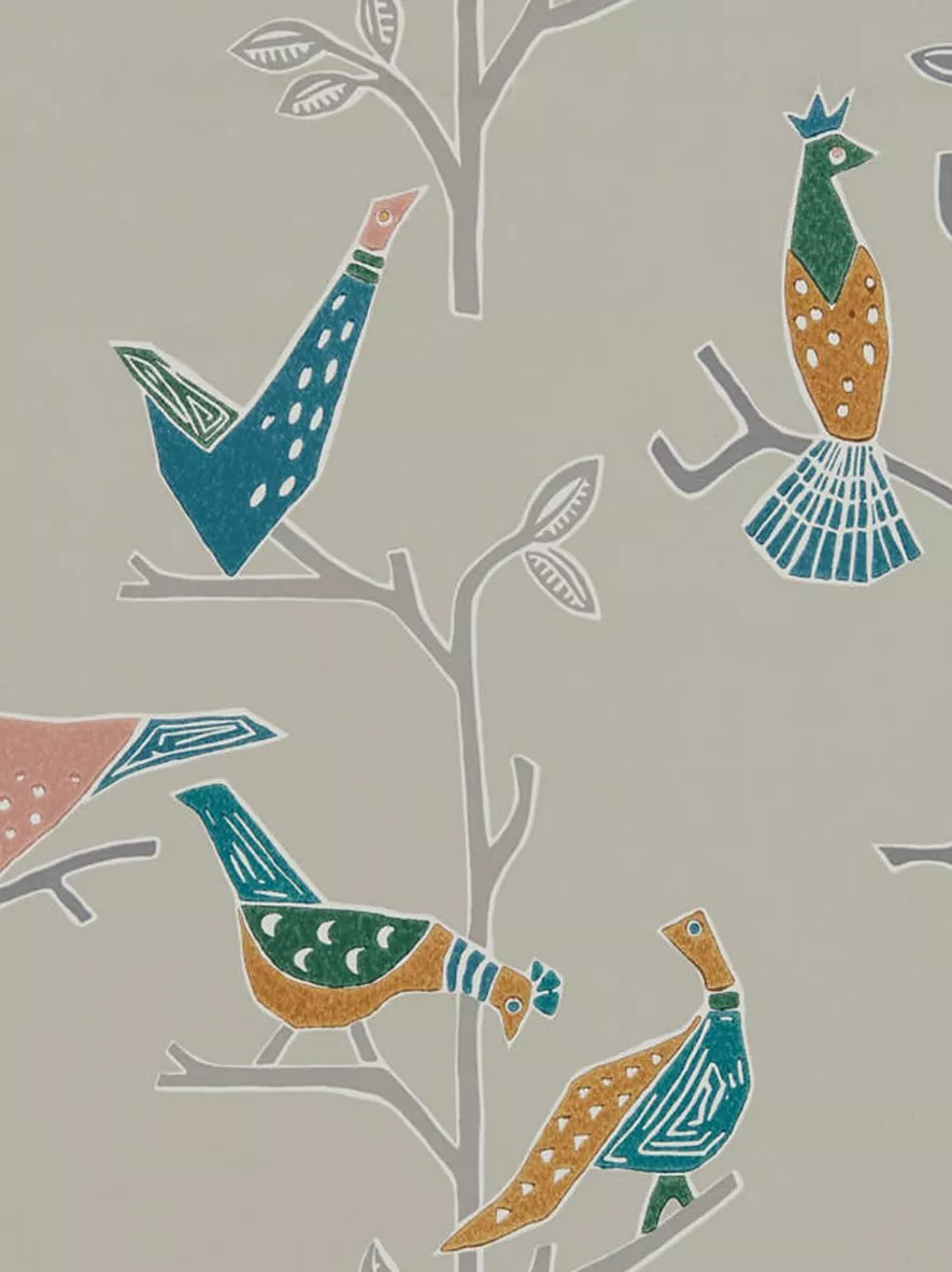 Cheerful stylised birds perch on budding branches in this lino-cut style wallpaper.