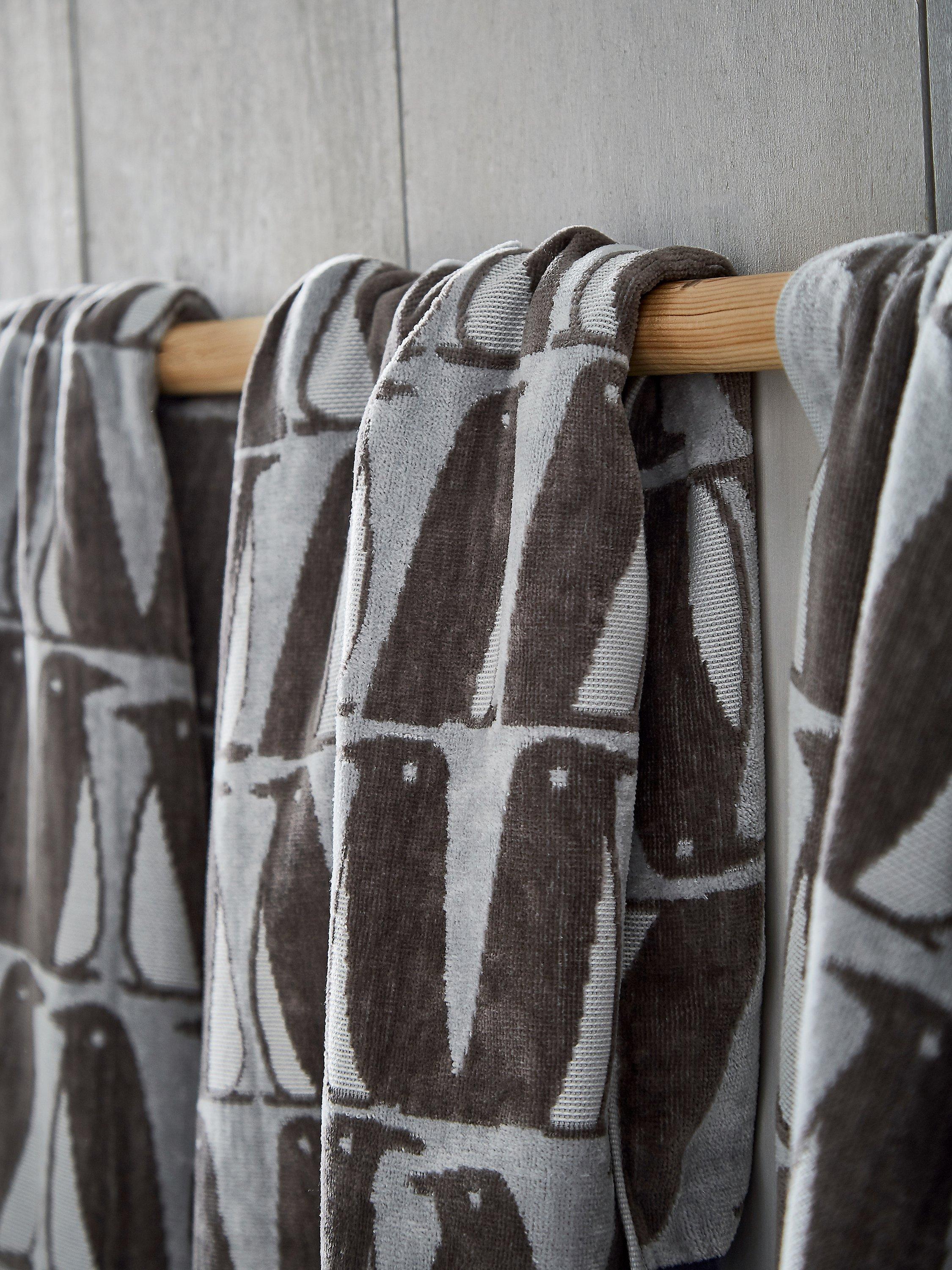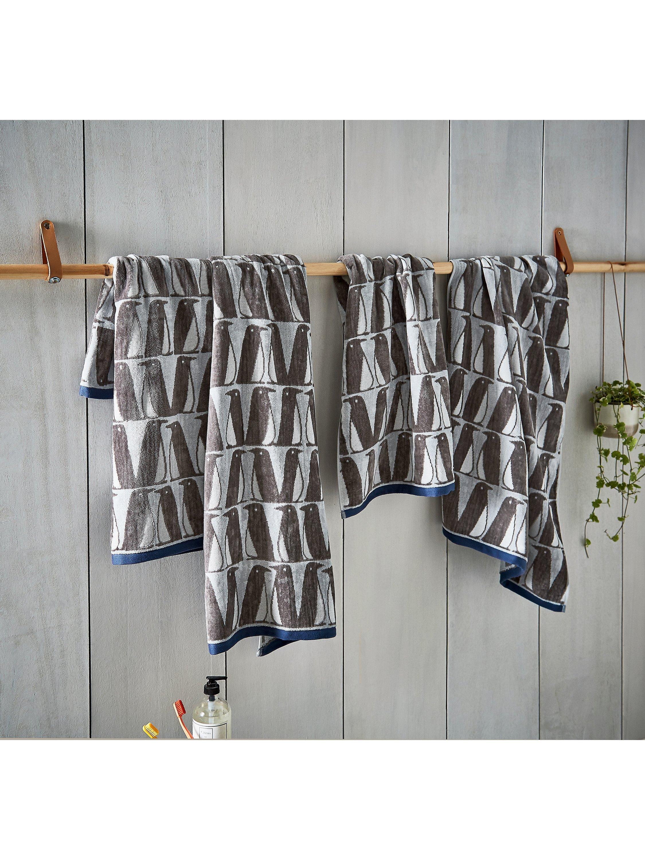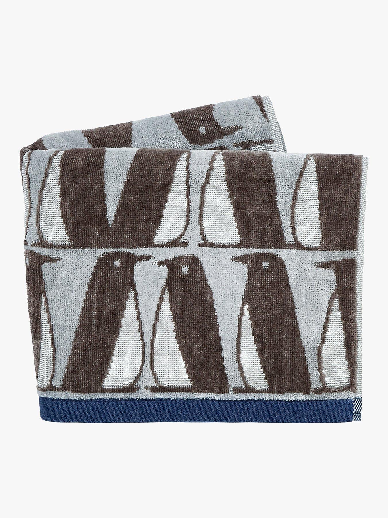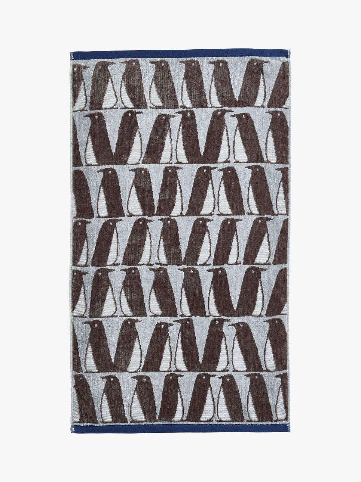 A cute motif of penguins waddling across the Antarctic ice feature on these velour Scion towels.