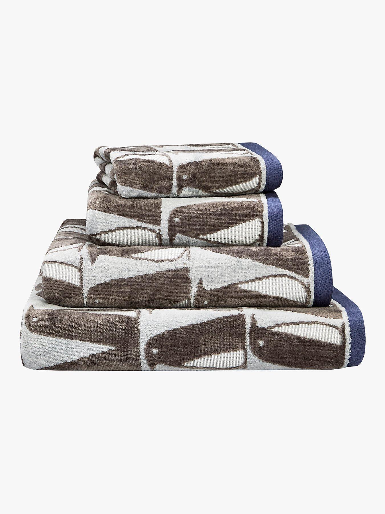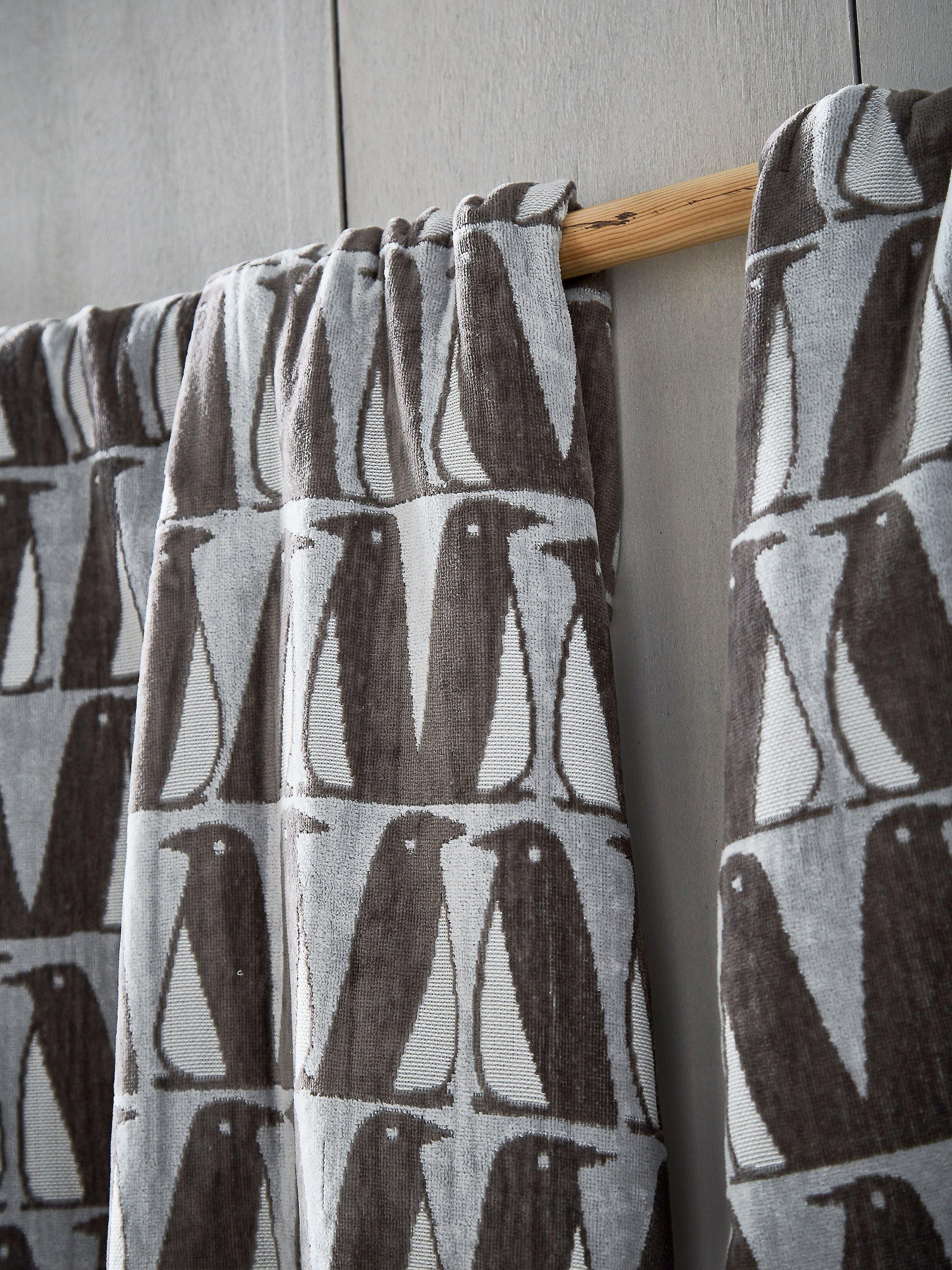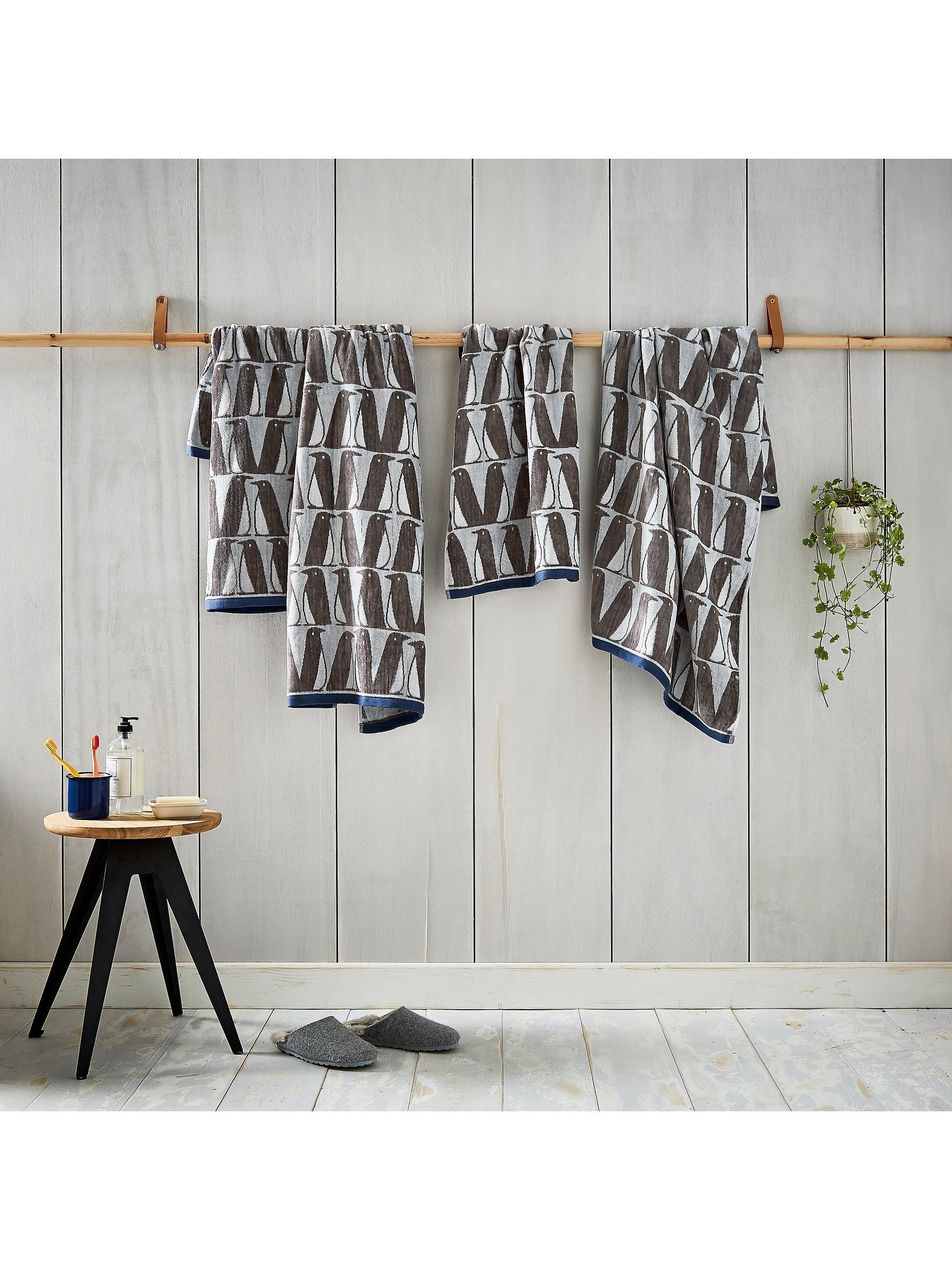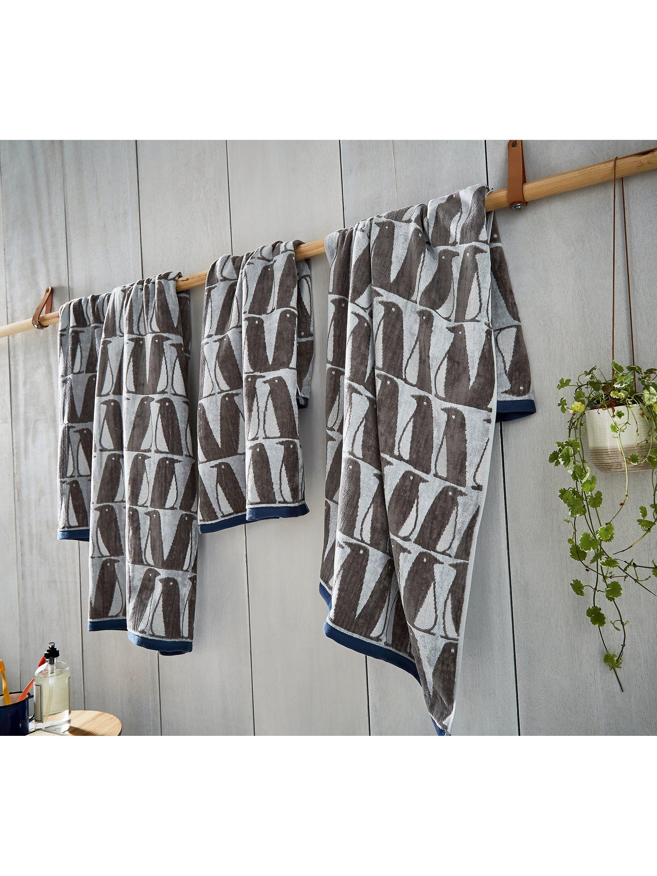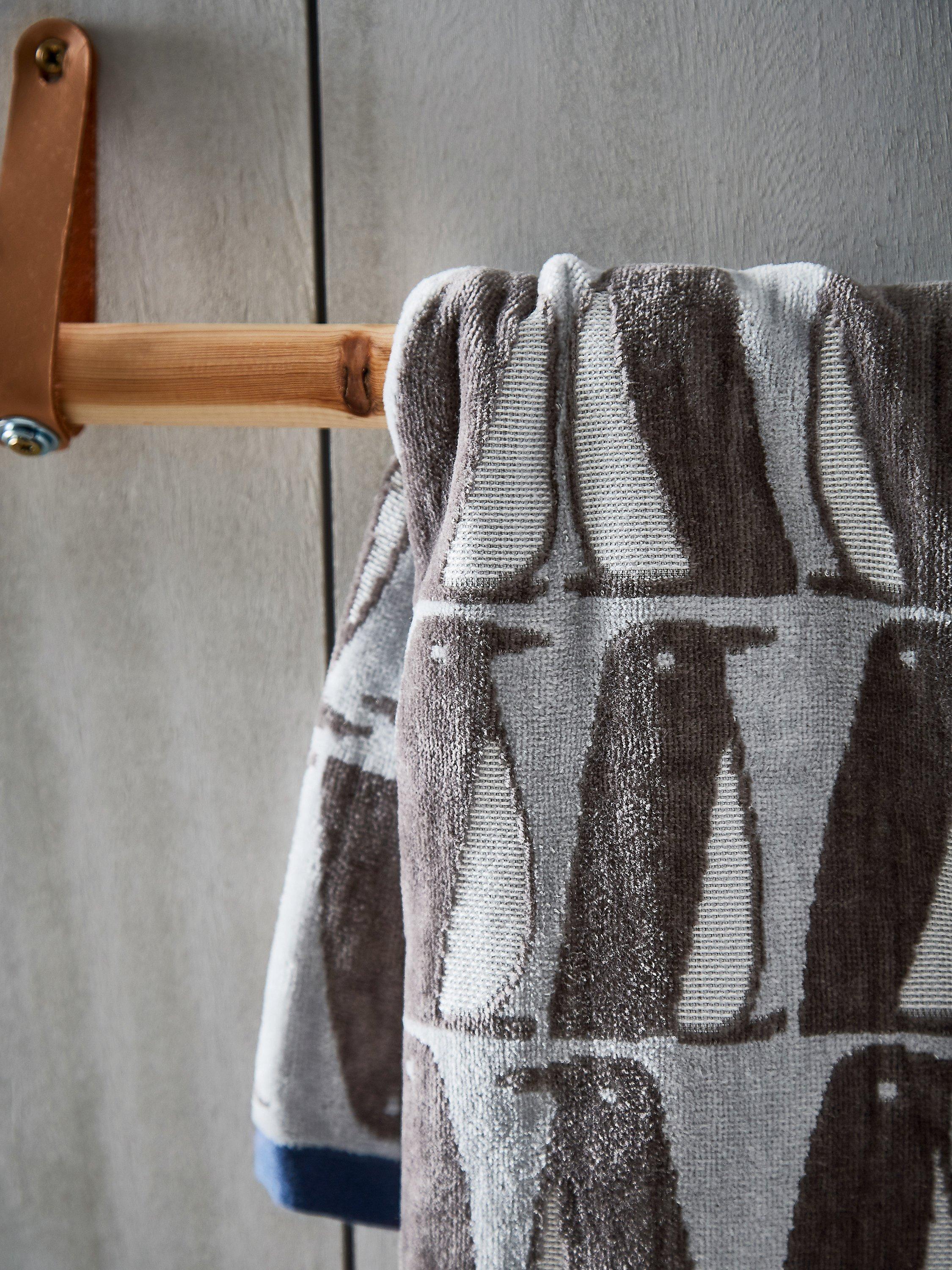 A cute motif of penguins waddling across the Antarctic ice feature on these velour Scion towels.