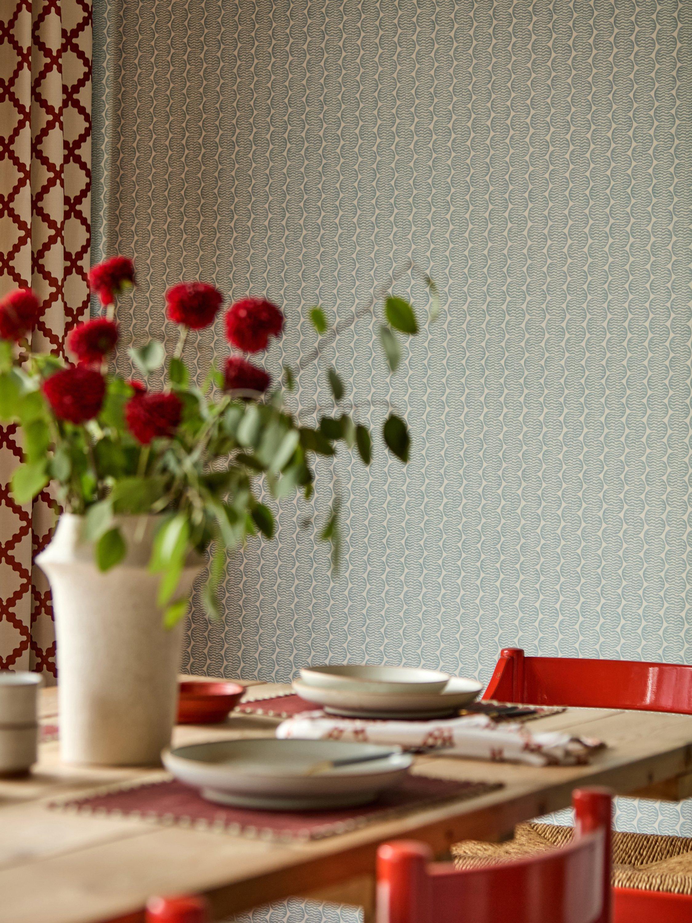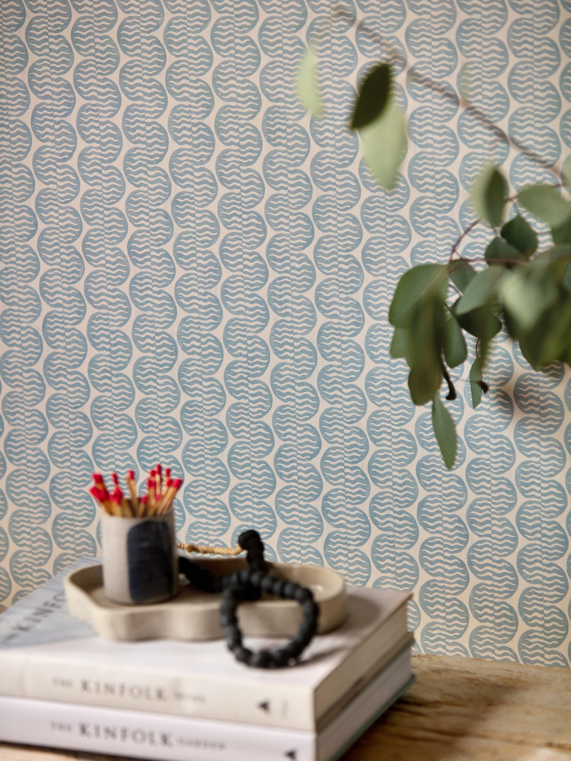 Created from a lino print, ripples of water translate into an all-over stripe, undulating with a slightly retro feel. A stamp effect gives a charming, handcrafted feel and makes a great coordinating design.