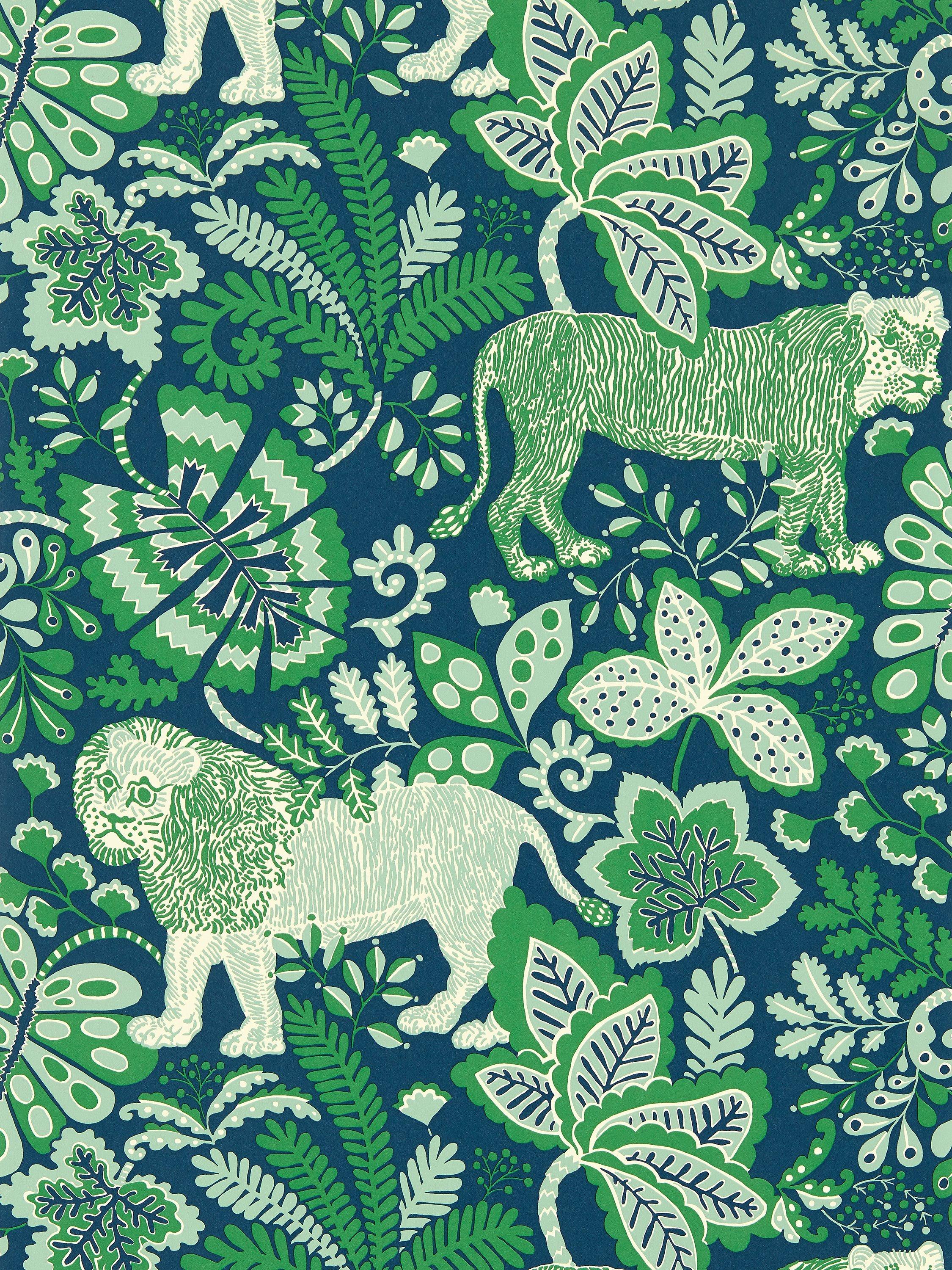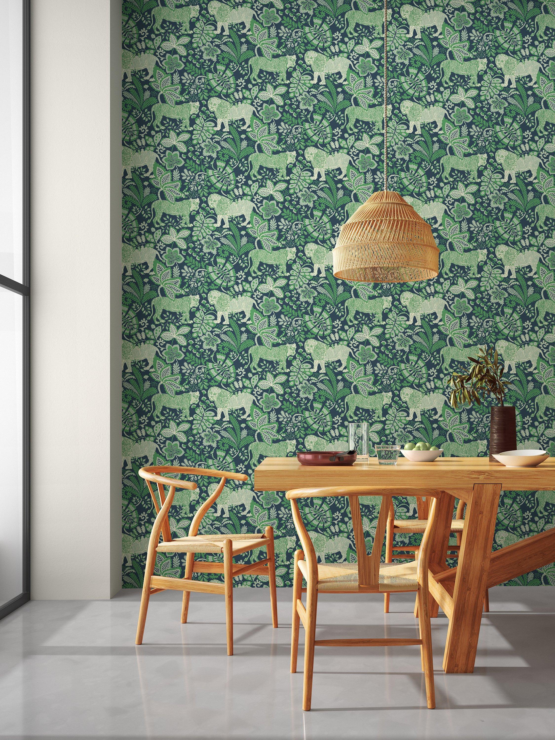 What's that we hear? The roar of lions having a friendly chat (we know that kind of chat)! Deep in the jungle, botanical elements flank the pride in this playful wallpaper that's hand drawn in pen and ink.p