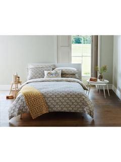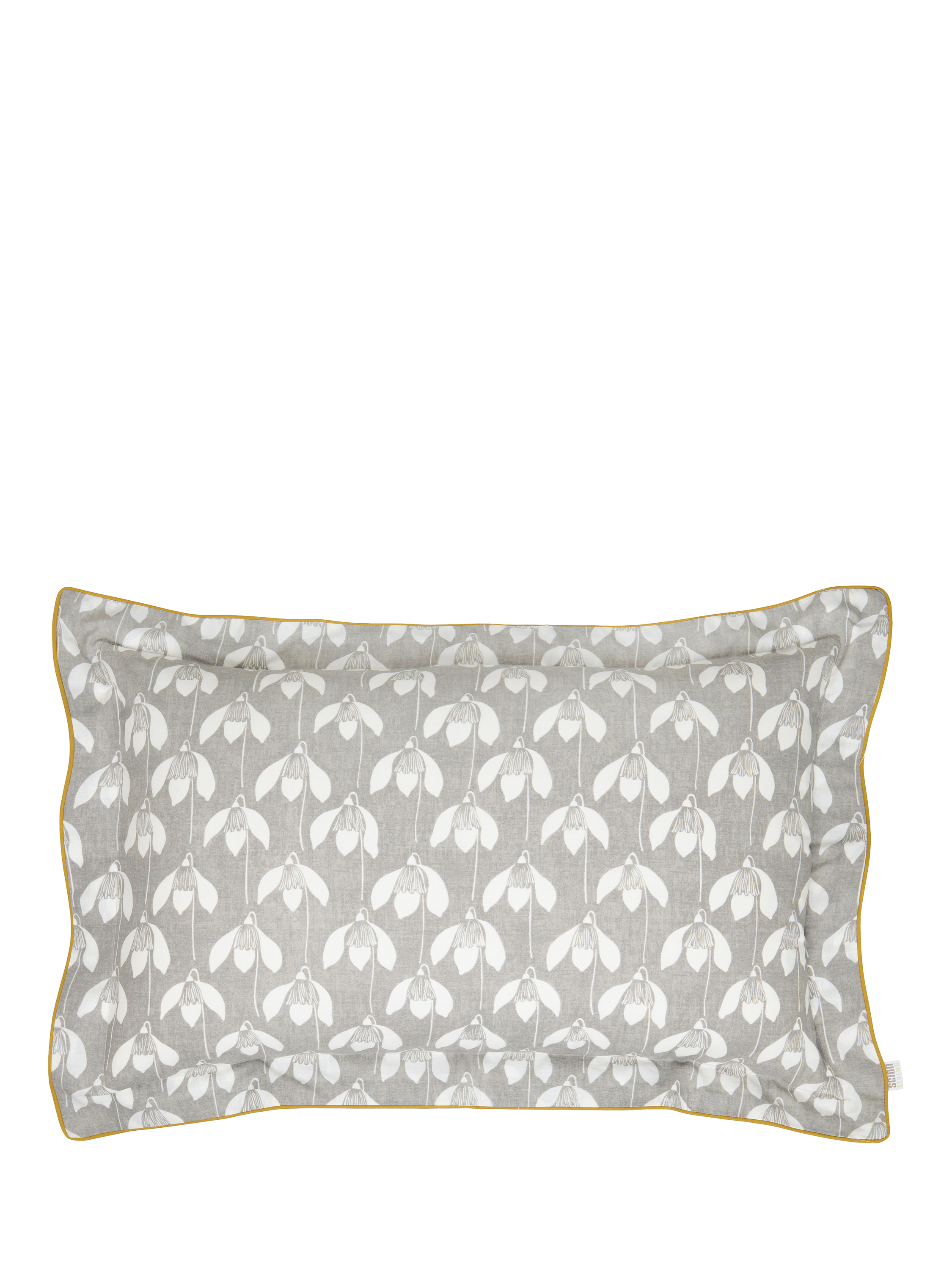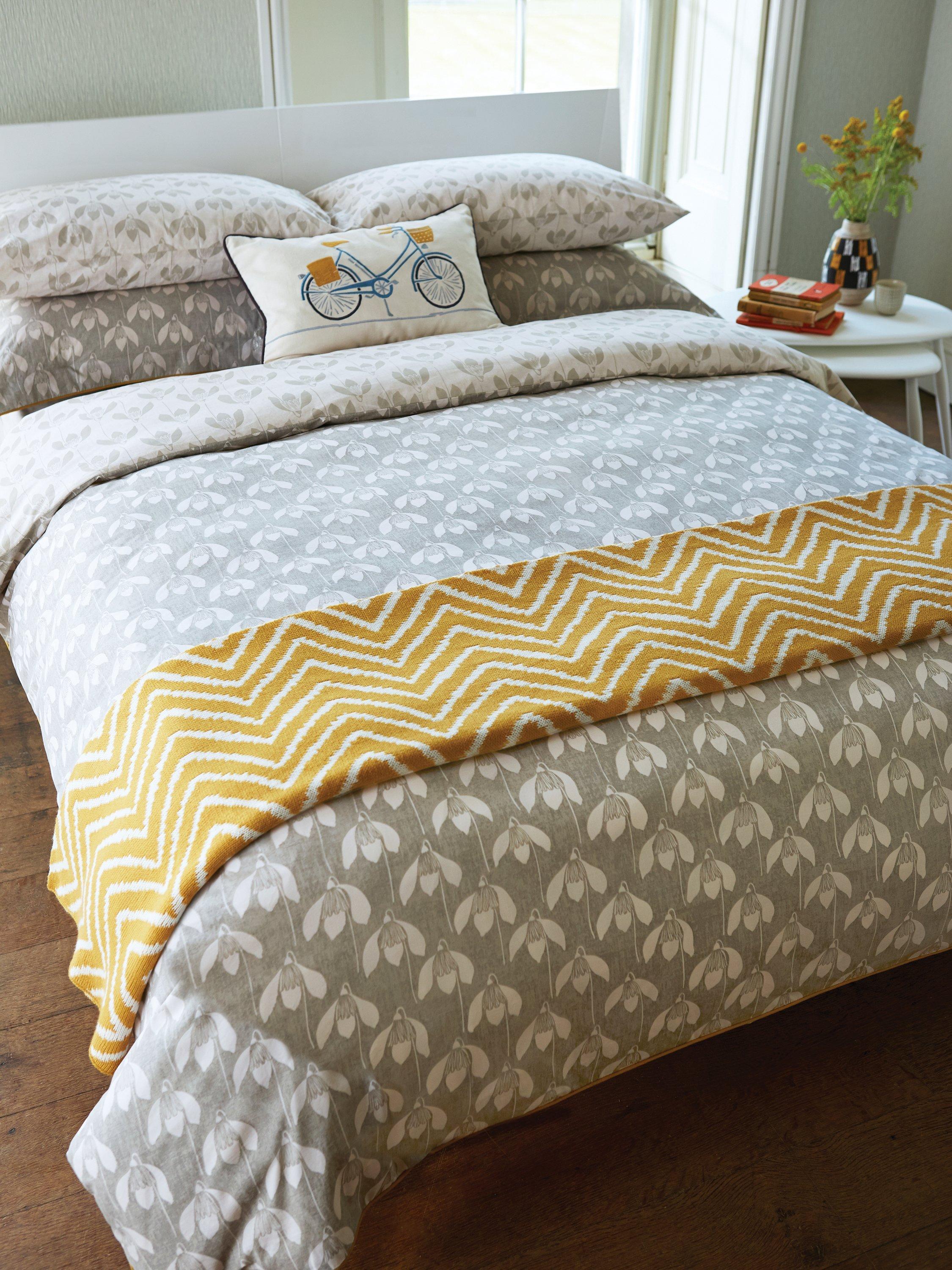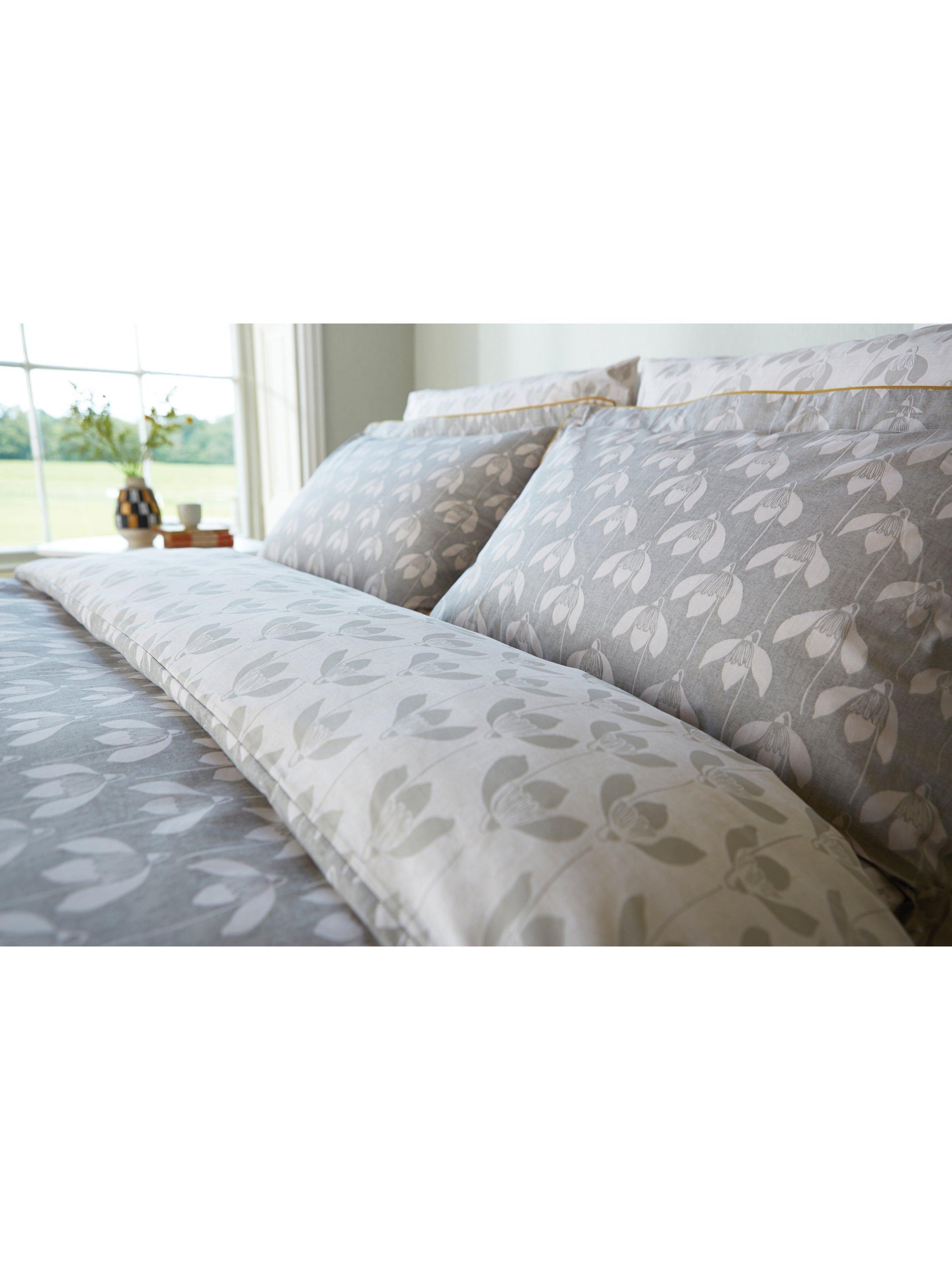 This bedding features an all over stylised snowdrop flower head, pigment-printed on a grey ground, the design is reflected on the reverse in the contrasting colourway and piped in mustard.