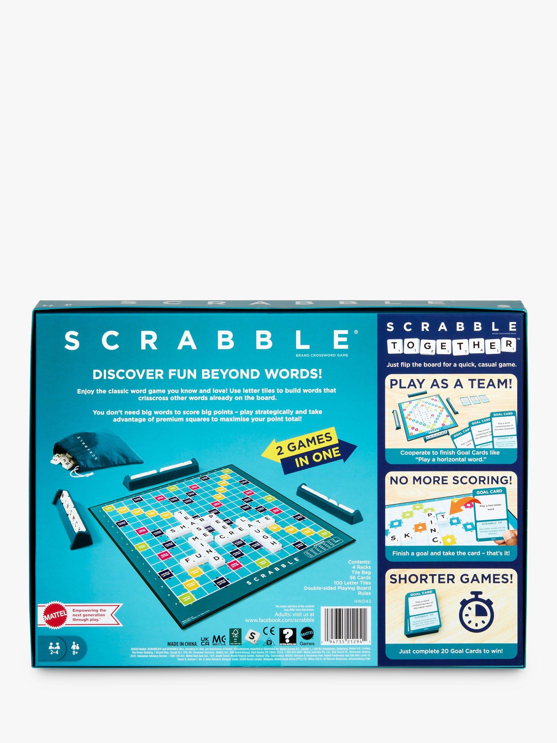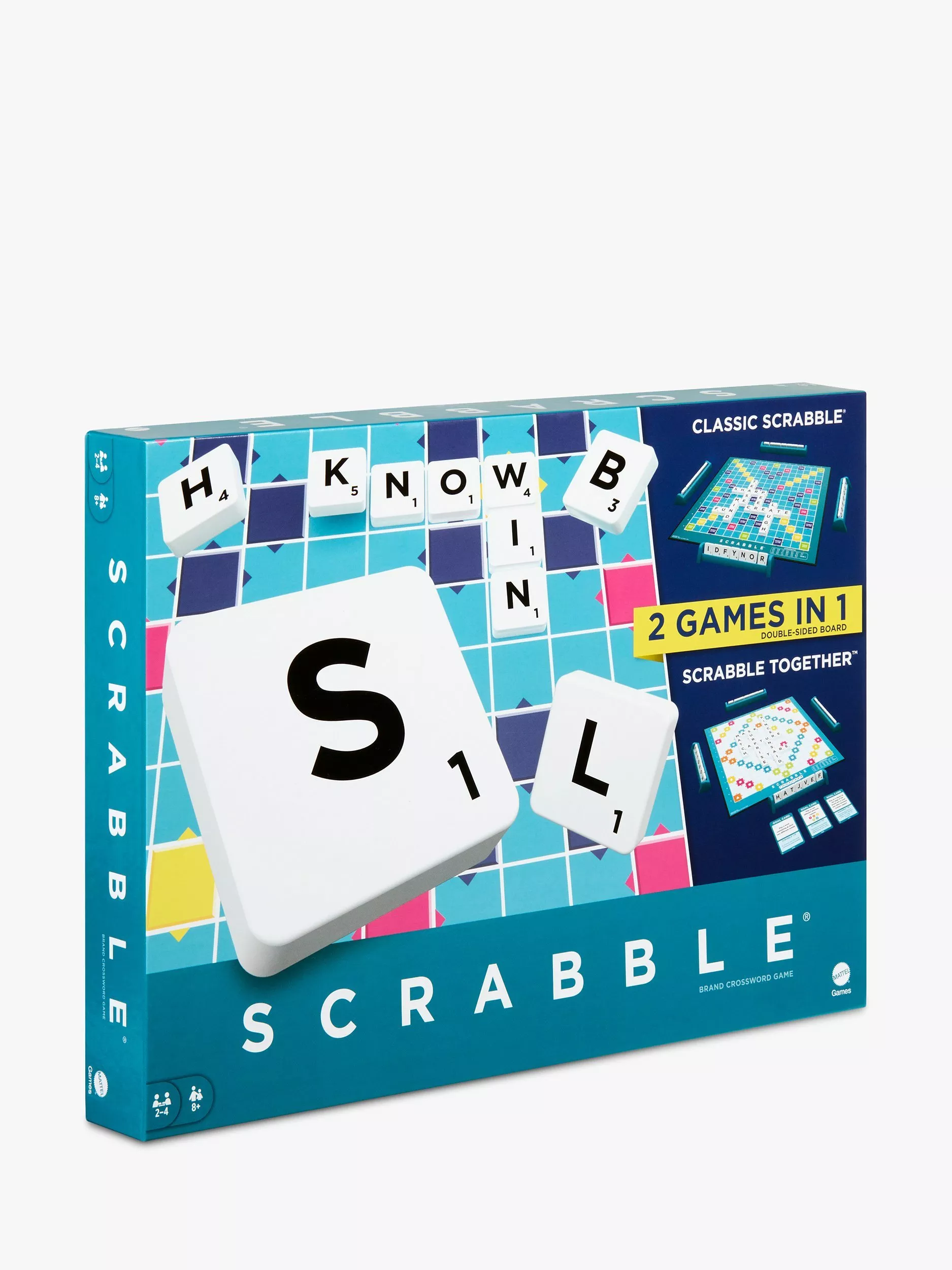 Experience fun beyond words with the Scrabble board game, now featuring two games in one! Players can enjoy the classic Scrabble crossword game they know and love building words and angling for Double Letter and Triple Word scores, or flip the board and try Scrabble Together; a quick, casual game where players cooperate to complete word challenges. These two games spell FUN for longtime and new players alike!