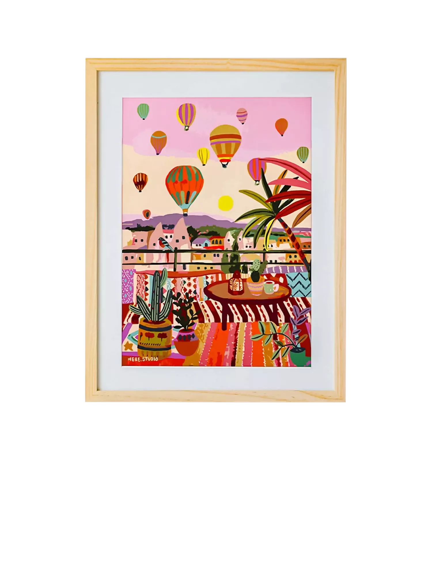 A magical scene of hot-air balloons floating across pink-gold skies. Great for romantics and wanderlusters who love uplifting, sunny artwork.