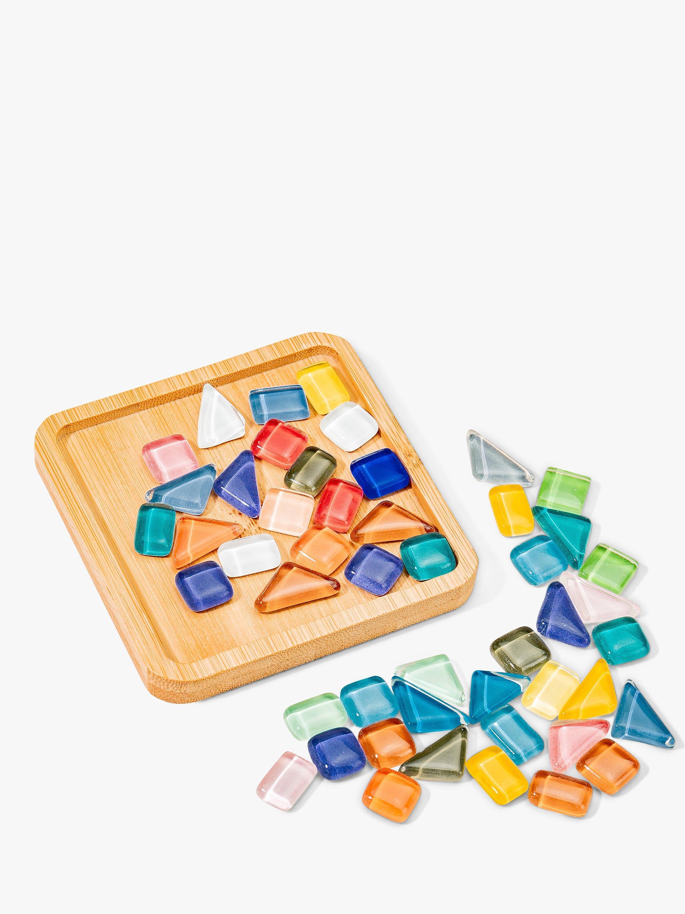 - Plaster powder, glue pen, mirrored back-board, mirrored plate, grippy-strips, coaster, mosaic tiles, mosaic pot, mosaic tile game, guide