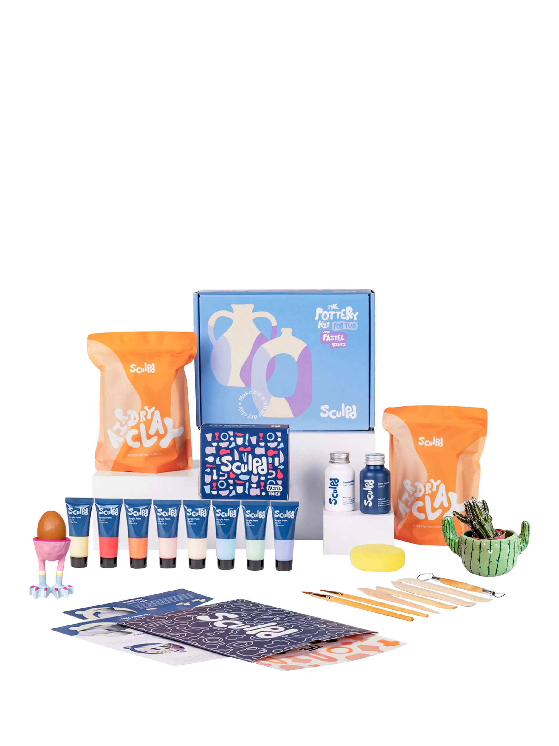 The Pottery starter bundle comes with all the materials, tools and guidance you'll need to create functional and useable pottery pieces from home. Popular creations include plant and cactus pots, trinket dishes, dried flower vases, animal and body sculptures and everything in between.