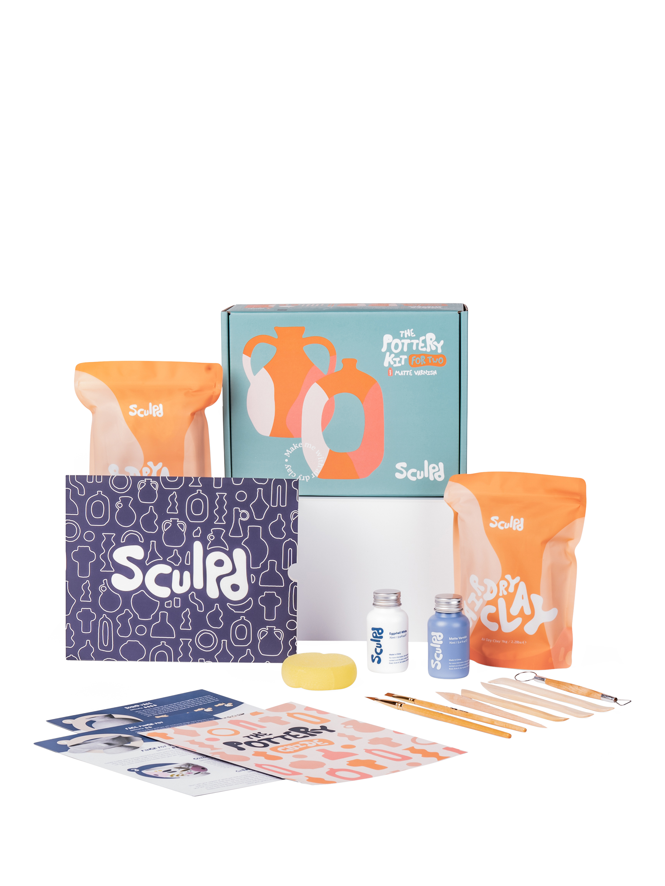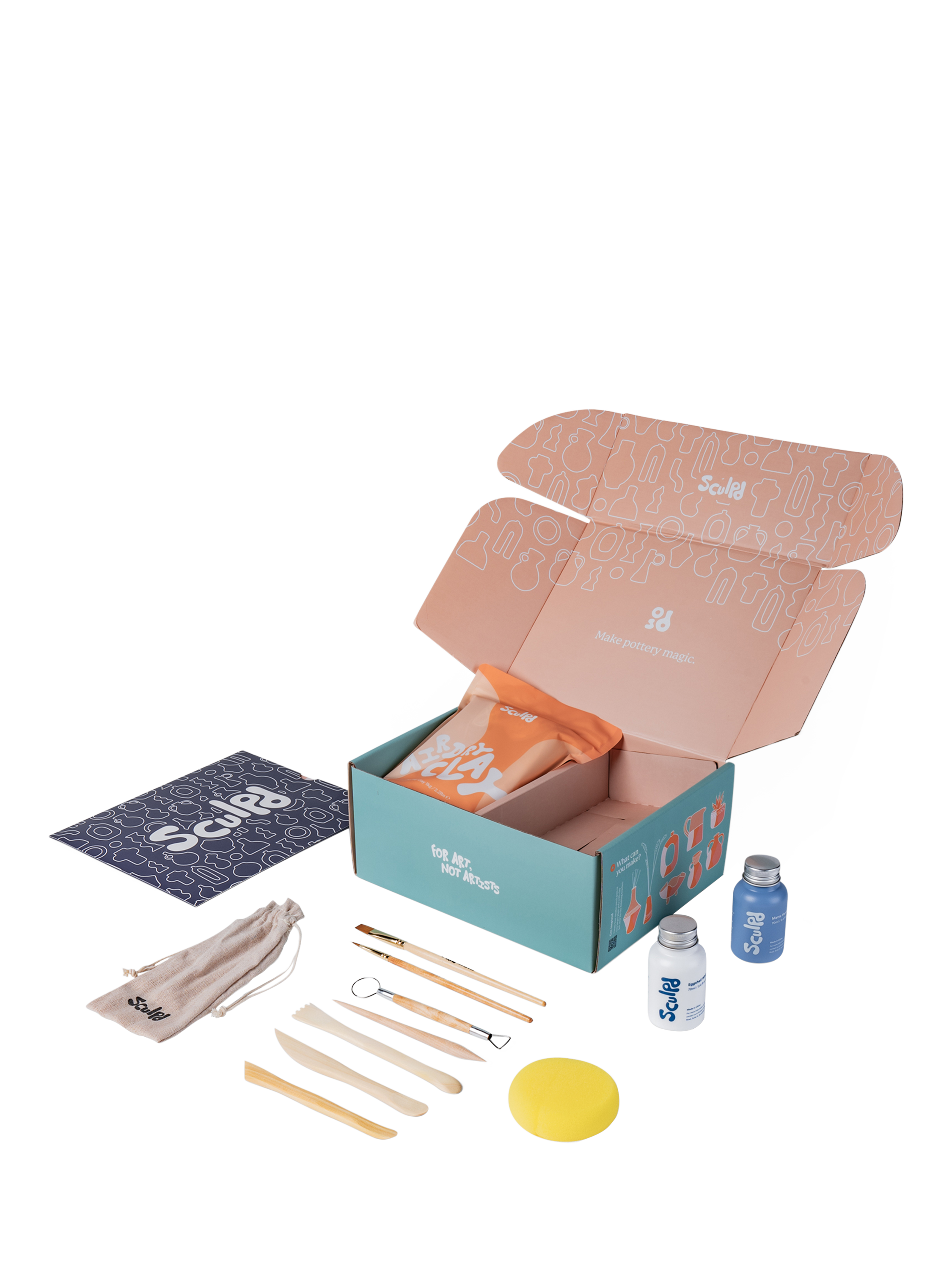 A Sculpd pottery kit contains everything you'll need to sculpt, carve, paint and seal your own pinch pots, succulent plant pots, trinket dishes, vases, candle holders, sculptures, wall hangings, coasters, pendants and everything in between.