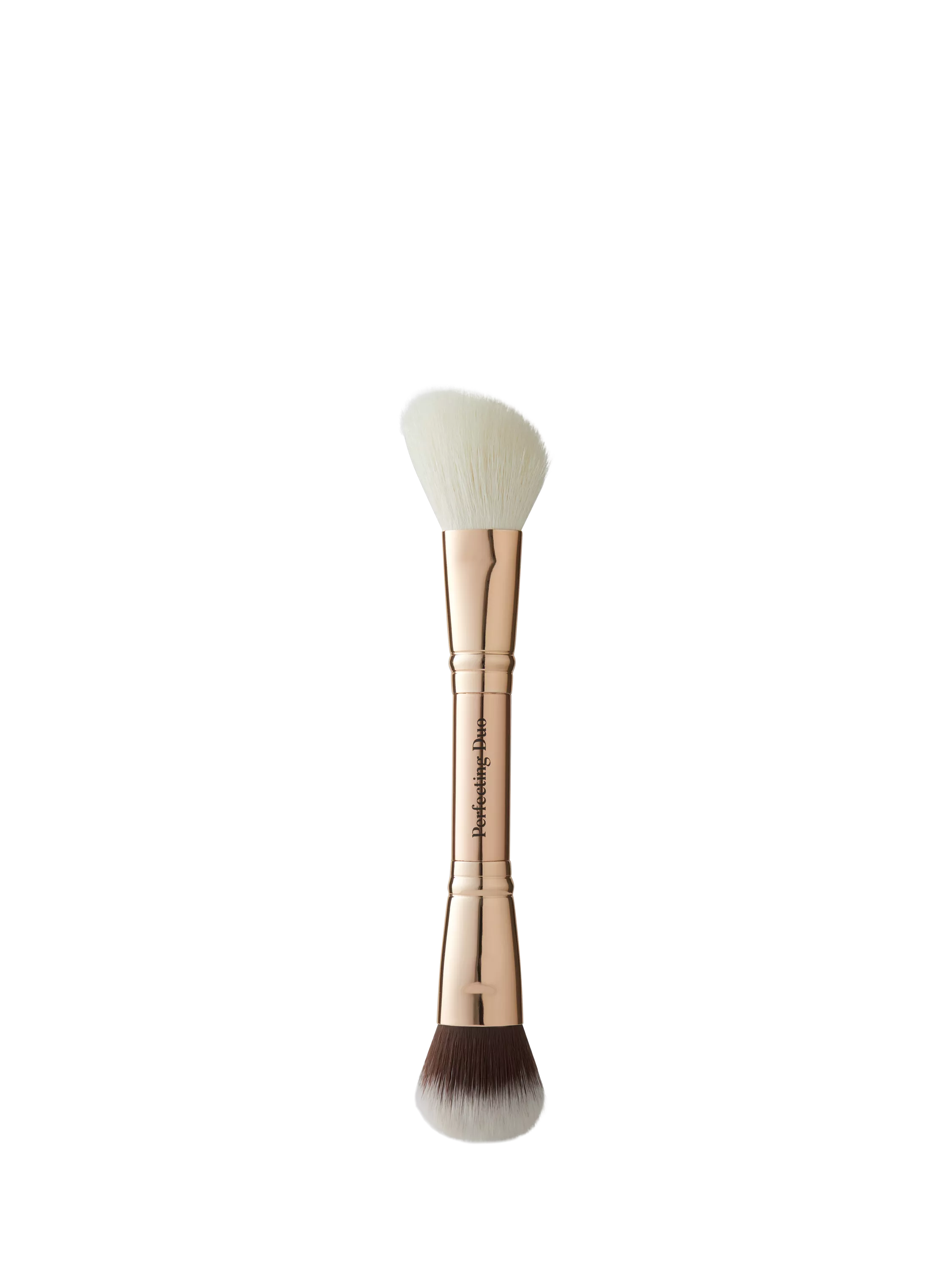 One end is an angled powder brush, which is ideal for contouring or applying powder blush. The other is a compact buffer brush that can be used for all your foundation or cream contour, and blush needs!