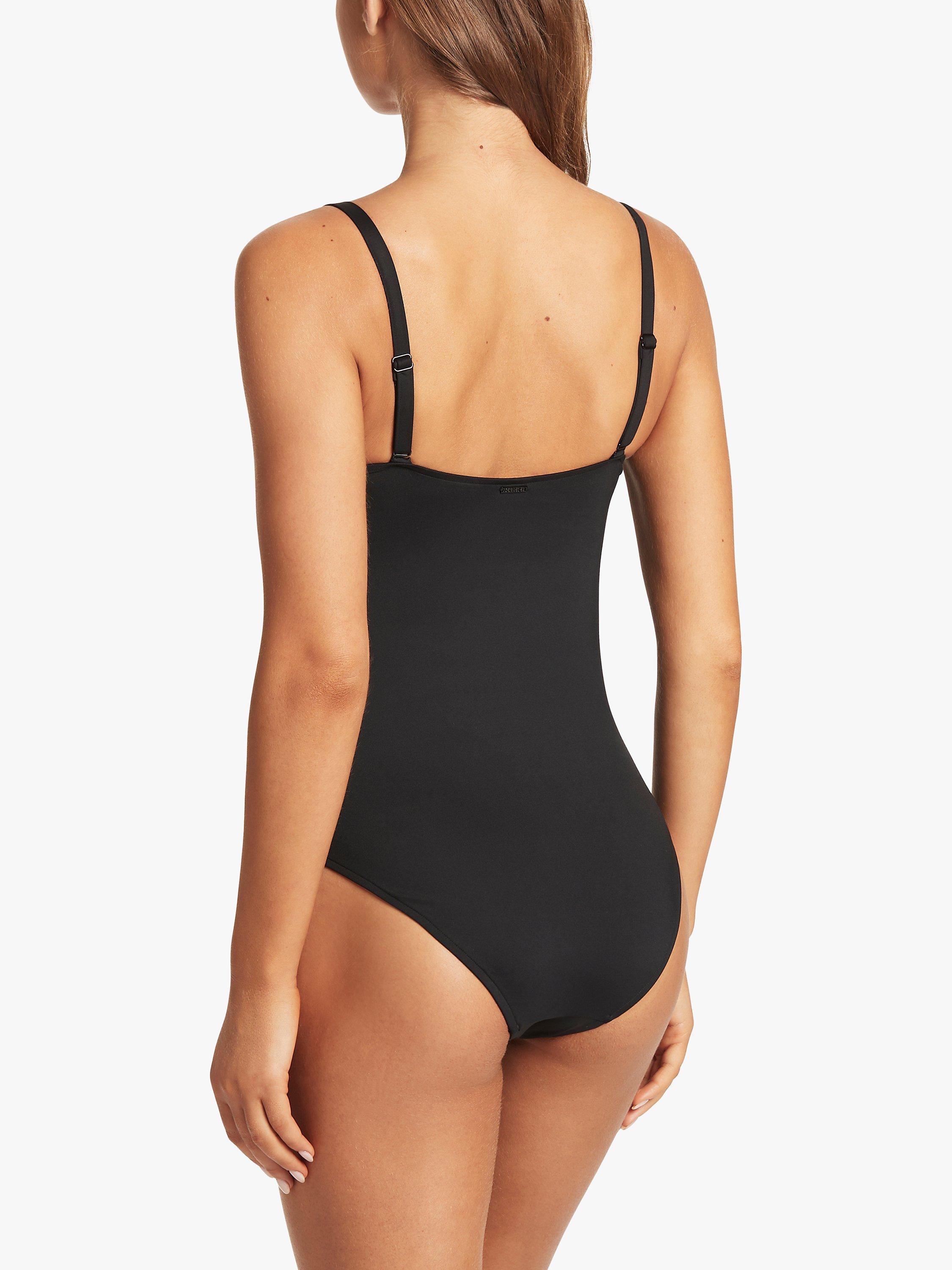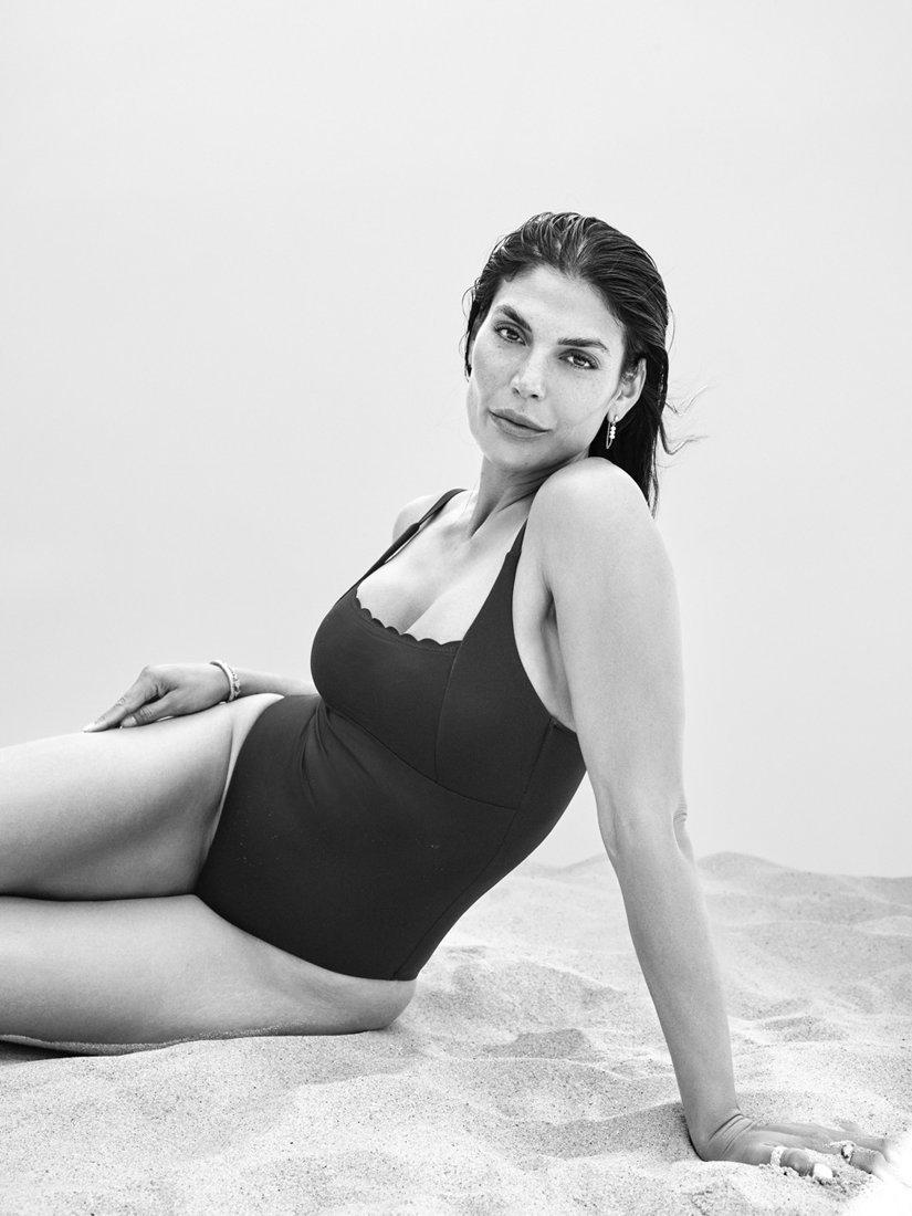 A square neck swimsuit with a flattering medium leg made in a sleek and soft recycled fabric with a scallop trim.