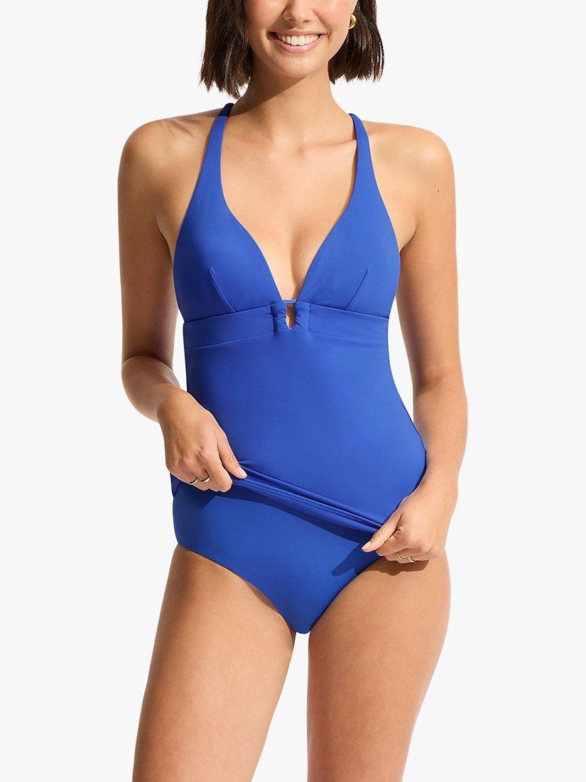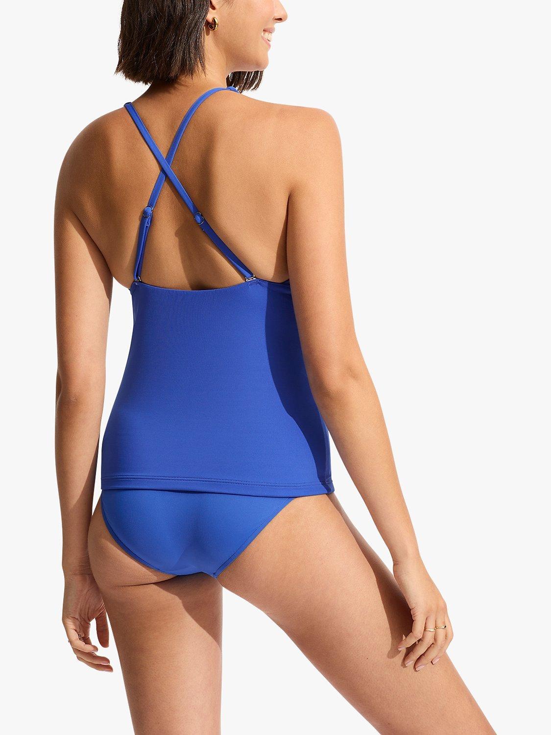 This sleek and soft shaping tankini top is the perfect holiday piece. With soft cup padding and buckle trim detail below the bust it draws the eye and creates the perfect silhouette. Crossover straps are adjustable for fit versatility.