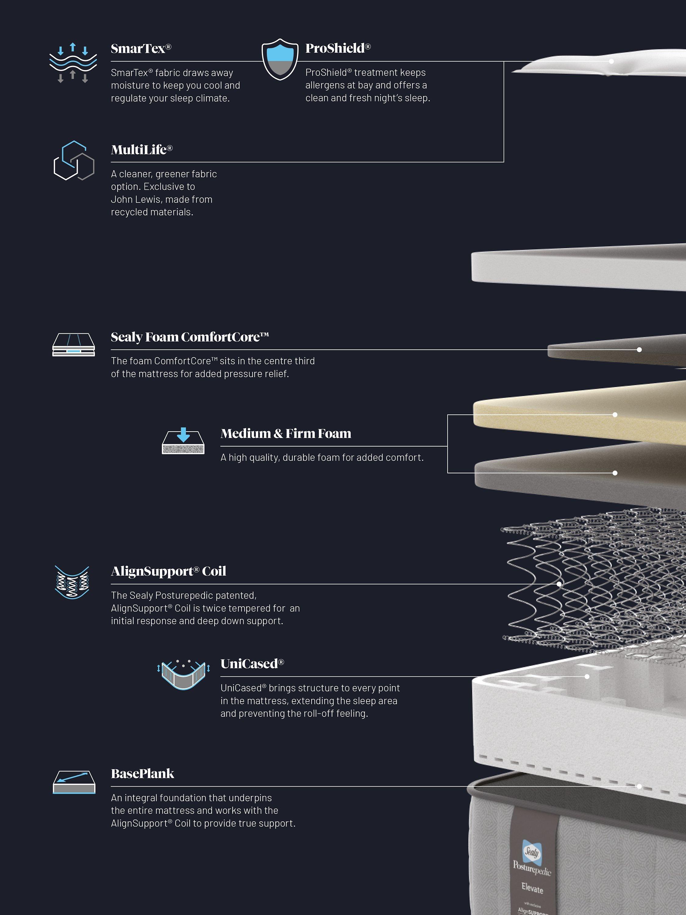 Exclusive to John Lewis, Sealy's MultiLife® fabric features SmarTex® and ProShield® for a clean and comfortable night’s rest. SmarTex® is designed to wick away moisture to regulate your sleep climate, while ProShield® keeps allergens at bay.