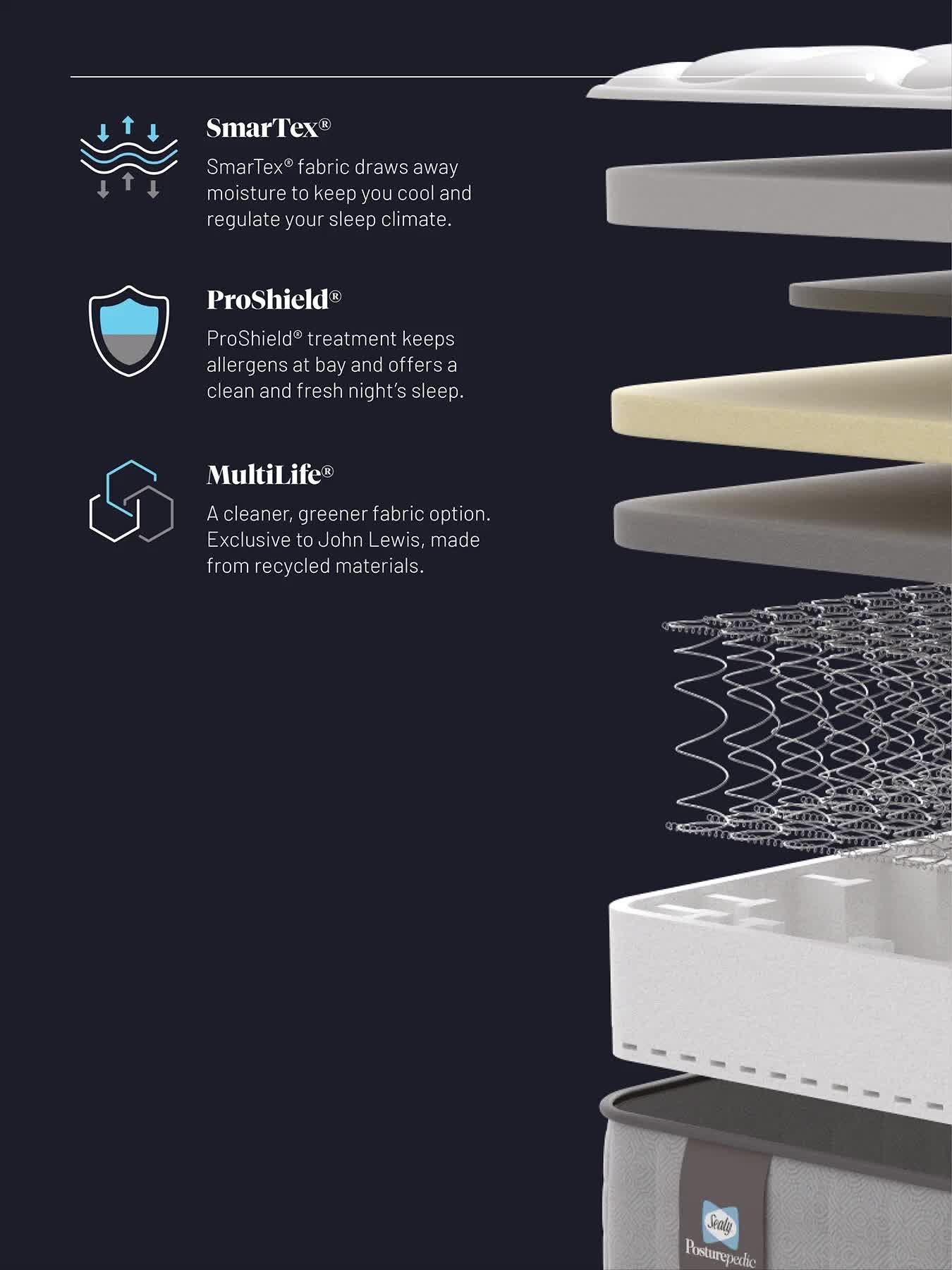 Exclusive to John Lewis, Sealy's MultiLife® fabric features SmarTex® and ProShield® for a clean and comfortable night’s rest. SmarTex® is designed to wick away moisture to regulate your sleep climate, while ProShield® keeps allergens at bay and aims to keep your mattress clean and fresh throughout its lifespan. Plus, it's endorsed by Allergy UK.