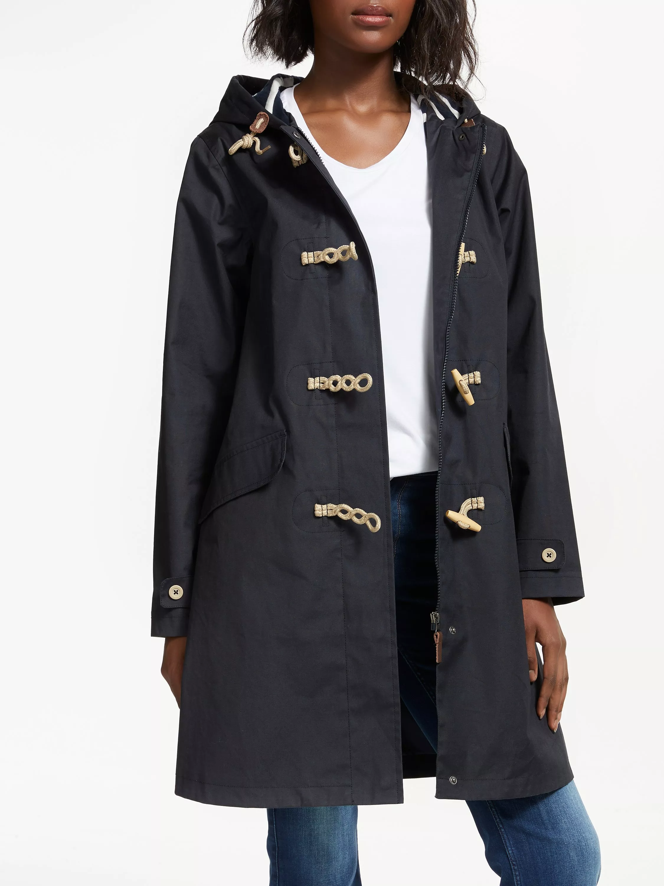 Carefully composed from Tin Cloth® organic cotton, this outerwear essential is fitted across the shoulder with a looser, straight fit through the body. Details include a fixed hood with drawcord fastening, double front flapped pockets, a concealed zip fastening with rope and wood toggle closure, Penzance branded buttons and Breton stripe lining to keep up with the maritime theme.