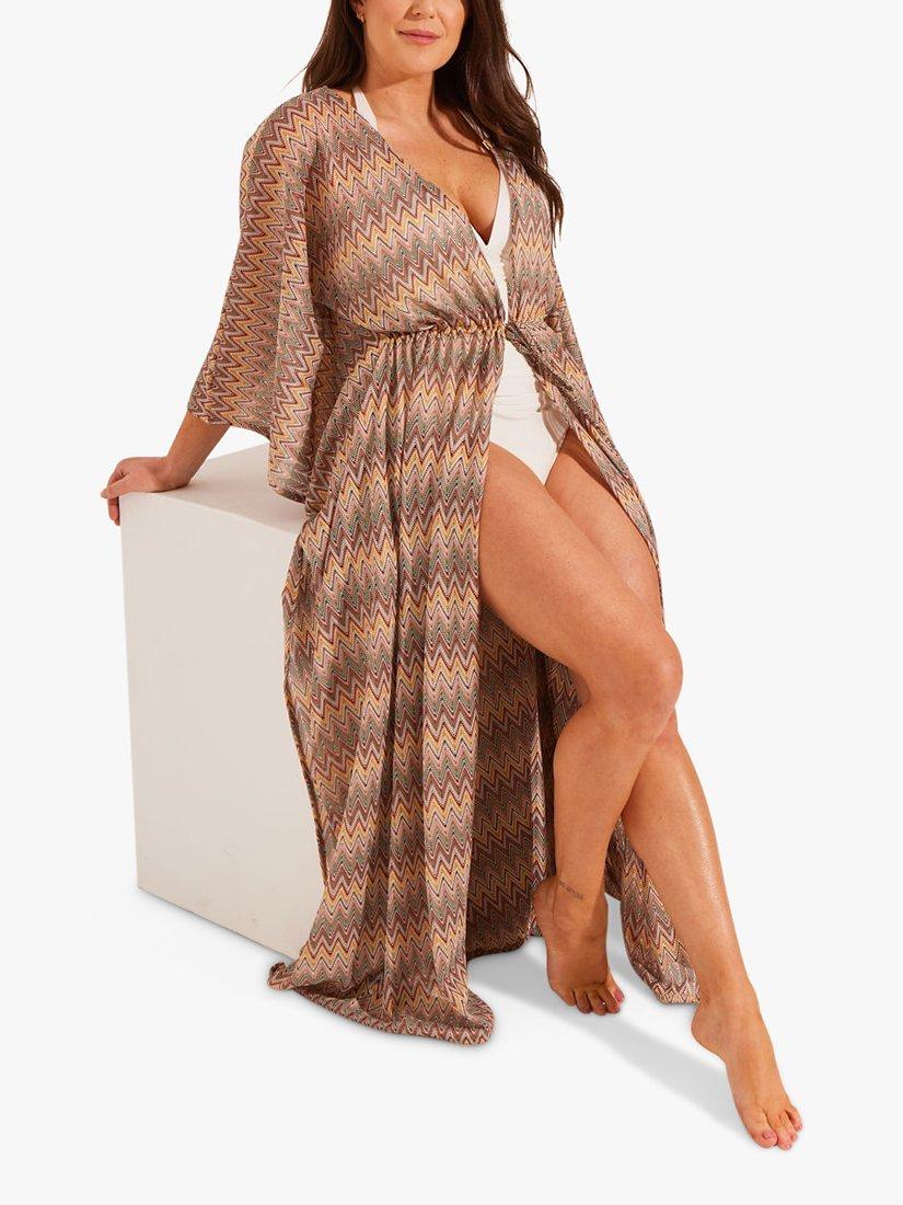 This elegant maxi kaftan will elevate your holiday wardrobe, skimming the frame and falling gently to the ankles. Made from flattering neutral shades, this versatile long length kaftan has a soft tie waist to enhance your figure and a floating silhouette providing sophisticated coverage over your swimwear.