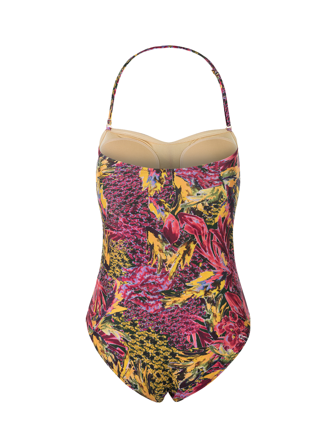 This regular-length swimsuit has a draped design and gathered sides for a flattering and elegant fit. The halter strap is adjustable and there's a non-slip strip to help keep you in place if you choose to remove it for a bandeau look. The bust pads are fixed, yet soft for comfort and you'll stand-out in the sunshine thanks to its vibrant, tropical print.