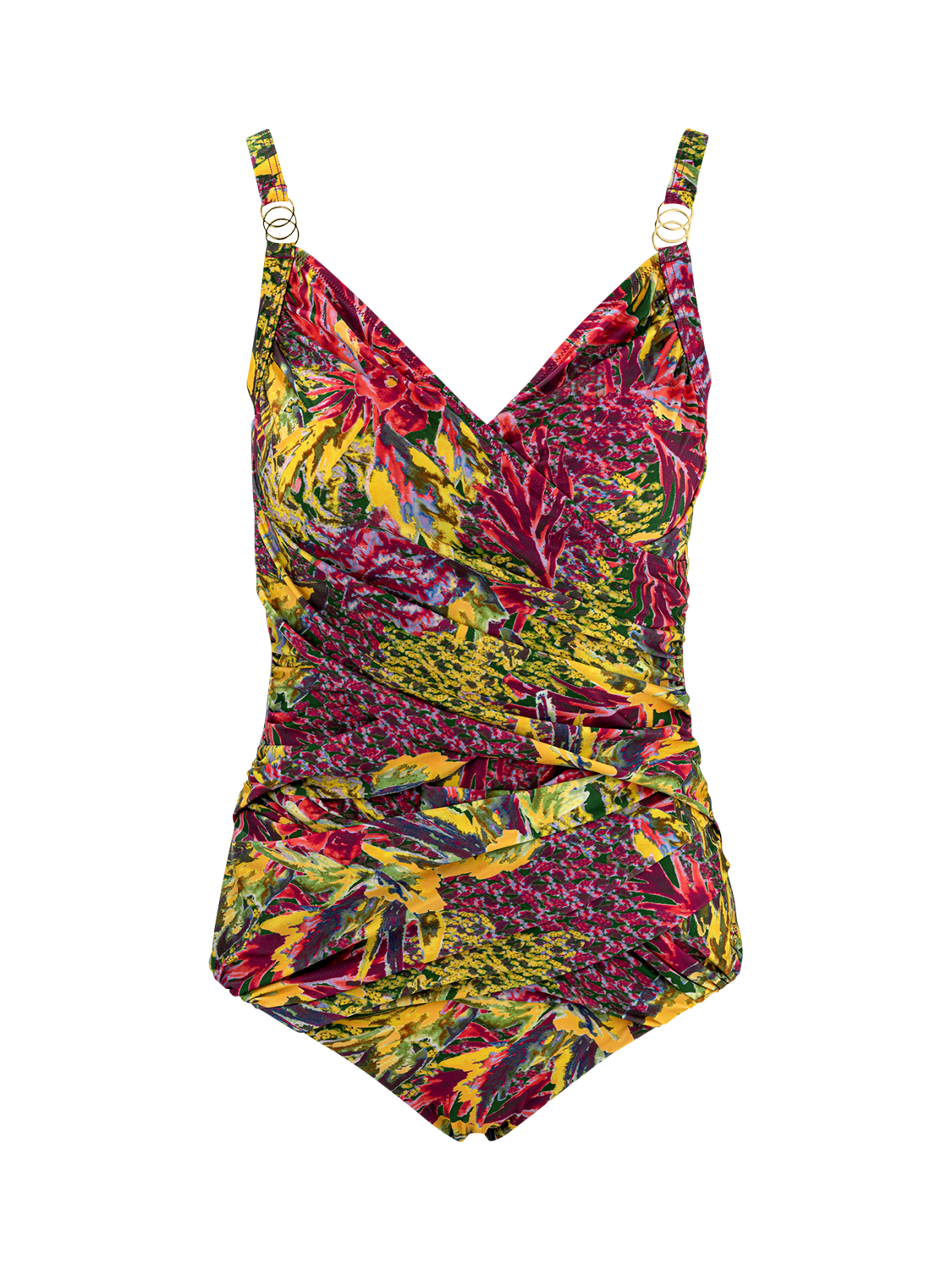 The elegant Aruba double draped swimsuit in its vibrant tropical print in shades of plum and ochre has classic signature tailoring for a flattering fit.