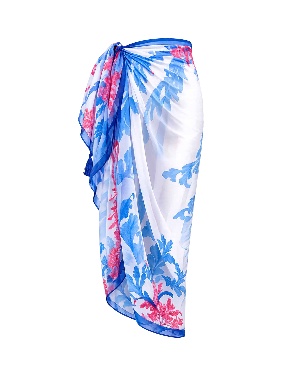 A pareo featuring Grecian shell and coral-inspired accents. Made from super soft chiffon with tassel trim detailing.