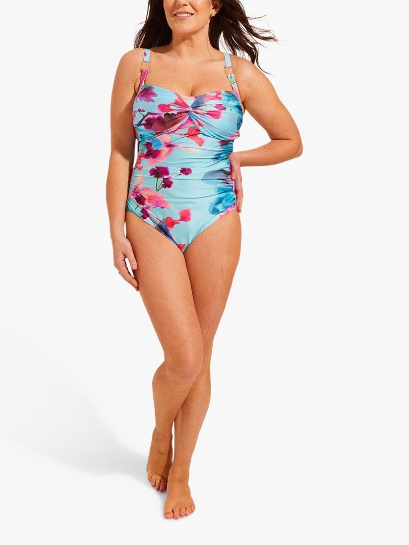 Cut to a longer length, this swimsuit features a flattering twist detail to the bust and gathered detail around the waist. Together with Seaspray's tummy control technology, it creates a flattering and supportive shape. Complete with adjustable straps, gold metal trims and a vibrant floral print.