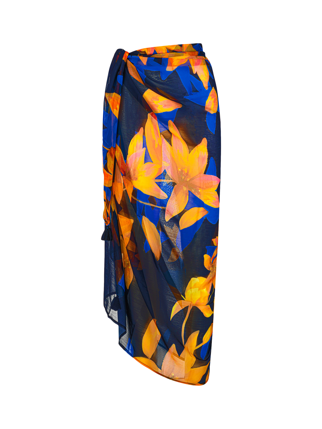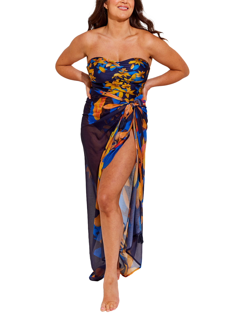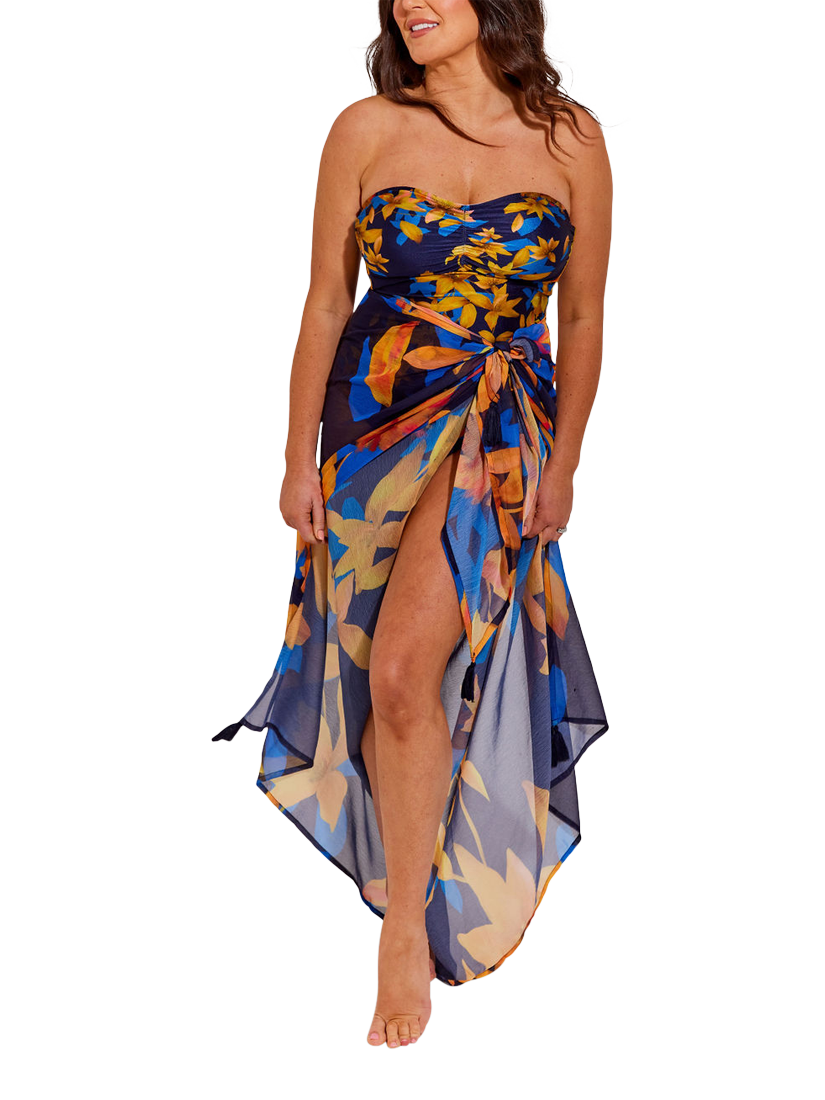 This eye-catching deep blue and golden floral print pareo will brighten any summer holiday look. The Kyoto pareo has chiffon tassel trim detailing and is made with super soft chiffon fabric, the perfect stylish accessory to tie around your waist whilst lounging by the pool or wrap up around you as a dress to go for lunch.