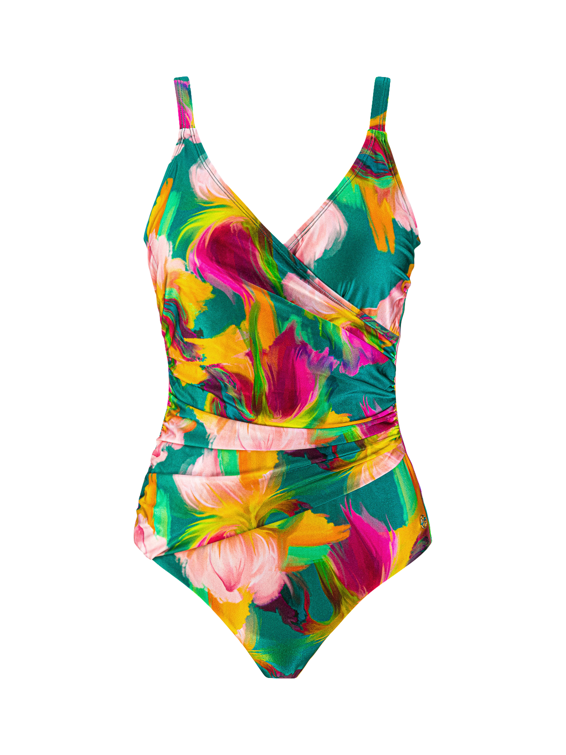 This gorgeous swimsuit exudes elegance with its vibrant tones of emerald green, pink and orange. The flattering wrapped styling is a bestselling shape and a definite holiday triumph. The fabric drapes asymmetrically, creating a sophisticated silhouette.