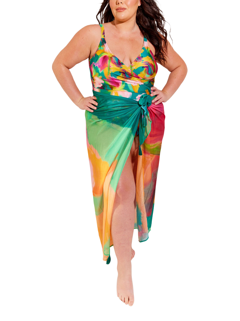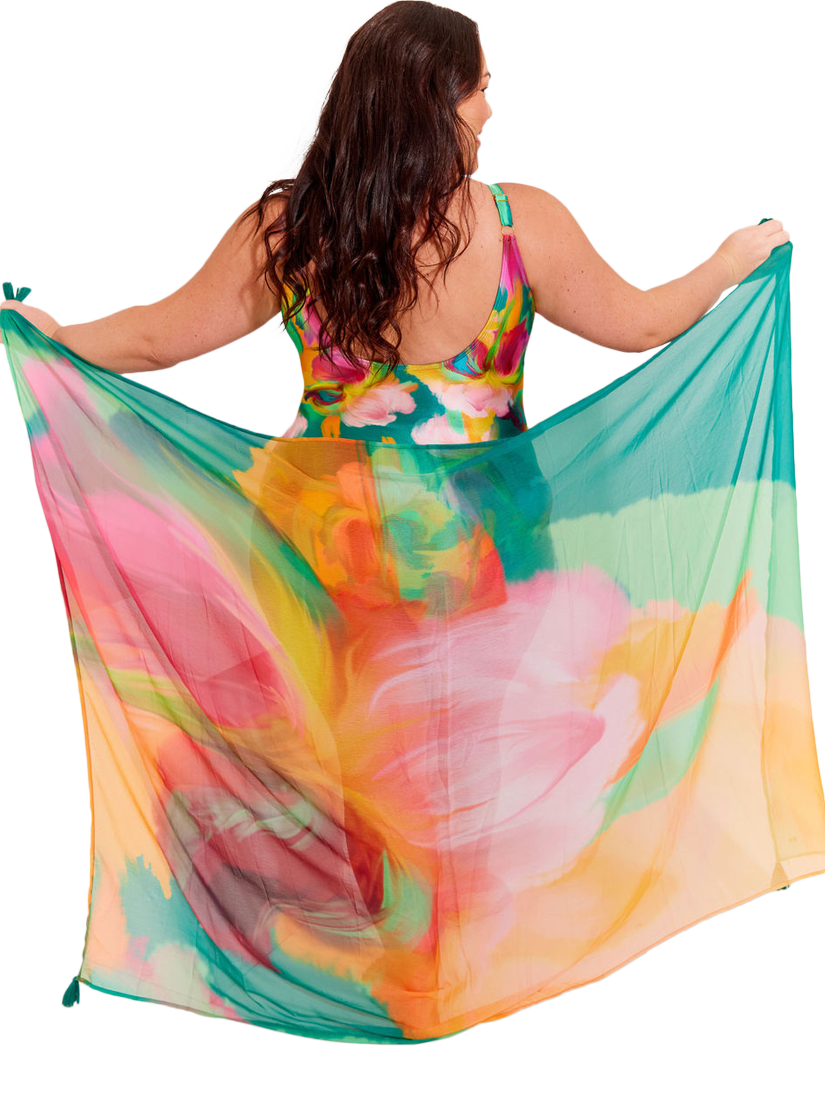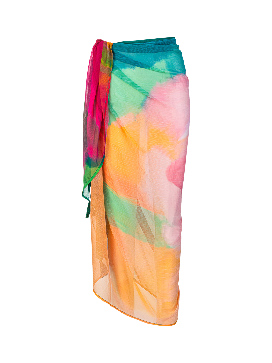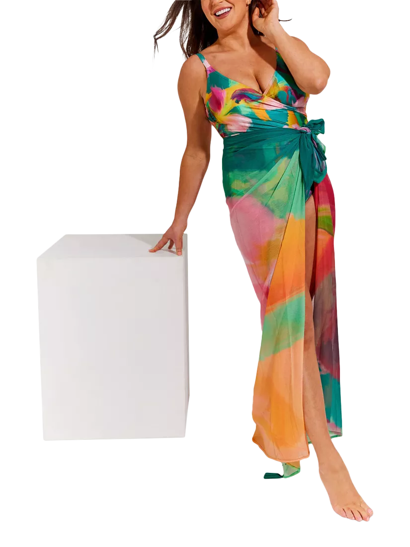 This stunning abstract green, pink and orange watercolour print pareo will brighten any summer holiday look.