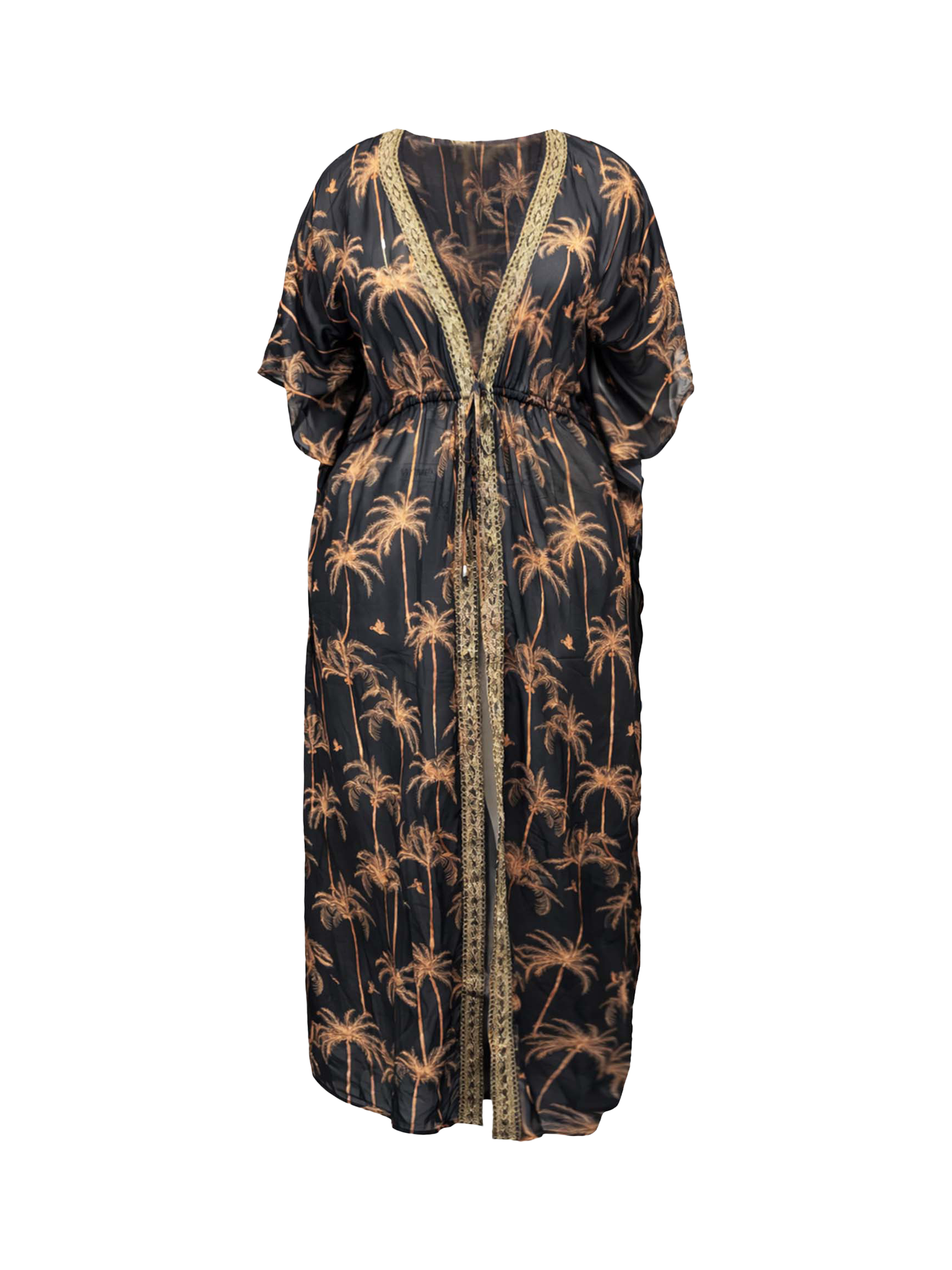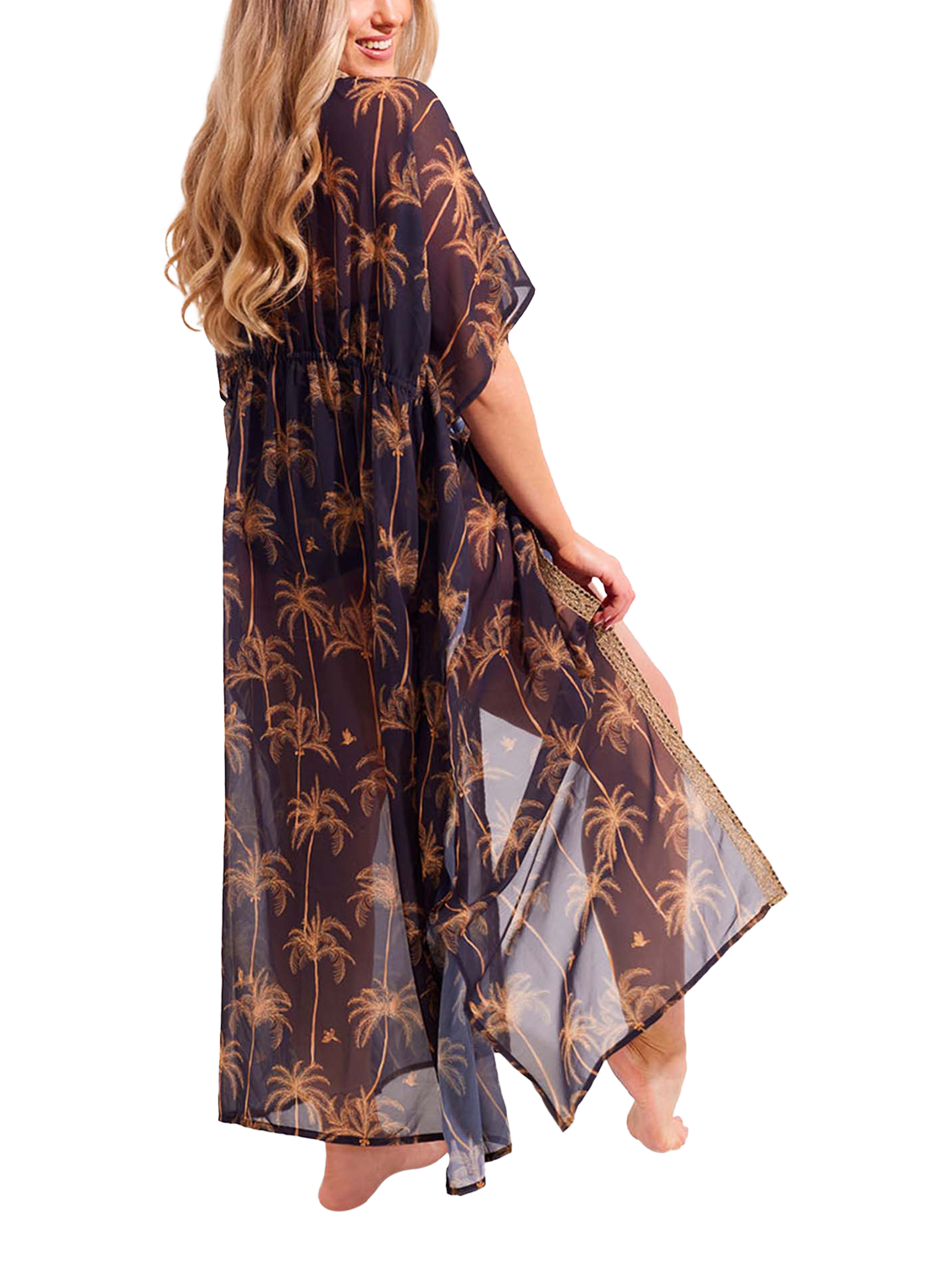 This maxi kaftan has a gentle floating silhouette and is crafted from filmy chiffon in a palm and parrot-inspired print. The flattering maxi length skims the frame and falls to the ankles with luxurious gold trim detailing and a waist drawcord to enhance your figure.