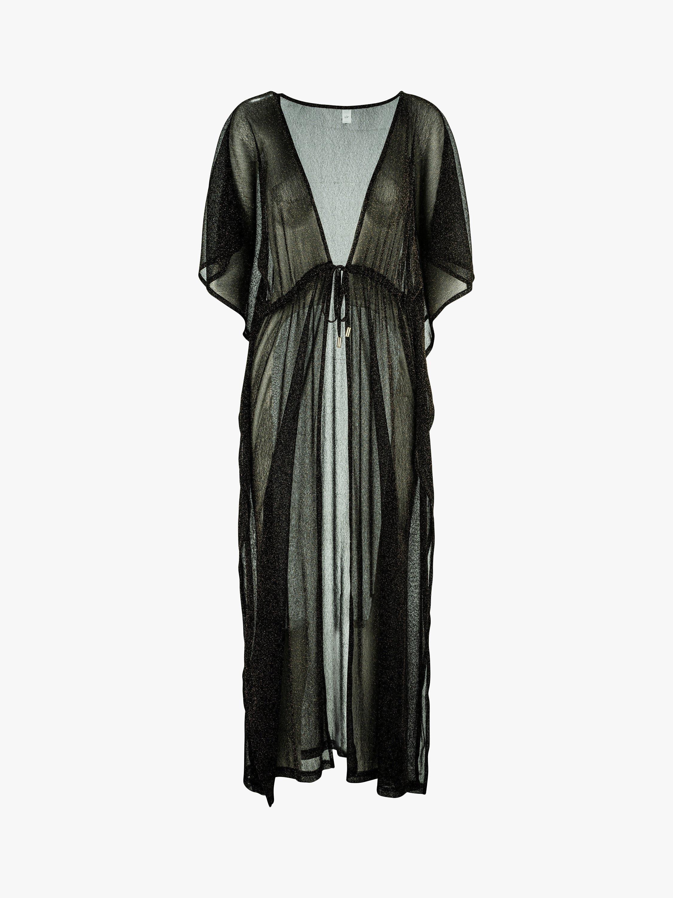A flowing maxi silhouette with an alluring shimmer, this sparkle-infused kaftan is perfect for soaking up the sun. The ankle-sweeping length provides sophisticated coverage.