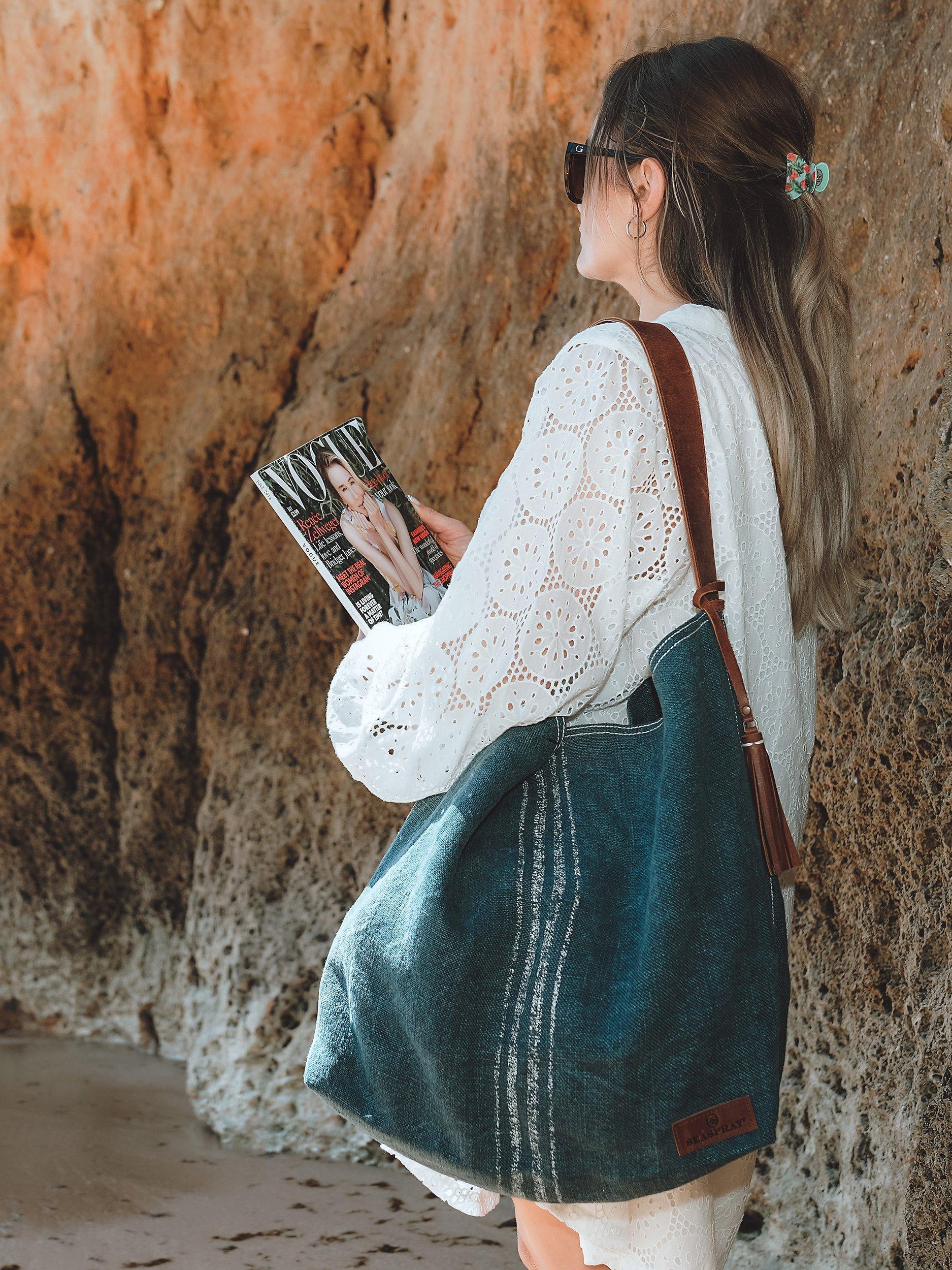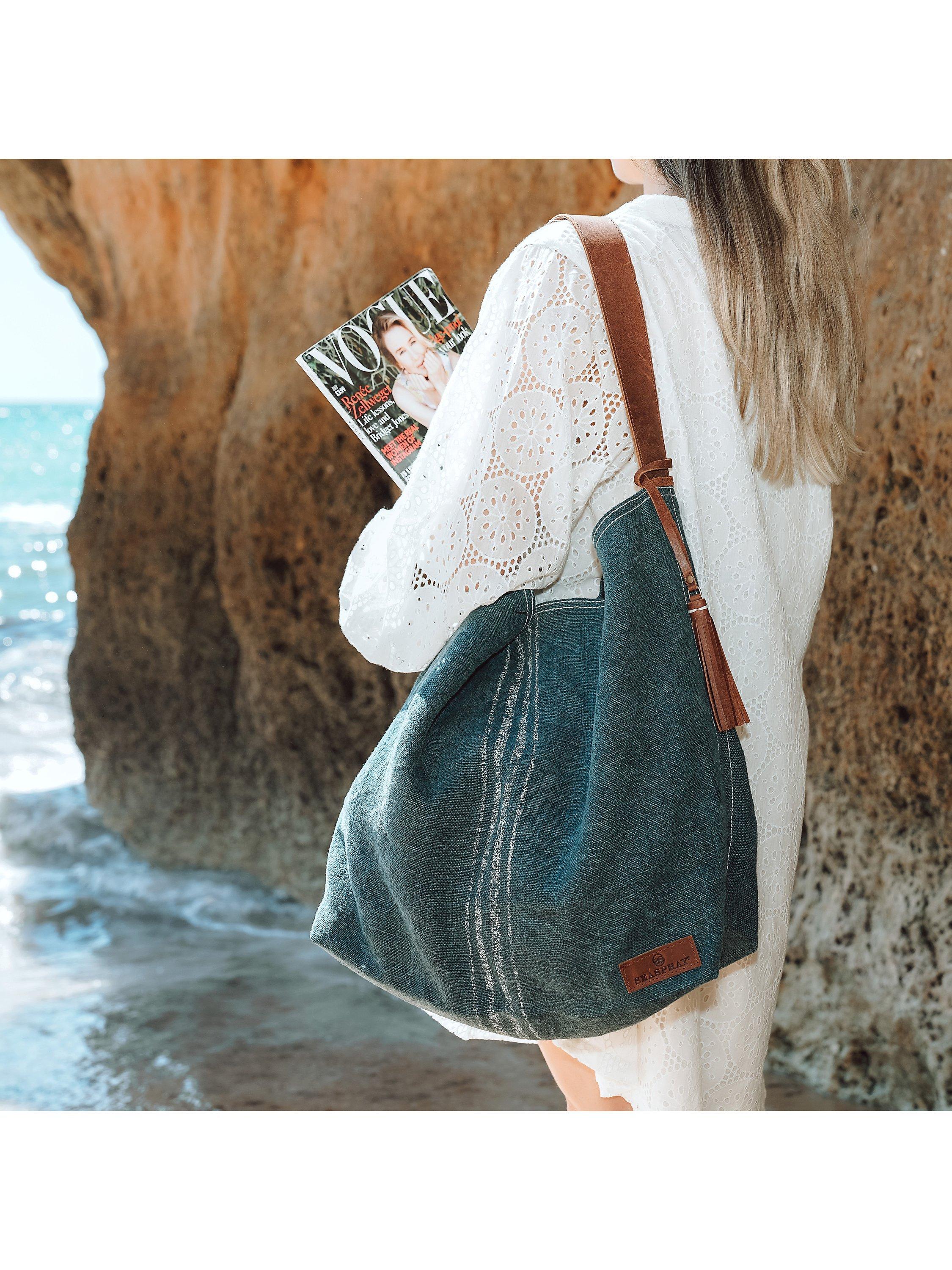 This oversized beach bag is perfect for packing all your supplies for a day at the beach whilst looking stylish and chic too. Made from 100% natural jute fabric with a 100% cotton lining, it has a metal magnetic fastening and an inside zip pocket. The smaller bag has a zip fastening and leather handle and can be used as a purse inside the main bag or as a stand-alone purse.