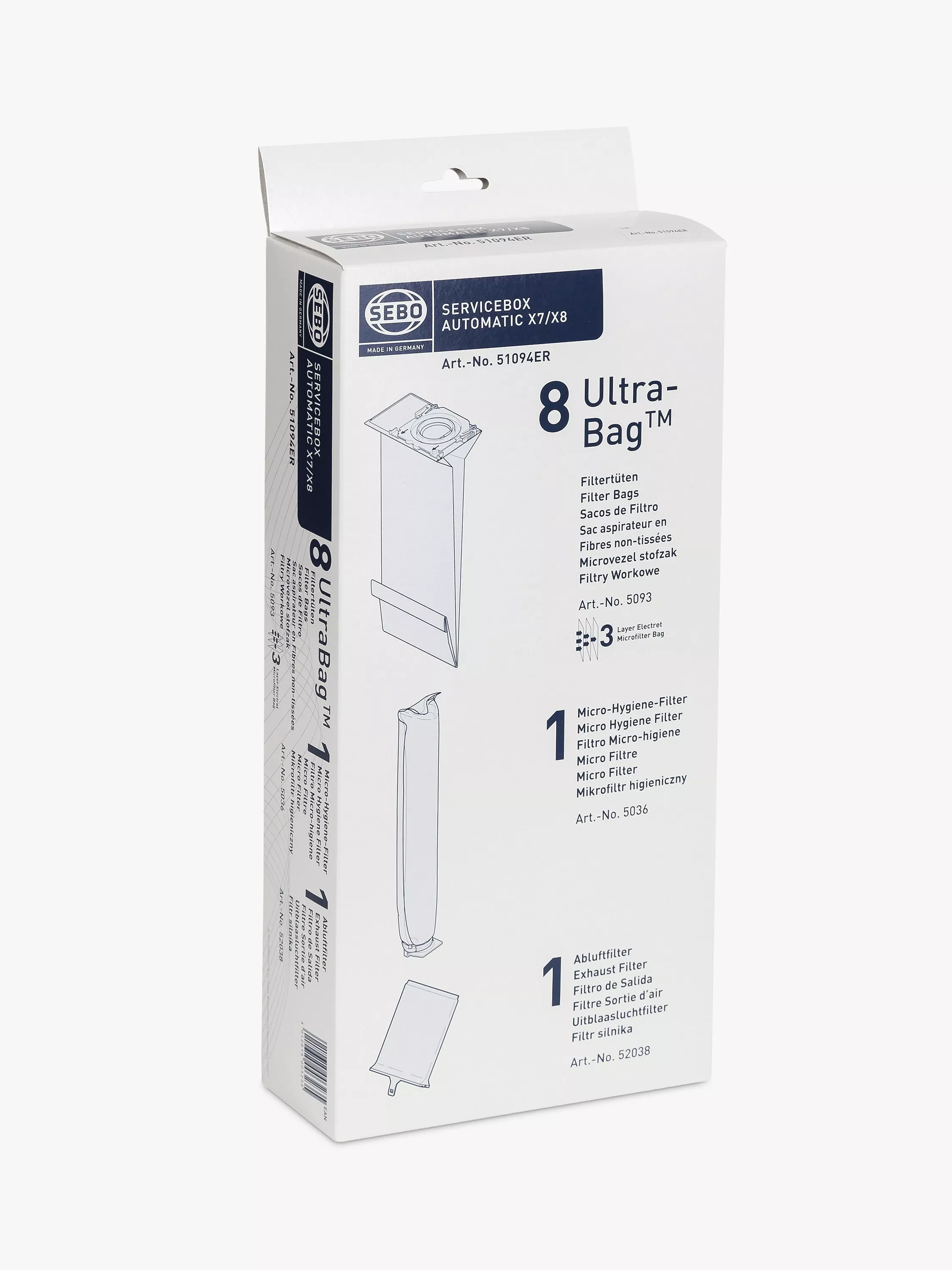 The SEBO 51094ER X7/X8 series upright service box contains 8 Ultra-Bags bags, a 5036ER microfilter and a 52038ER exhaust filter.