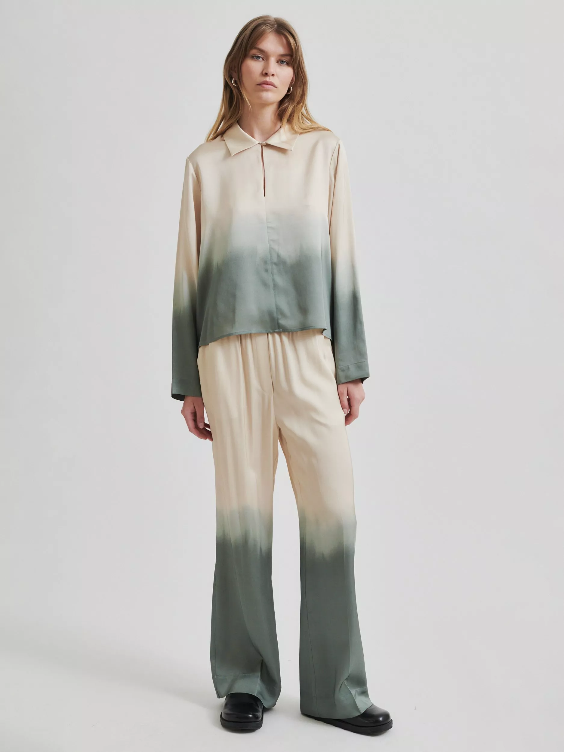 The blouse is made in a silky-soft and drapy viscose fabric with dip-dye pattern. Featuring a regular collar and open neck with button and loop fastening at the top. Long sleeves with wide cuffs. Gathers at back yoke. Wide, straight fit.