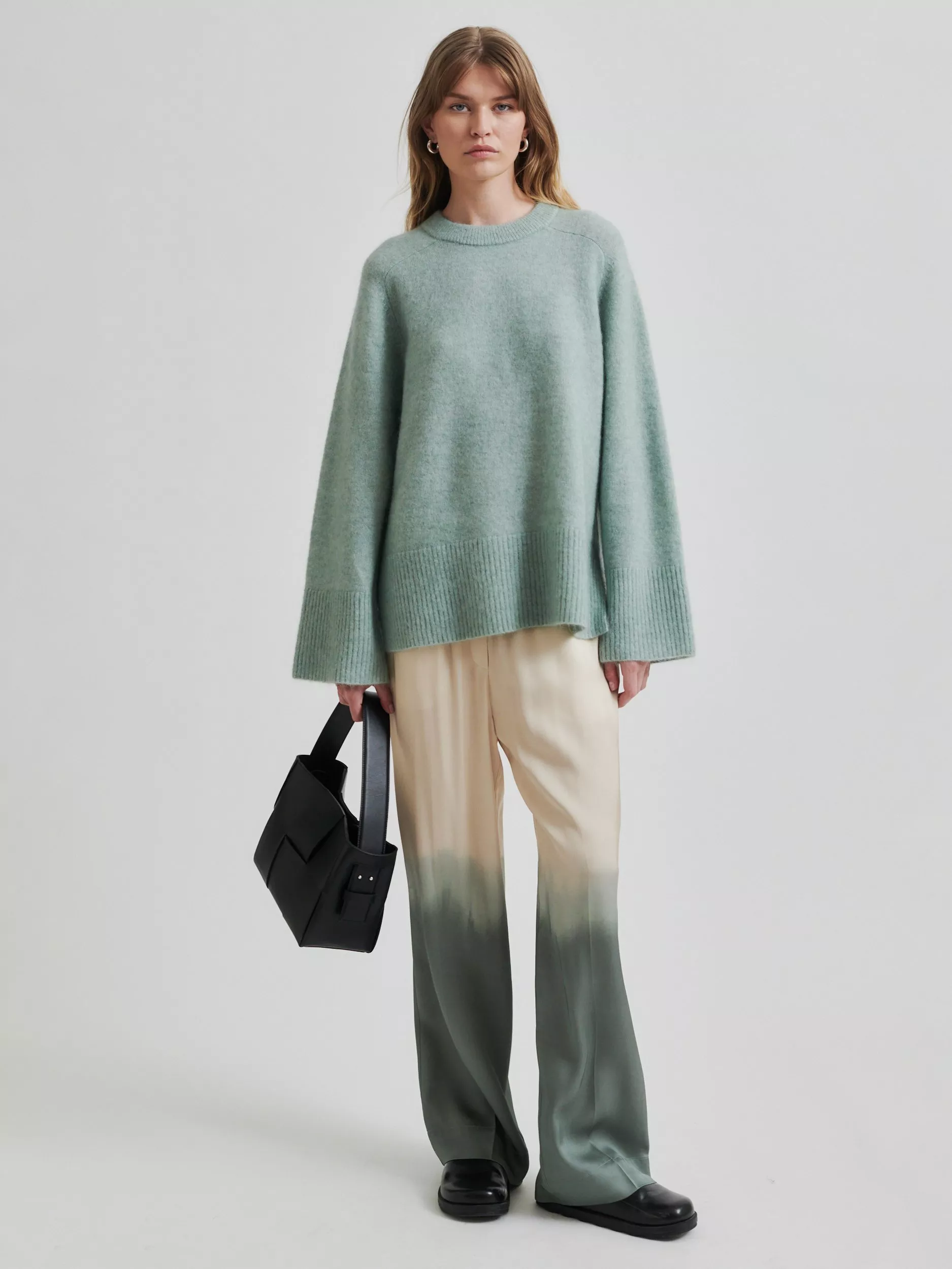 The trousers are made in light and smooth fabric with an ombre pattern. Featuring a covered elasticated waistband. Two slanted pockets at the front. Wide bottom hem. Mid waist with relaxed, straight leg.
