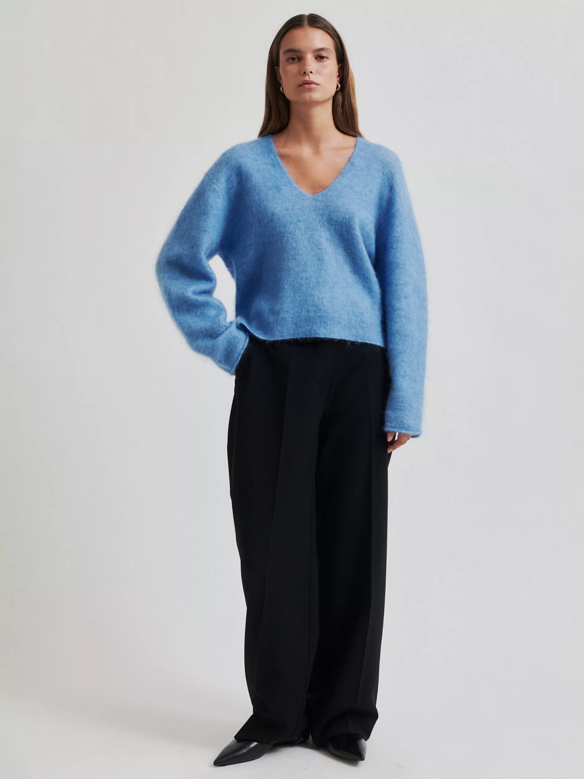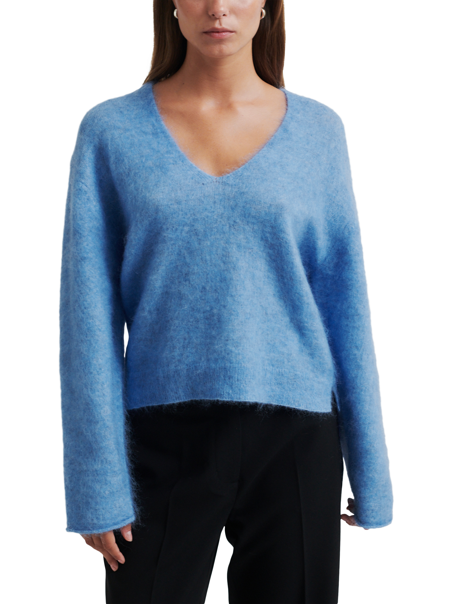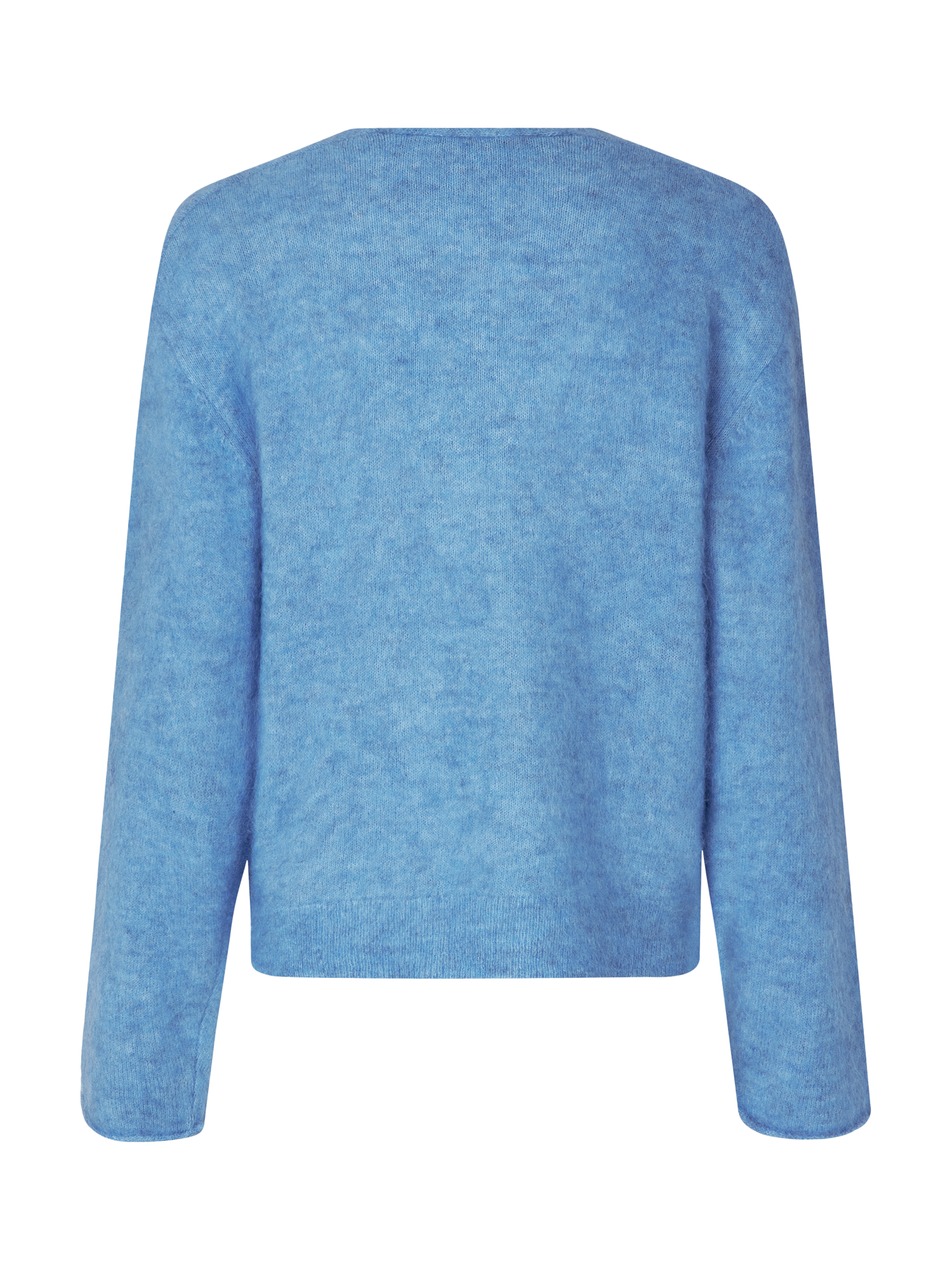 The pullover is made in a soft and stretchy mohair blend with a fluffy quality. Featuring a V-neckline and dropped shoulders with long sleeves. Rolled cuffs and ribbed bottom hem. Small slits at sides. Relaxed fit.