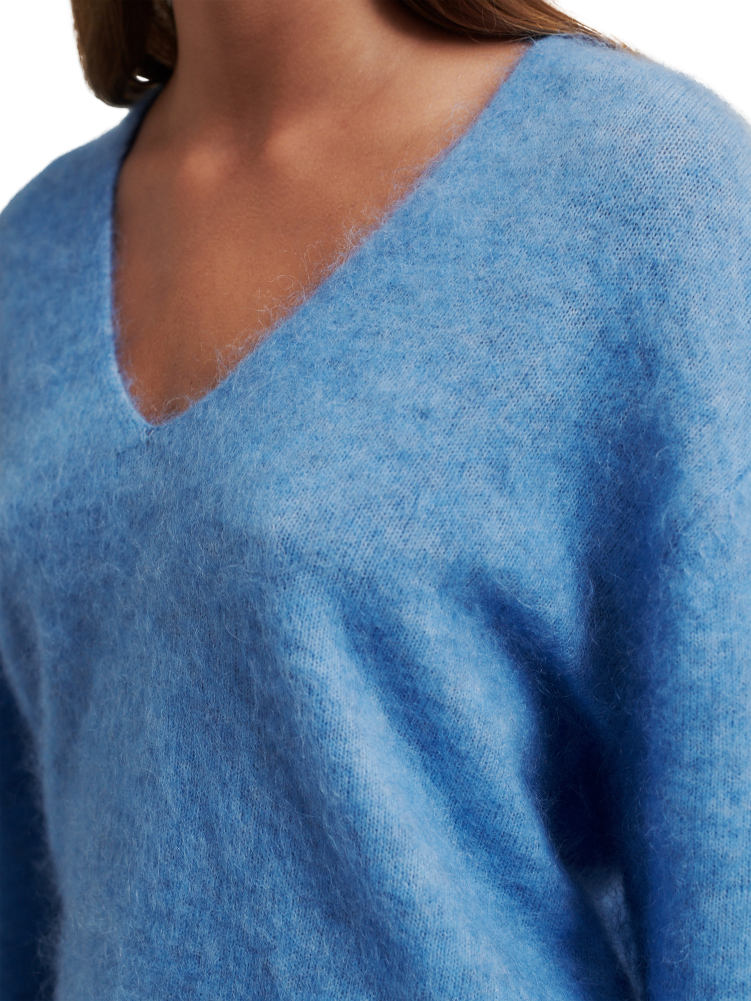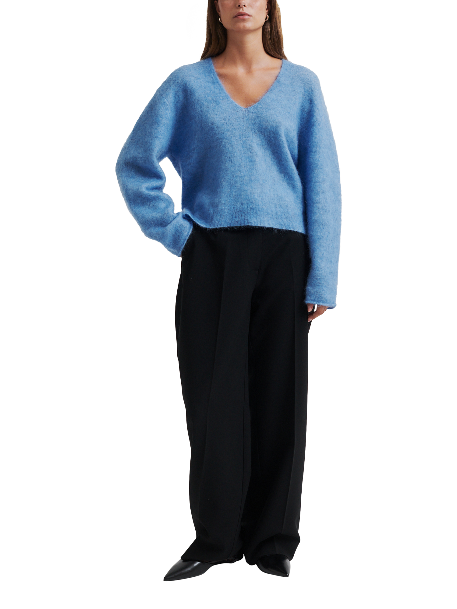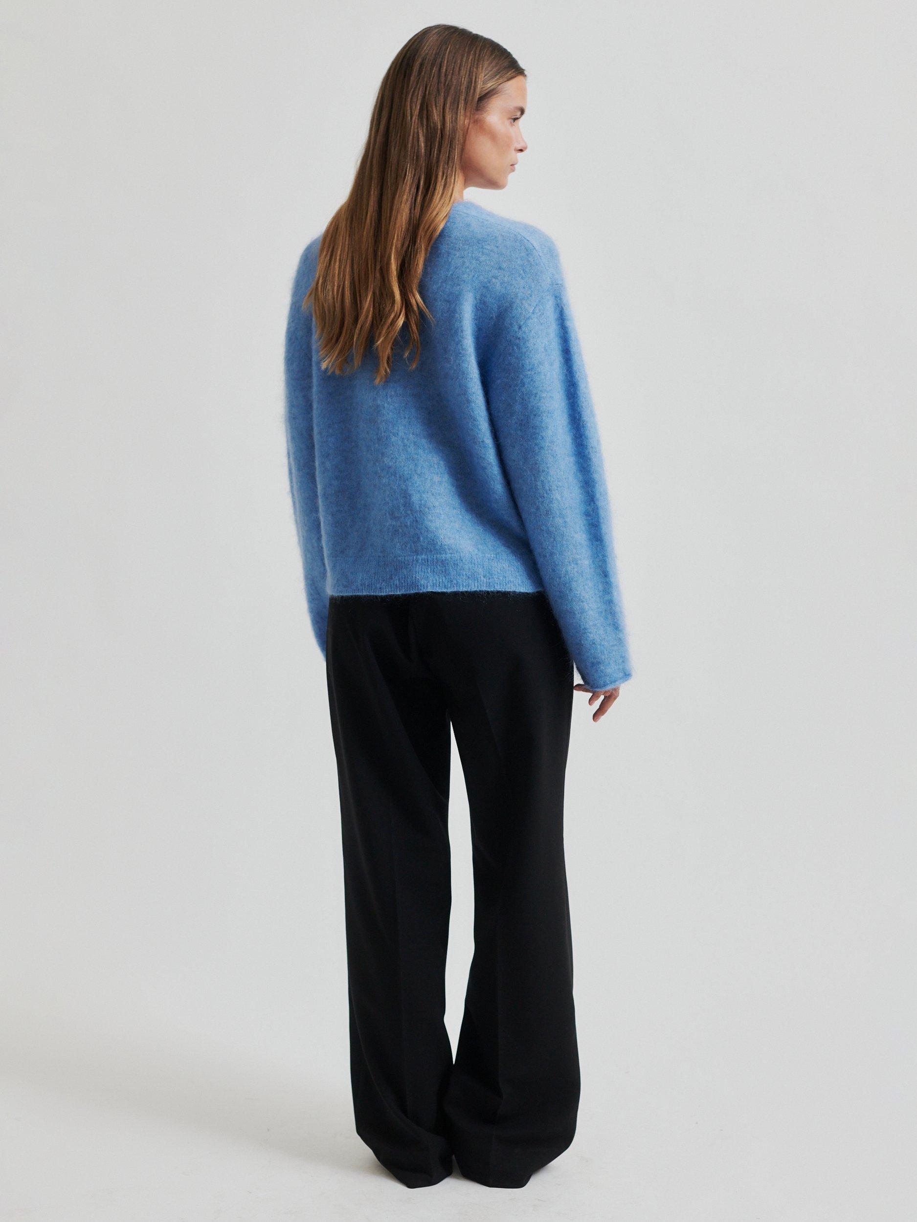 The pullover is made in a soft and stretchy mohair blend with a fluffy quality. Featuring a V-neckline and dropped shoulders with long sleeves. Rolled cuffs and ribbed bottom hem. Small slits at sides. Relaxed fit.