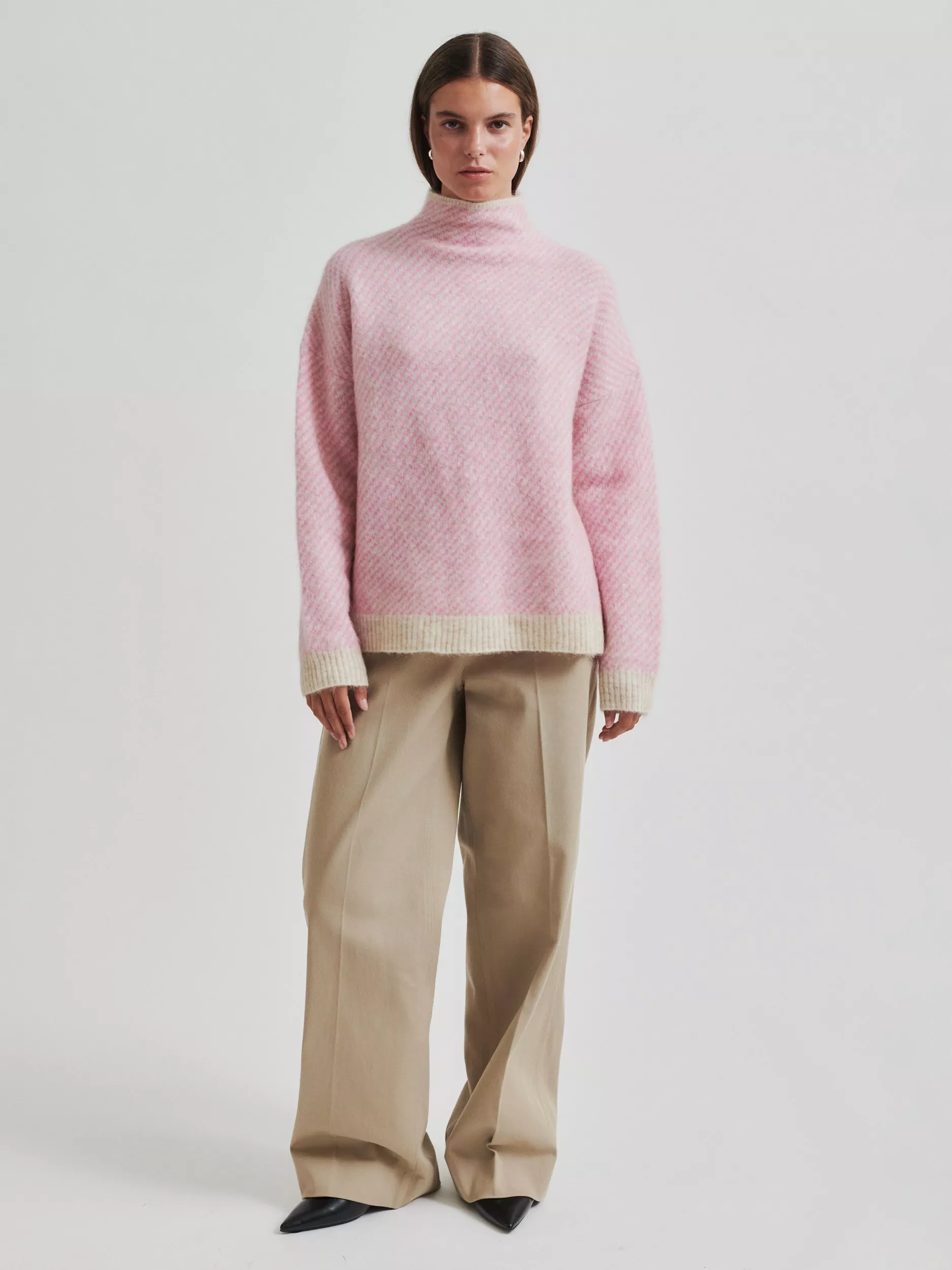 The pullover is made in a soft and stretchy wool blend with an all-over knitted diagonal pattern. Featuring a contrast trim at the neck, cuffs and bottom hem. Dropped shoulders with long sleeves. Loose and wide fit.