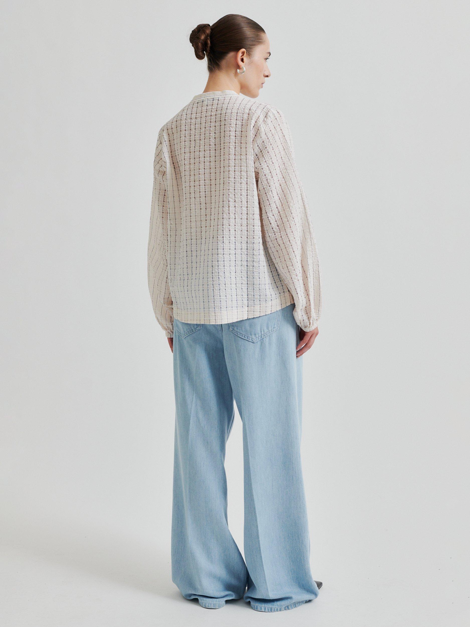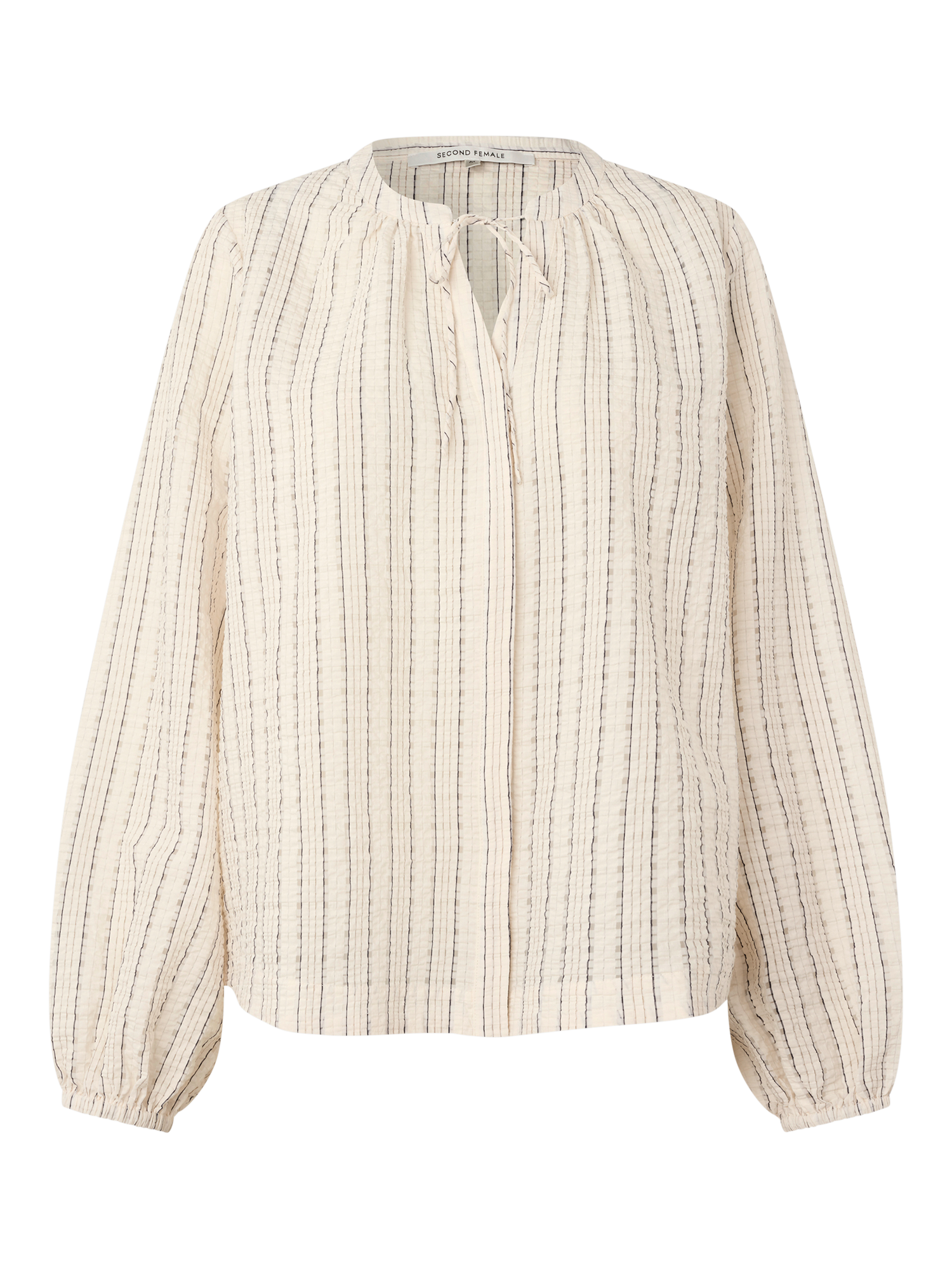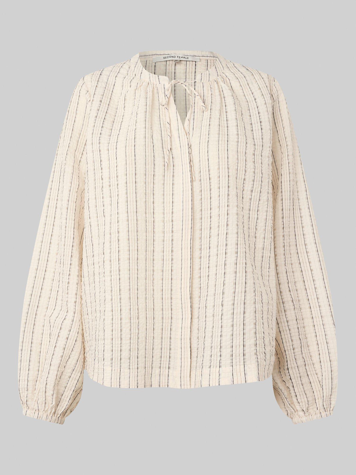 Second Female blouse with neck ties. The blouse is made in light, semi-sheer viscose blend with a slight seersucker texture. Featuring an open neckline with ties at the top and placket with concealed button fastening. Long sleeves with elasticated cuffs. Straight bottom hem. Loose and straight fit.