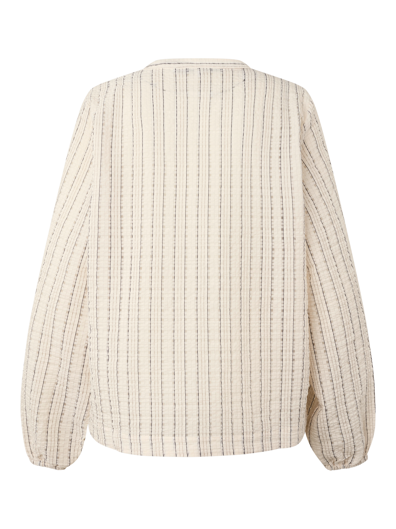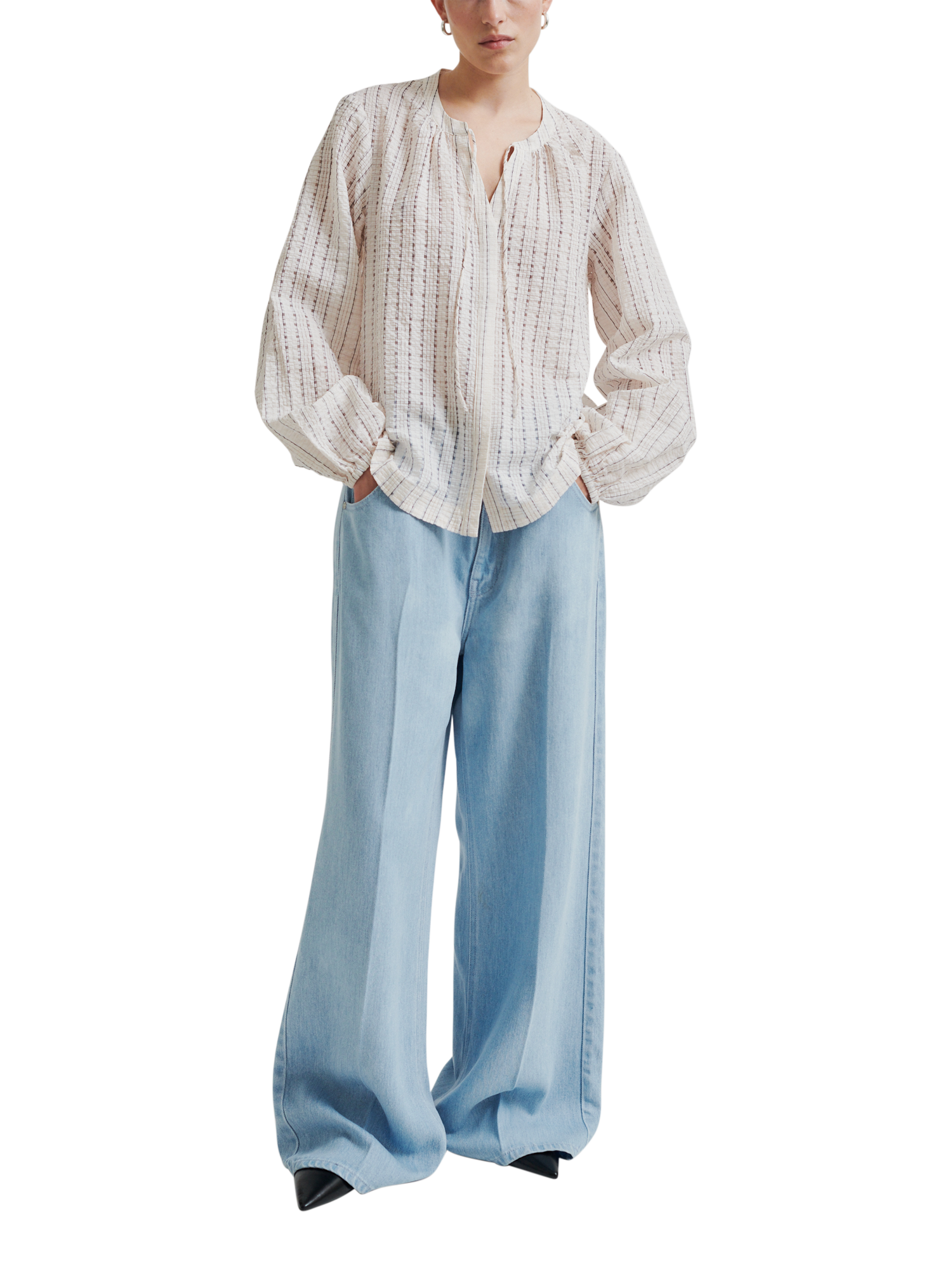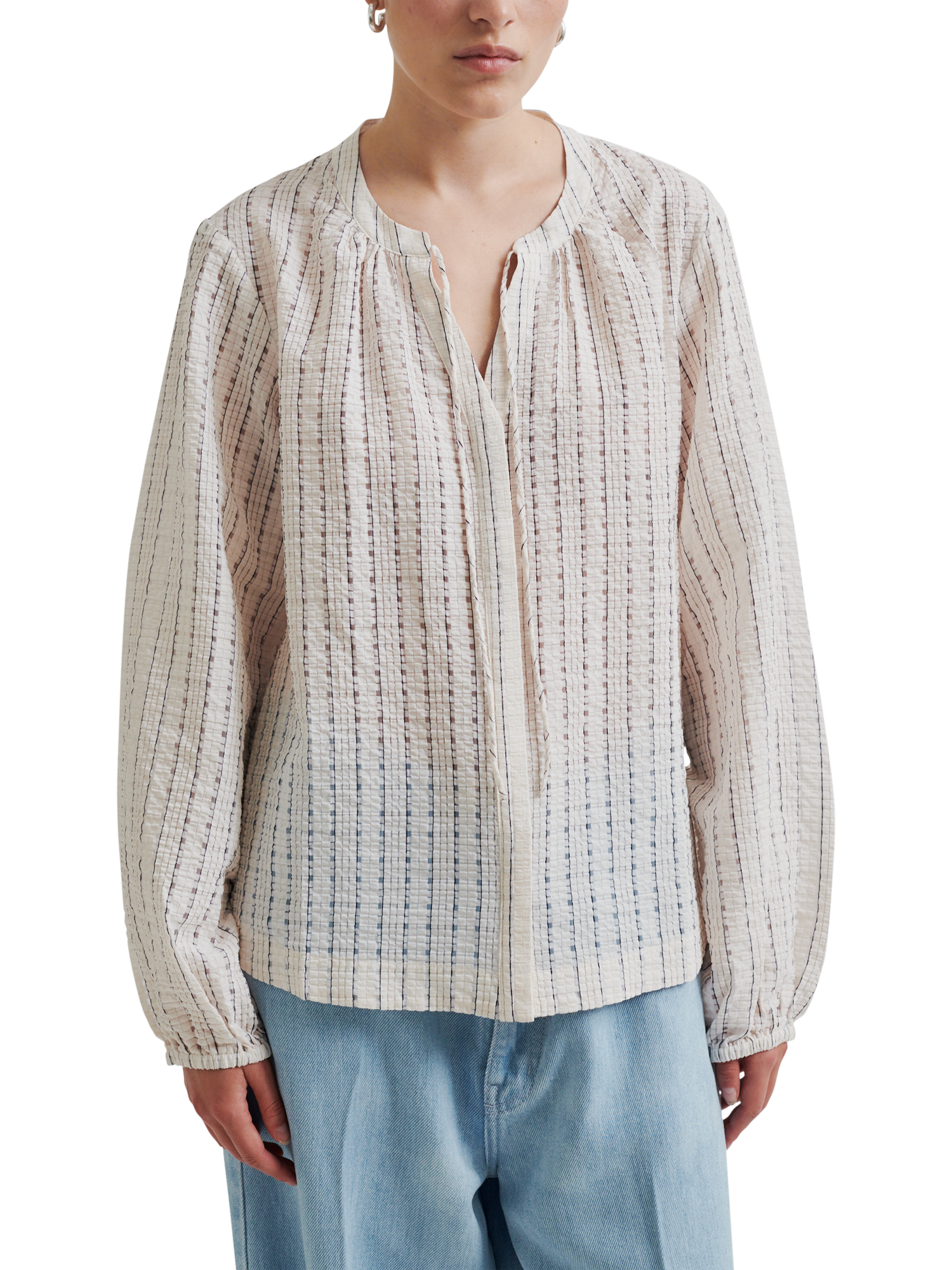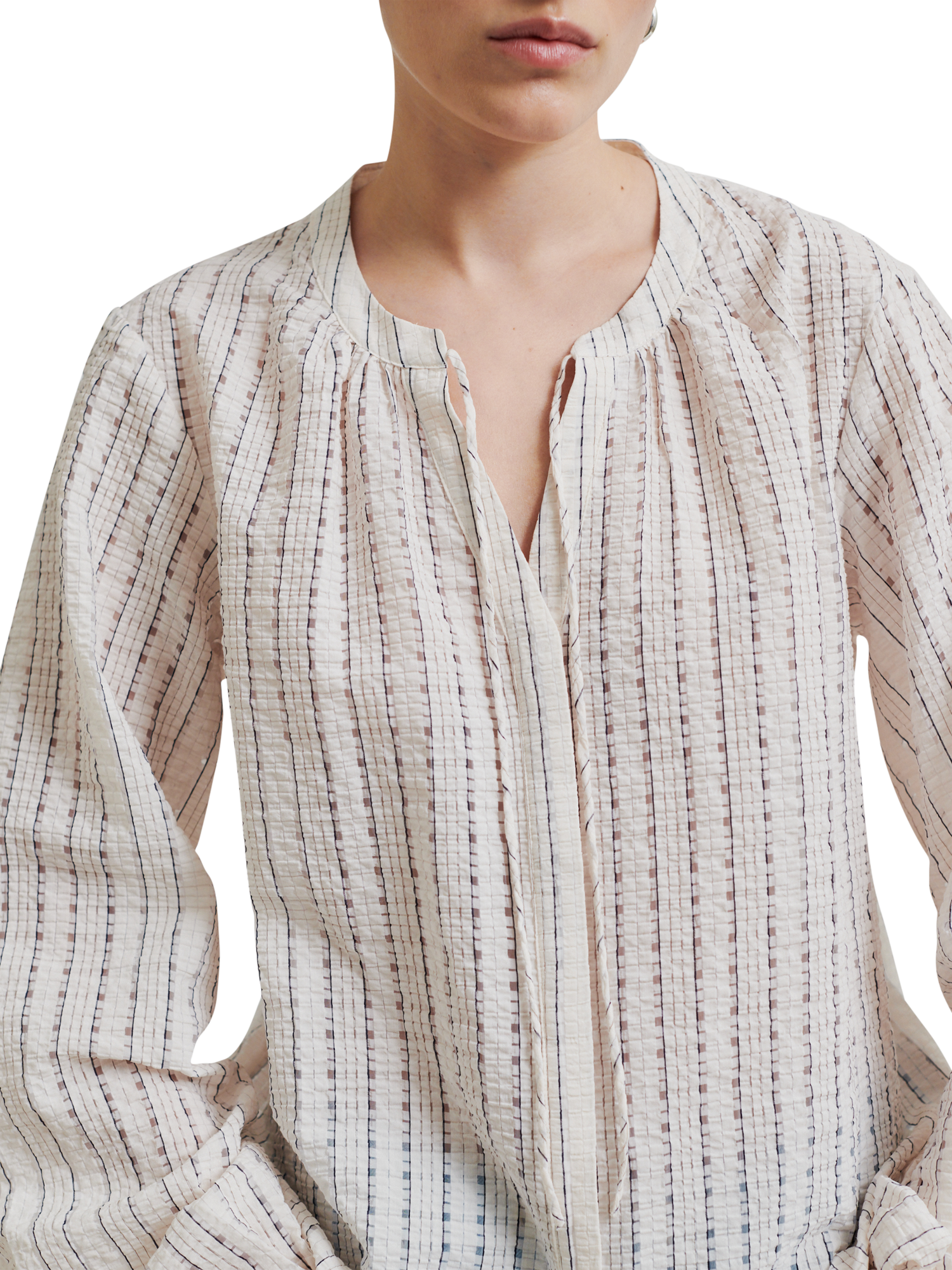 Second Female blouse with neck ties. The blouse is made in light, semi-sheer viscose blend with a slight seersucker texture. Featuring an open neckline with ties at the top and placket with concealed button fastening. Long sleeves with elasticated cuffs. Straight bottom hem. Loose and straight fit.