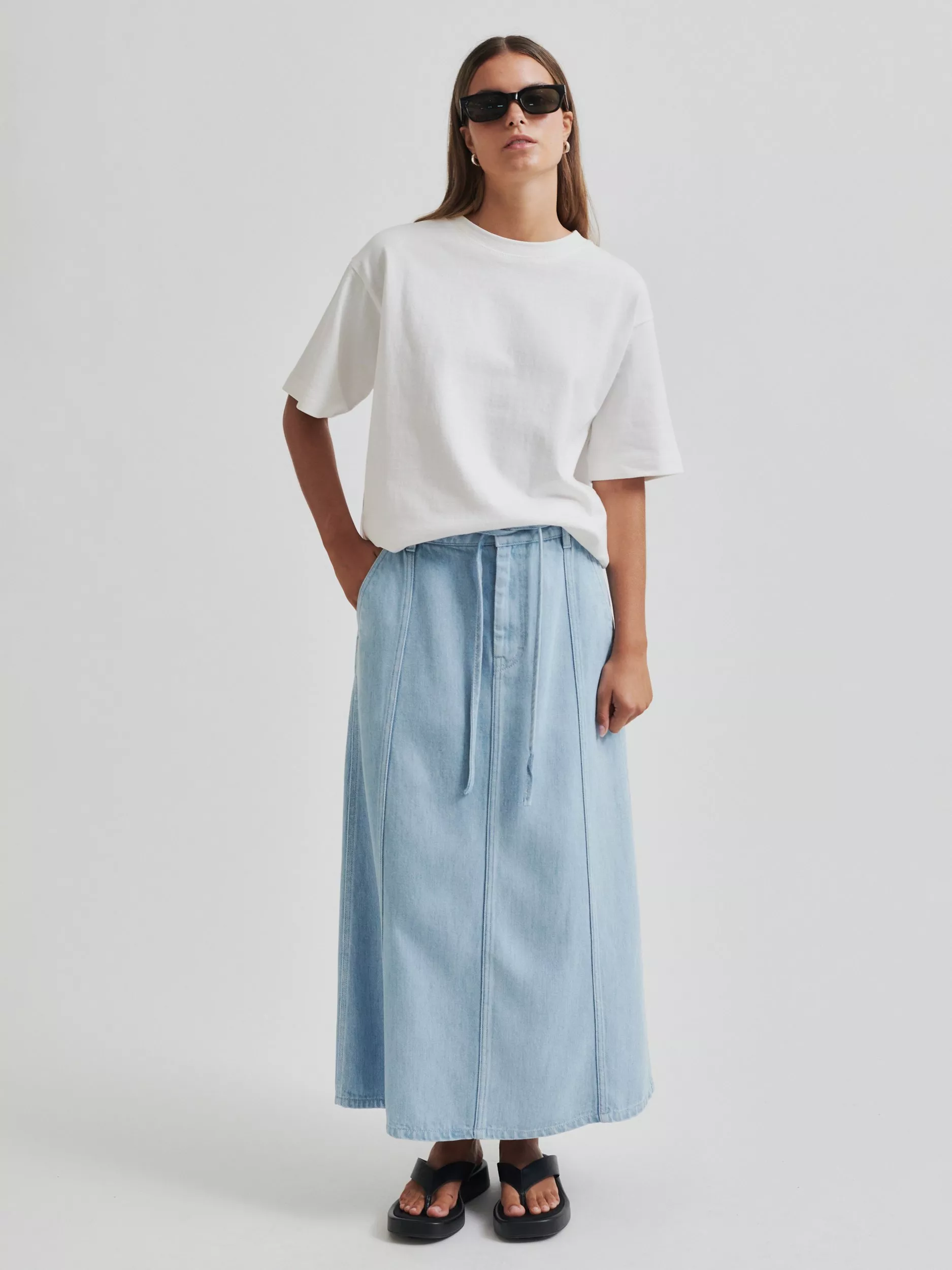 The skirt is made in soft and drapy lyocell denim with tonal stitching. Featuring a concealed zip, hook and button fastening inside waistband. Fabric tie belt at waist. Two slanted pockets. Shaped yoke at back. Fitted seams at back. Slim fit with slight A-shape.