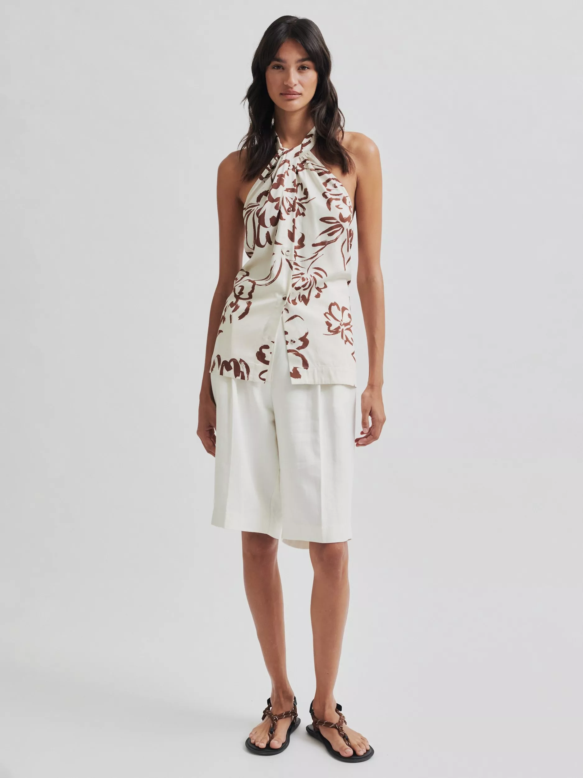 Second Female pleated shorts. These straight-cut shorts are made from a linen-blend fabric, featuring a concealed zip, hook-and-button closure and pleated details at the waist. Finished with two slanted pockets at the front and two decorative pockets at the back.